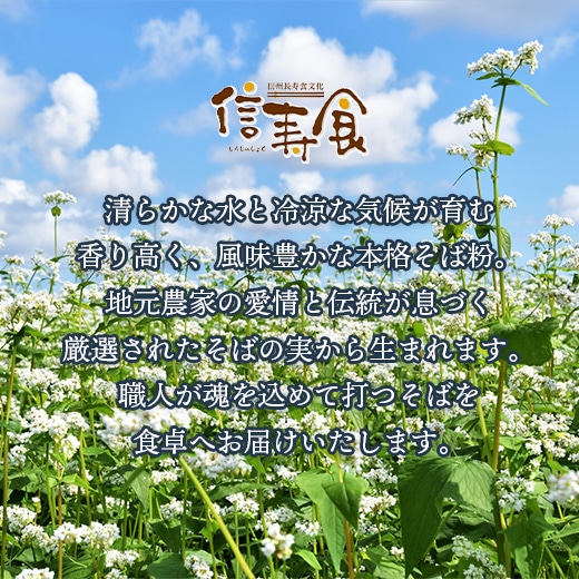 まるで信州のそば屋の打ち立てそば信寿食のそばは、そばの味と香りがしっかりと感じられる、信州田舎そばです。こね・延し・切りを職人が短時間で仕上げ、打ちたてをすぐに袋詰め・冷凍することにより打ちたてのままの鮮度を実現しました。また、保存料や化学調味料は一切使用せず、のど越し、香り、食感のバランスが最も優れている二八そばに仕上げました。