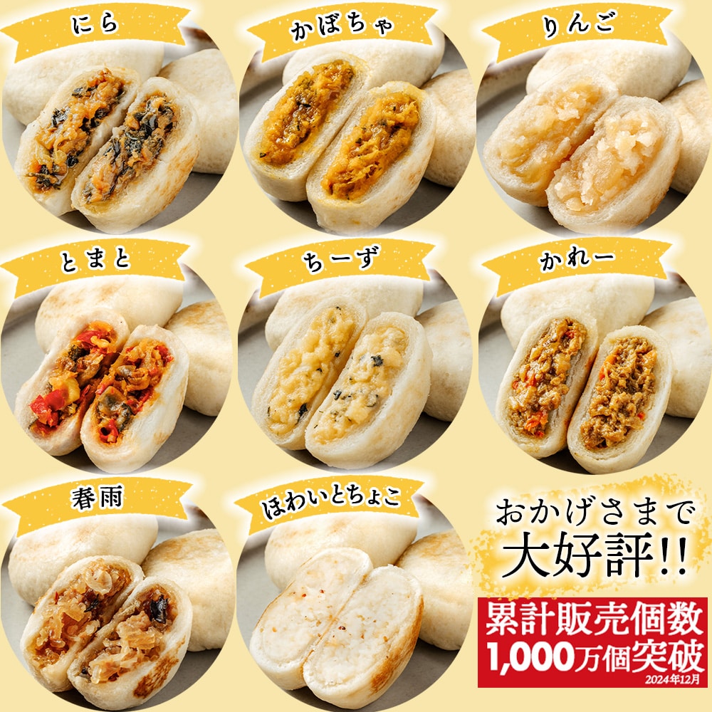 具はスタンダードな9種に、新しい感覚の6種を加えた全15種類。ちょうどいい大きさで、いろんな味を楽しめる、自宅用にもプレゼントにもぴったりの欲張りなおやきです。
