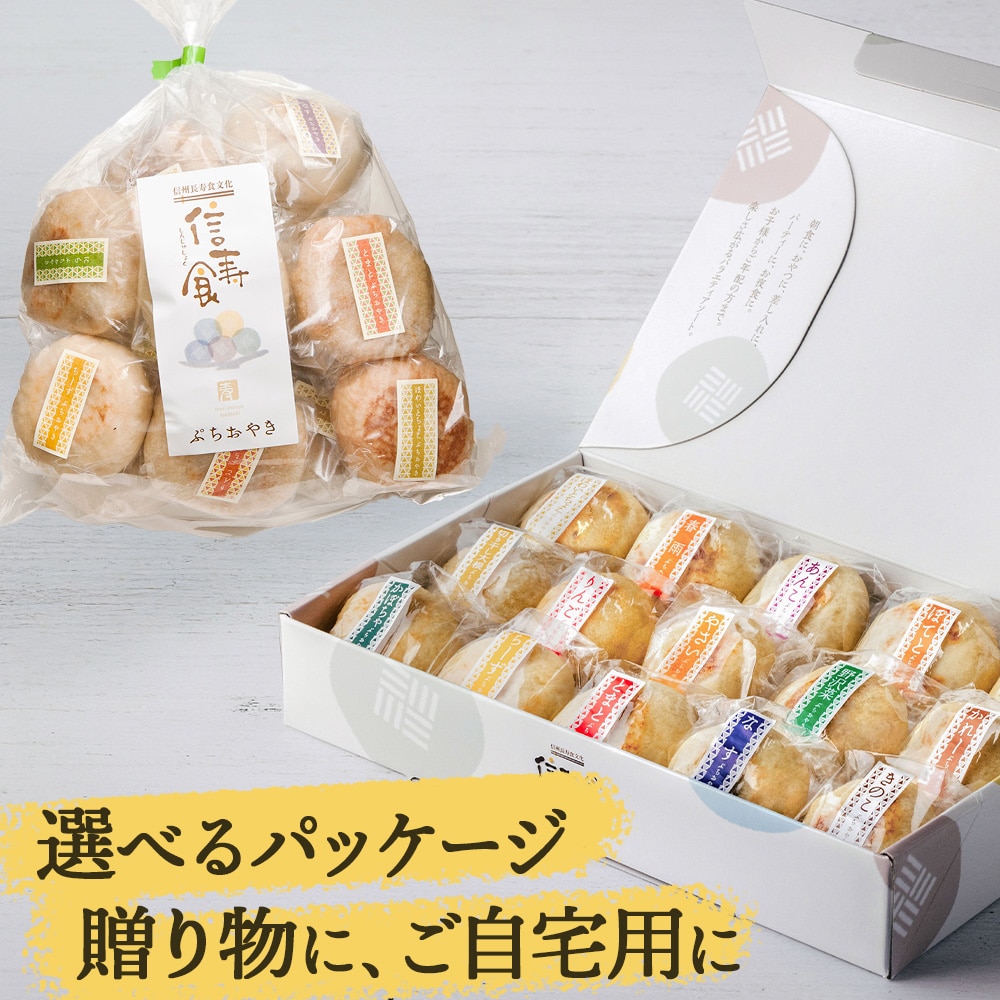昔ながらのおやきの製法を守りながら食べやすい小さ目サイズに仕上げた「ぷちおやき」こんがり香ばしい焼きタイプです。