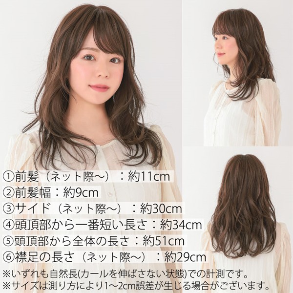 【商品詳細】 商品名: アクアドール ヴィーナス フロウロング[pw110] 商品説明: 立体感や動きを出して、ぐっと表情豊かにすることができるミックスカール。 無造作なのにトレンド感のあるゆるいカールで落ち着いた大人女性の印象に。 前髪は横に流せる長さで、ほどよい抜け感がこのスタイルにぴったりです。 たっぷりレイヤーが入っているので、髪に動きが生まれて柔らかいナチュラル感を演出してくれます。 また、顔まわりにも入れることで、髪が顔の輪郭を隠してくれて小顔効果に。 アクアドールヴィーナスは一本一本丁寧に手作業で毛を植えているから、ソフトな付け心地で自然なボリューム感を実現! 柔らかく伸びるメッシュ生地の網目に植え付けることで、風が通り抜ける通気性の良さを感じてください。 通気性が高く、伸縮性のあるメッシュ素材のウィッグキャップを採用しています! アジャスターで自由に、自分にぴったりのサイズに調整することができます。 アクアドールヴィーナスはNBKを除き、複数の色のファイバーをブレンドして作り上げています。 また、ウィッグ業界では手に入りにくい「日本製マットファイバー」を贅沢に使用したことでファイバーウィッグの難点だったテカリを軽減。 “ウィッグはテカリが出てしまう”というイメージを変えました。 テカリを気にせずに美髪の質感を楽しんで頂けます。 耐熱性のある人工毛だから 形状記憶性が高いのでスタイリングも簡単。 人毛には無い手軽さで毎日のオシャレを楽しんでいただけます。 サイズ: フリーサイズ(アジャスターによりサイズ調整可能) 長さ: 1.前髪 約11cm 2.前髪幅 約9cm 3.サイド 約30cm 4.頭頂部から一番短い長さ 約34cm 5.頭頂部から全体の長さ 約51cm 6.襟足の長さ 約29cm ※いずれも自然長(カールを伸ばさない状態)での計測です。若干の誤差がある場合があります。 重さ: 約125g カラー: SBE.シルキーベージュ BRN.ブラウン GBR.ジンジャーブラウン DRB.ダークブラウン ※カラーについて 商品写真はできる限り実物の色に近づけるよう加工しておりますが、お客様がご使用するモニター設定や部屋の照明により実際の商品とは色味が異なる場合があります。 耐熱温度: コテ・アイロン・ドライヤー180度まで使用可能(130度ぐらいがベストです)。 温度設定が高すぎたり、加熱時間が長すぎると、ウィッグが傷む恐れがありますのでご注意ください。 カール商品は、ストレートアイロンでしっかり延ばすとカールが戻らなくなる可能性があります。 自毛(人毛)の場合は熱を加えた時点でカールがつきますが、ウィッグの場合は冷ます工程でカールさせます。 仕様: シャンプー・ブラッシング可能/人工頭皮付き/こめかみワイヤー付き 同梱内容: ウィッグ本体 ウィッグ保護用ネット ウィッグ専用ネット 使い方説明書 備考: ・モデル着用ウィッグはモデルに合わせてブラッシング、若干のカット、整髪料を使用してのスタイリングを行っています。 ・毛先から軽くふわっとブラッシングするとよりナチュラルに着用できます。 ・初めてブラッシングされる際、生産工程の残り毛がある場合がございます。 ・しばらくブラッシングしていただけましたら落ち着きますので品質には問題ございません。 ※製品の仕様向上のため、製品の仕様は、予告なしに若干の変更がされる場合があります。 注意事項: 当社では複数店舗で在庫を共有しており、システムで在庫調整を行っておりますが、TV放映等による一時的な注文数の増大や、在庫の更新タイミングにより在庫にずれが生じる場合がございます。 在庫更新が間に合わずご注文頂いた商品が欠品となる場合もございます。 欠品が生じた場合や商品の発送が遅れる場合は、改めてご連絡させていただきます。 ご迷惑をお掛けする場合がございますが、あらかじめご了承くださいませ。 広告文責: 株式会社エーウィル 0747-26-5566 関連キーワード: ウィッグ ウイッグ つけ毛 かつら エクステ ハロウィン 七五三 クリスマス Xmas 夏祭り お正月 成人式 成人の日 バレンタインデー ホワイトデー ひな祭り 雛祭り 入学 入社 就職 卒業 卒園 新生活 新年度 記念日 お祝い プレゼント ギフト 贈り物 口コミ クチコミ 人気 レビュー 評判 通販 おすすめ