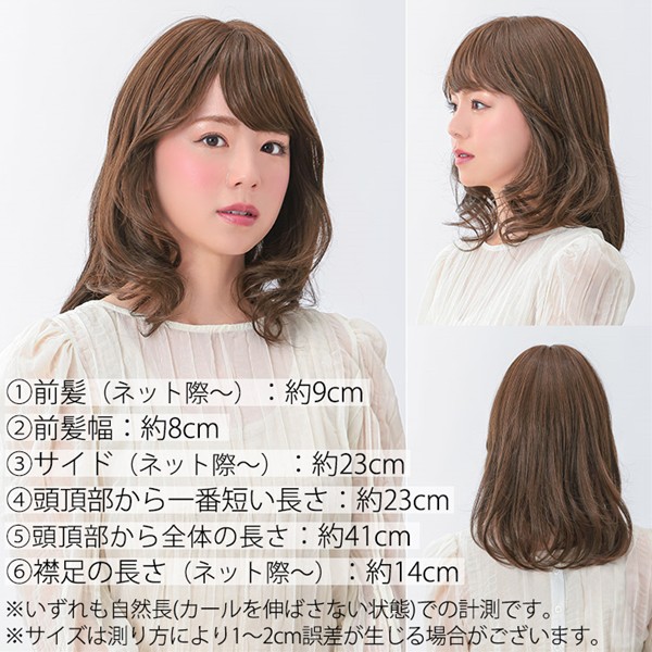 【商品詳細】 商品名: アクアドール ヴィーナス アルメリアミディ[pw117] 商品説明: ふんわりと仕上げた内巻きが、360度柔らかく優しい雰囲気に魅せてくれます。 上品な印象に見えるようこだわり抜いた長さとの相性抜群です。 カールが優しめなので、シーン問わず使いやすいスタイルです。 前髪サイドの外巻きが全体のアクセント。 顔周りの計算されたフェザーバングで、トレンド感も忘れません。 アクアドールヴィーナスは一本一本丁寧に手作業で毛を植えているから、ソフトな付け心地で自然なボリューム感を実現! 柔らかく伸びるメッシュ生地の網目に植え付けることで、風が通り抜ける通気性の良さを感じてください。 通気性が高く、伸縮性のあるメッシュ素材のウィッグキャップを採用しています! アジャスターで自由に、自分にぴったりのサイズに調整することができます。 アクアドールヴィーナスはNBKを除き、複数の色のファイバーをブレンドして作り上げています。 また、ウィッグ業界では手に入りにくい「日本製マットファイバー」を贅沢に使用したことでファイバーウィッグの難点だったテカリを軽減。 “ウィッグはテカリが出てしまう”というイメージを変えました。 テカリを気にせずに美髪の質感を楽しんで頂けます。 耐熱性のある人工毛だから 形状記憶性が高いのでスタイリングも簡単。 人毛には無い手軽さで毎日のオシャレを楽しんでいただけます。 サイズ: フリーサイズ(アジャスターによりサイズ調整可能) 長さ: 1.前髪 約9cm 2.前髪幅 約8cm 3.サイド 約23cm 4.頭頂部から一番短い長さ 約23cm 5.頭頂部から全体の長さ 約41cm 6.襟足の長さ 約14cm ※いずれも自然長(カールを伸ばさない状態)での計測です。若干の誤差がある場合があります。 重さ: 約109g カラー: SBE.シルキーベージュ MBR.モカブラウン BRN.ブラウン GBR.ジンジャーブラウン DRB.ダークブラウン ※カラーについて 商品写真はできる限り実物の色に近づけるよう加工しておりますが、お客様がご使用するモニター設定や部屋の照明により実際の商品とは色味が異なる場合があります。 耐熱温度: コテ・アイロン・ドライヤー180度まで使用可能(130度ぐらいがベストです)。 温度設定が高すぎたり、加熱時間が長すぎると、ウィッグが傷む恐れがありますのでご注意ください。 カール商品は、ストレートアイロンでしっかり延ばすとカールが戻らなくなる可能性があります。 自毛(人毛)の場合は熱を加えた時点でカールがつきますが、ウィッグの場合は冷ます工程でカールさせます。 仕様: シャンプー・ブラッシング可能/人工頭皮付き/こめかみワイヤー付き 同梱内容: ウィッグ本体 ウィッグ保護用ネット ウィッグ専用ネット 使い方説明書 備考: ・モデル着用ウィッグはモデルに合わせてブラッシング、若干のカット、整髪料を使用してのスタイリングを行っています。 ・毛先から軽くふわっとブラッシングするとよりナチュラルに着用できます。 ・初めてブラッシングされる際、生産工程の残り毛がある場合がございます。 ・しばらくブラッシングしていただけましたら落ち着きますので品質には問題ございません。 ※製品の仕様向上のため、製品の仕様は、予告なしに若干の変更がされる場合があります。 注意事項: 当社では複数店舗で在庫を共有しており、システムで在庫調整を行っておりますが、TV放映等による一時的な注文数の増大や、在庫の更新タイミングにより在庫にずれが生じる場合がございます。 在庫更新が間に合わずご注文頂いた商品が欠品となる場合もございます。 欠品が生じた場合や商品の発送が遅れる場合は、改めてご連絡させていただきます。 ご迷惑をお掛けする場合がございますが、あらかじめご了承くださいませ。 広告文責: 株式会社エーウィル 0747-26-5566 関連キーワード: ウィッグ ウイッグ つけ毛 かつら エクステ ハロウィン 七五三 クリスマス Xmas 夏祭り お正月 成人式 成人の日 バレンタインデー ホワイトデー ひな祭り 雛祭り 入学 入社 就職 卒業 卒園 新生活 新年度 記念日 お祝い プレゼント ギフト 贈り物 口コミ クチコミ 人気 レビュー 評判 通販 おすすめ