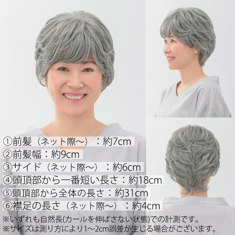 【商品詳細】 商品名: アクアドール ヴィーナス 大人の上品カールショート カラー: MBR.モカブラウン BRN.ブラウン DRB.ダークブラウン PGH.パールグレイヘア CGH.チャコールグレイヘア ※カラーについて 商品写真はできる限り実物の色に近づけるよう加工しておりますが、お客様がご使用するモニター設定や部屋の照明により実際の商品とは色味が異なる場合があります。 サイズ: フリーサイズ(アジャスターによりサイズ調整可能) 長さ: 1.前髪 約7cm 2.前髪幅 約9cm 3.サイド 約6cm 4.頭頂部から一番短い長さ 約18cm 5.頭頂部から全体の長さ 約31cm 6.襟足の長さ 約4cm ※いずれも自然長(カールを伸ばさない状態)での計測です。若干の誤差がある場合があります。 重さ: 約59g お手入れ方法: コテ・アイロン・ドライヤー180度まで使用可能(130度ぐらいがベストです)。 温度設定が高すぎたり、加熱時間が長すぎると、ウィッグが傷む恐れがありますのでご注意ください。 カール商品は、ストレートアイロンでしっかり延ばすとカールが戻らなくなる可能性があります。 自毛(人毛)の場合は熱を加えた時点でカールがつきますが、ウィッグの場合は冷ます工程でカールさせます。 仕様: シャンプー・ブラッシング可能/人工頭皮付き/こめかみワイヤー付き 同梱内容: ウィッグ本体 ウィッグ保護用ネット ウィッグ・かつら用専用ネット[wgn001] 使い方説明書 その他: ●モデル着用ウィッグはモデルに合わせてブラッシング、若干のカット、整髪料を使用してのスタイリングを行っています。 ●毛先から軽くふわっとブラッシングするとよりナチュラルに着用できます。 ●初めてブラッシングされる際、生産工程の残り毛がある場合がございます。 ●しばらくブラッシングしていただけましたら落ち着きますので品質には問題ございません。 ●※製品の仕様向上のため、製品の仕様は、予告なしに若干の変更がされる場合があります。 注意事項: 当社では複数店舗で在庫を共有しており、システムで在庫調整を行っておりますが、TV放映等による一時的な注文数の増大や、在庫の更新タイミングにより在庫にずれが生じる場合がございます。 在庫更新が間に合わずご注文頂いた商品が欠品となる場合もございます。 欠品が生じた場合や商品の発送が遅れる場合は、改めてご連絡させていただきます。 ご迷惑をお掛けする場合がございますが、あらかじめご了承くださいませ。 広告文責: 株式会社エーウィル 0747-26-5566 関連キーワード: ウィッグ ウイッグ つけ毛 かつら エクステ ハロウィン 七五三 クリスマス Xmas 夏祭り お正月 成人式 成人の日 バレンタインデー ホワイトデー ひな祭り 雛祭り 入学 入社 就職 卒業 卒園 新生活 新年度 記念日 お祝い プレゼント ギフト 贈り物 口コミ クチコミ 人気 レビュー 評判 通販 おすすめ
