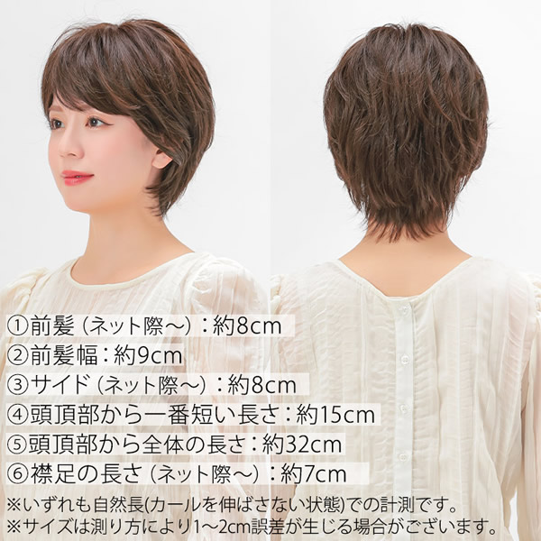 【商品詳細】 商品名: アクアドール ヴィーナス Mr.ショート [pw214] カラー: MBR.モカブラウン BRN.ブラウン GBR.ジンジャーブラウン DRB.ダークブラウン NBK.ナチュラルブラック ※カラーについて 商品写真はできる限り実物の色に近づけるよう加工しておりますが、お客様がご使用するモニター設定や部屋の照明により実際の商品とは色味が異なる場合があります。 サイズ: フリーサイズ(アジャスターによりサイズ調整可能) 長さ: 1.前髪 約8cm 2.前髪幅 約9cm 3.サイド 約8cm 4.頭頂部から一番短い長さ 約15cm 5.頭頂部から全体の長さ 約32cm 6.襟足の長さ 約7cm ※いずれも自然長(カールを伸ばさない状態)での計測です。若干の誤差が生じる場合がございます。 重さ: 約62g 耐熱温度: コテ・アイロン・ドライヤー180度まで使用可能(130度~160度がおすすめです)。 温度設定が高すぎたり、加熱時間が長すぎると、ウィッグが傷む恐れがありますのでご注意ください。 カール商品は、ストレートアイロンでしっかり延ばすとカールが戻らなくなる可能性があります。 自毛(人毛)の場合は熱を加えた時点でカールがつきますが、ウィッグの場合は冷ます工程でカールさせます。 仕様: シャンプー・ブラッシング可能/人工頭皮付き/こめかみワイヤー付き 同梱内容: ウィッグ本体 ウィッグ保護用ネット ウィッグ・かつら用専用ネット 使い方説明書 その他: ●モデル着用ウィッグはモデルに合わせてブラッシング、若干のカット、整髪料を使用してのスタイリングを行っています。 ●毛先から軽くふわっとブラッシングするとよりナチュラルに着用できます。 ●初めてブラッシングされる際、生産工程の残り毛がある場合がございます。 ●しばらくブラッシングしていただけましたら落ち着きますので品質には問題ございません。 ※製品の仕様向上のため、製品の仕様は、予告なしに若干の変更がされる場合があります。 注意事項: 当社では複数店舗で在庫を共有しており、システムで在庫調整を行っておりますが、TV放映等による一時的な注文数の増大や、在庫の更新タイミングにより在庫にずれが生じる場合がございます。 在庫更新が間に合わずご注文頂いた商品が欠品となる場合もございます。 欠品が生じた場合や商品の発送が遅れる場合は、改めてご連絡させていただきます。 ご迷惑をお掛けする場合がございますが、あらかじめご了承くださいませ。 広告文責: 株式会社エーウィル 0747-26-5566 関連キーワード: ウィッグ ウイッグ つけ毛 かつら エクステ ハロウィン 七五三 クリスマス Xmas 夏祭り お正月 成人式 成人の日 バレンタインデー ホワイトデー ひな祭り 雛祭り 入学 入社 就職 卒業 卒園 新生活 新年度 記念日 お祝い プレゼント ギフト 贈り物 口コミ クチコミ 人気 レビュー 評判 通販 おすすめ