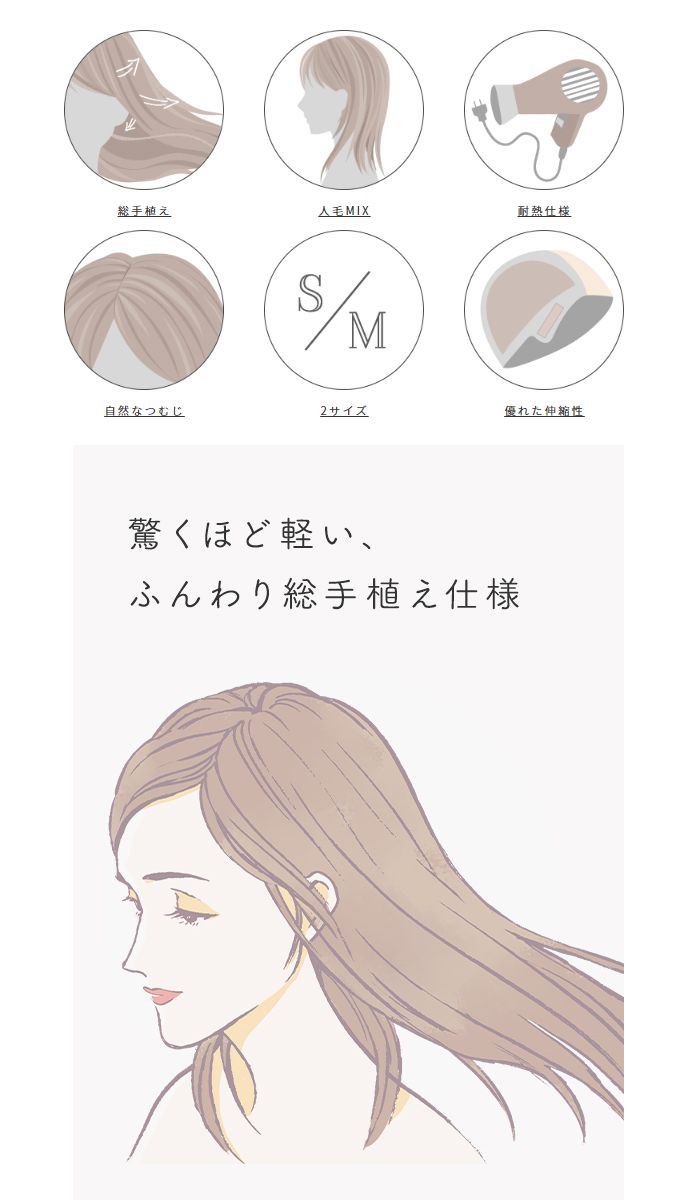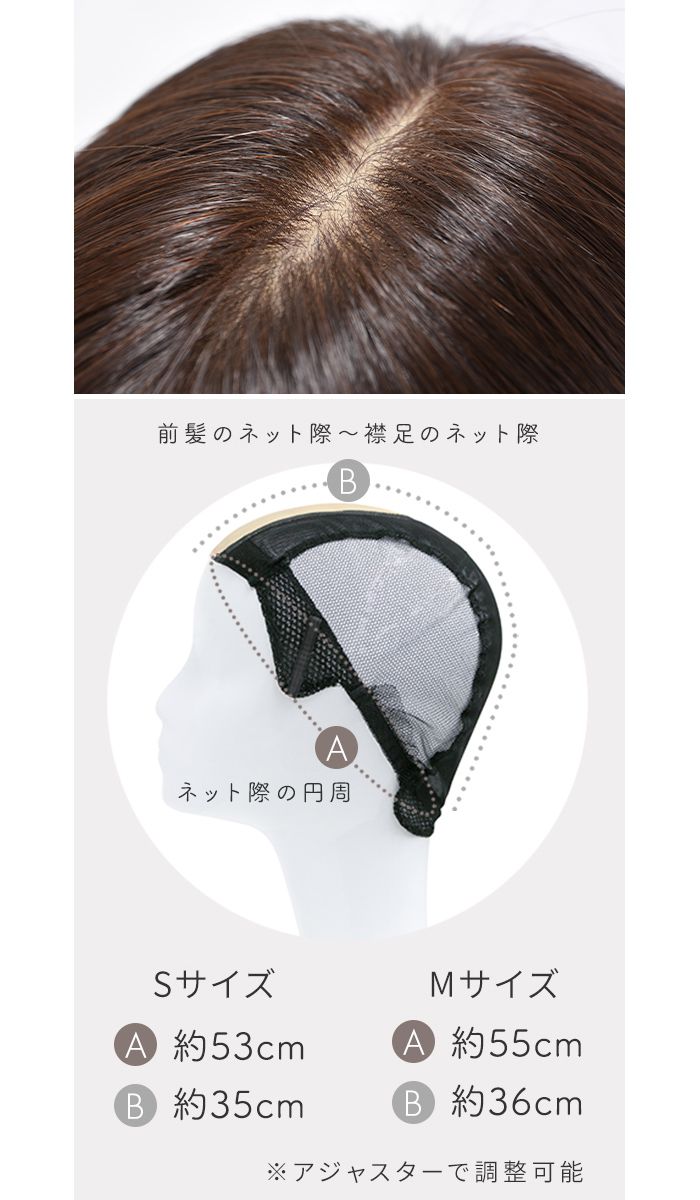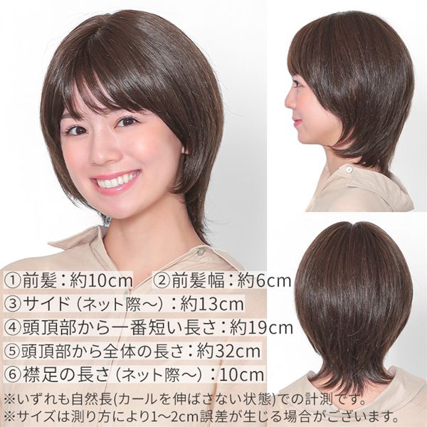 【商品詳細】 商品名: アクアドール ヴィーナス 大人の小顔ヘルシーショート人毛MIXウィッグ [pwm005] 商品説明: 上質なウィッグが、日常を変える 自然に見せることはもちろん、 毎日をストレスなく過ごす事にこだわった、 医療対応ウィッグです。 必要だからではなく 「素敵な自分になるため」に そんな想いの詰まった AQUADOLL VENUSで 心地よいWig Lifeをお楽しみください。 軽やかなトップから入ったレイヤーと、襟足が長めのタイトなスタイル。 首元を長くスッキリと見せてくれます。 顔周りの髪の毛も長めに残し、小顔効果も抜群。 ふんわりセットもかんたん 表面にレイヤーが入っているので 全体的に動きを出しやすく、 手ぐしで簡単にふんわりさせることが出来ます。 大人世代にもおすすめ 誰にでも似合うヘアスタイルなので、大人世代の方にもおすすめです。 常に私らしく美しい髪質で、こだわりの人毛ミックス アクアドールヴィーナスが使う人毛は 自然に見える為に品質にこだわっているため、 全て日本で確認した物しか使用していません。 様々な色を混ぜて作っているから、 まるで自分の髪のよう!と感じて頂けるクオリティ。 最高級の日本製ファイバーと、 選りすぐりの人毛をミックスさせて。 セットもキープもしやすい髪質に仕上げました。 1.前髪 ネット際から自然に落ちた毛先まで 2.前髪幅 ネット際の短い毛幅 3.サイド ネットのもみあげ先から自然に落ちる毛先まで 4.頭頂部から一番短い長さ 軽くつまんで持ち上げた寸法 5.頭頂部から全体の長さ 頭頂部から自然に落ちた毛先まで 6.襟足からの長さ ネット際から自然に落ちた毛先まで サイズ: Sサイズ A.ネット際の円周…約53cm B.前髪の生え際から頭頂部を通る襟足のネット際まで…約35cm C.右もみあげの生え際から後頭部を通る左もみあげの生え際まで…約36cm Mサイズ A.ネット際の円周…約55cm B.前髪の生え際から頭頂部を通る襟足のネット際まで…約36cm C.右もみあげの生え際から後頭部を通る左もみあげの生え際まで…約37cm ※いずれもアジャスターによりサイズ調整可能です。 長さ: 1.前髪 約10cm 2.前髪幅 約6cm 3.サイド 約13cm 4.頭頂部から一番短い長さ 約19cm 5.頭頂部から全体の長さ 約32cm 6.襟足の長さ 約10cm ※いずれも自然長(カールを伸ばさない状態)での計測です。若干の誤差がある場合があります。 重さ: 約67g カラー: MBRM.モカブラウン 人毛MIX CBRM.ショコラブラウン 人毛MIX CBKM.ショコラブラック 人毛MIX NBKM.ナチュラルブラック 人毛MIX ※カラーについて 商品写真はできる限り実物の色に近づけるよう加工しておりますが、お客様がご使用するモニター設定や部屋の照明により実際の商品とは色味が異なる場合があります。 耐熱温度: コテ・アイロン・ドライヤー180度まで使用可能(130度ぐらいがベストです)。 温度設定が高すぎたり、加熱時間が長すぎると、ウィッグが傷む恐れがありますのでご注意ください。 カール商品は、ストレートアイロンでしっかり延ばすとカールが戻らなくなる可能性があります。 地毛(人毛)の場合は熱を加えた時点でカールがつきますが、ウィッグの場合は冷ます工程でカールさせます。 仕様: シャンプー・ブラッシング可能/人工頭皮付き/こめかみワイヤー付き 同梱内容: ウィッグ本体 ウィッグ保護用ネット ウィッグ・かつら用専用ネット[wgn001] 使い方説明書 備考: ・モデル着用ウィッグはモデルに合わせてブラッシング、若干のカット、整髪料を使用してのスタイリングを行っています。 ・毛先から軽くふわっとブラッシングするとよりナチュラルに着用できます。 ・初めてブラッシングされる際、生産工程の残り毛がある場合がございます。 ・しばらくブラッシングしていただけましたら落ち着きますので品質には問題ございません。 ・製品の仕様向上のため、製品の仕様は、予告なしに若干の変更がされる場合があります。 広告文責: 株式会社エーウィル 0747-26-5566 関連キーワード: ウィッグ ウイッグ つけ毛 かつら エクステ ハロウィン 七五三 クリスマス Xmas 夏祭り お正月 成人式 成人の日 バレンタインデー ホワイトデー ひな祭り 雛祭り 入学 入社 就職 卒業 卒園 新生活 新年度 記念日 お祝い プレゼント ギフト 贈り物 口コミ クチコミ 人気 レビュー 評判 通販 おすすめ