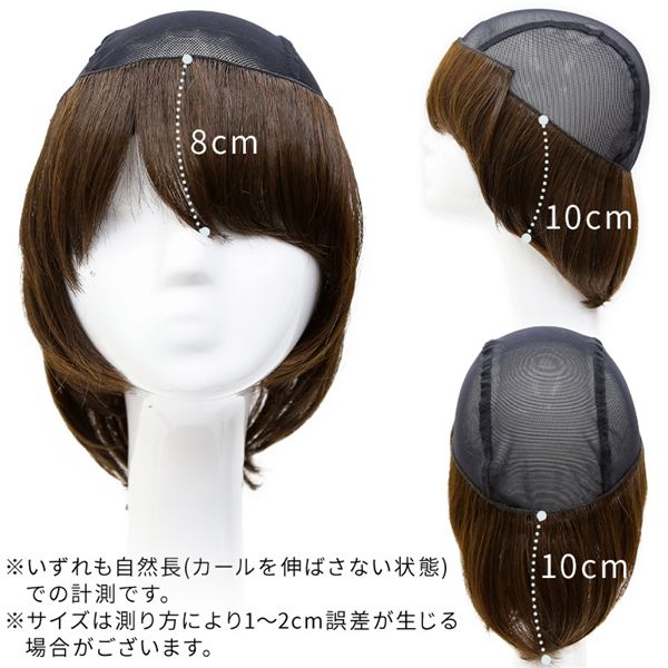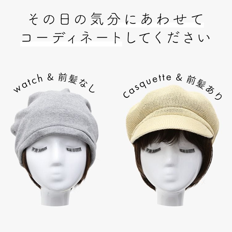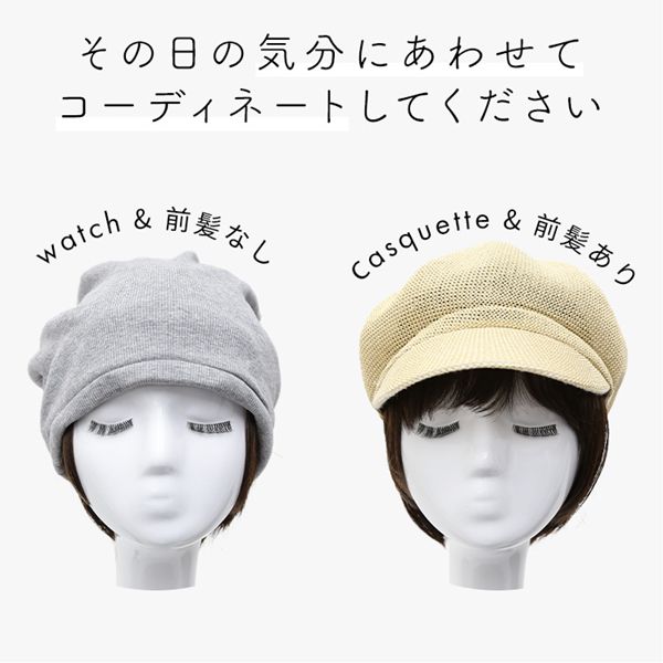 【商品詳細】 商品名: アクアドール 前髪取り外し式髪付き帽子ショート人毛MIX[wgn007] 商品説明: 『髪付き帽子とは…?』 後頭部部分が通気性のよいネットになった、帽子と合わせてお使いいただく医療用ウィッグです。 メッシュ部分を帽子で隠して、帽子から髪の毛が出ているようなスタイルを簡単に作れます。 さっと整えるだけで着用でき、フルウィッグと比べ締め付けが少ないため、楽にお使いいただけます。 脱毛症の方、がん治療中の方の声から誕生した人気の商品です。 髪付き帽子の最大の特徴は、帽子のようにパッとつければキマるところ。 フルウィッグをお休みしたい時、コンビニや、近くのスーパーのお買い物など、近距離のお出かけにも便利な髪付き帽子です。 使いやすいショートタイプの髪付き帽子。 シーンや年齢を問わず使えるナチュラルなスタイルです。 襟足長めのスタイルなので、浮いて見える心配もありません。 自然な見た目と、スタイリングやお手入れがしやすく、扱いやすさも兼ね備えたいいとこどりの髪質です。 アクアドールの髪付き帽子は、クリップ式で簡単に前髪を取り外しできます。 コーディネートに合わせて「前髪あり」と「前髪なし」を使い分けて♪ サイズ: フリーサイズ 長さ: 前髪 約8cm 横髪 約10cm 後髪 約10cm ※いずれも自然長(カールを伸ばさない状態)での計測です。若干の誤差がある場合があります。 頭囲: 約55cm 重さ: 約38g(重さは前髪を含みます) 仕様: 前髪取り外し式・人毛MIX(人毛30%人工毛70%) カラー: BKM.黒・人毛MIX FBRM.明るい自然茶・人毛MIX DGHM.ダークグレイヘア・人毛MIX SGHM.スモーキーグレイヘア・人毛MIX ※カラーについて 商品写真はできる限り実物の色に近づけるよう加工しておりますが、お客様がご使用するモニター設定や部屋の照明により実際の商品とは色味が異なる場合があります。 お手入れ方法: 1.洗面器に水またはぬるま湯とシャンプーを適量入れ、1~2分浸してからゆっくり押し洗いしてすすいでください。 2.同様にコンディショナーを適量入れ、1~2分浸してから軽くすすぎ、タオルなどを使って、しっかり水気をとってください。 3.ウィッグ用のスタンドやハンガーにかけて、風通しのよい日陰で乾燥させます(自然乾燥がおすすめですが、お急ぎの場合はドライヤーでもOK)。 ※ご使用後は髪の毛部分のホコリや花粉などを軽く払います。頻繁に洗う必要はありませんが、後頭部のネット部分は清潔に保つことが大切です(お好みでインナーキャップを着けてからご使用ください)。 ※コテ・アイロン・ドライヤーは180℃まで使用可能です(130℃くらいがおすすめです)。 ご使用上の注意: ・お肌に合わない場合はすみやかに使用を中止してください。※アレルギー体質の方は特にご注意ください。 ・火気、高熱の近くで使用しないでください。 ・最初は多少の抜け毛がございます、ご使用前に軽くブラッシングをしてご使用ください。 ・お子様の手の届かない所に保管ください。 ・カラーリングはできません。 備考: ・帽子は付属しておりません。商品写真着用の帽子はイメージです。ご自身で帽子を用意し、ご一緒にお使いください。 ・モデル着用ウィッグはモデルに合わせてブラッシング、若干のカット、整髪料を使用してのスタイリングを行っています。 ※製品の仕様向上のため、製品の仕様は、予告なしに若干の変更がされる場合があります。 広告文責: 株式会社エーウィル 0747-26-5566 関連キーワード: ウィッグ ウイッグ つけ毛 かつら エクステ ハロウィン 七五三 クリスマス Xmas 夏祭り お正月 成人式 成人の日 バレンタインデー ホワイトデー ひな祭り 雛祭り 入学 入社 就職 卒業 卒園 新生活 新年度 記念日 お祝い プレゼント ギフト 贈り物 口コミ クチコミ 人気 レビュー 評判 通販 おすすめ