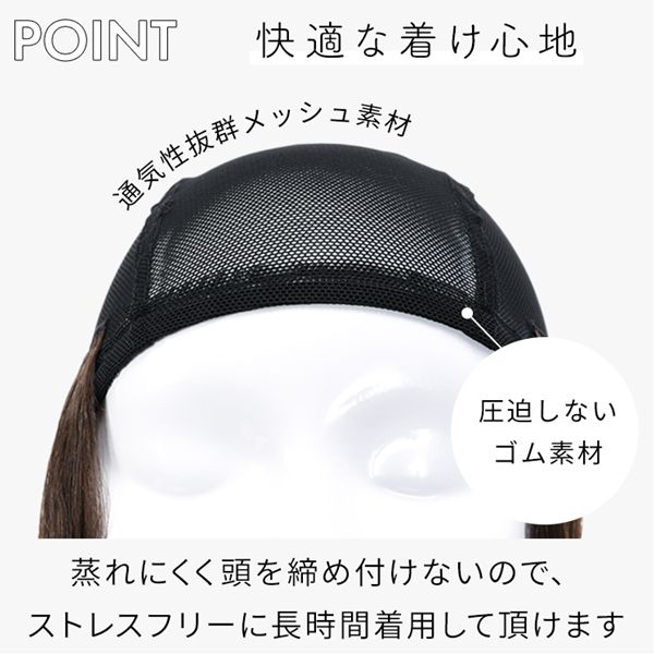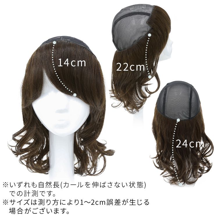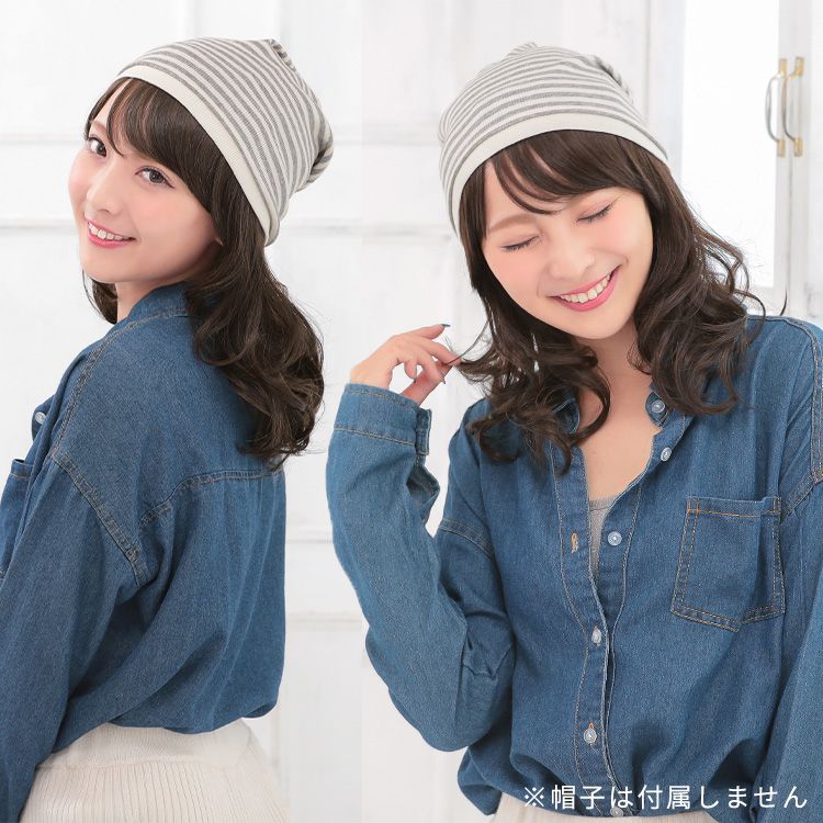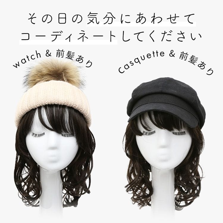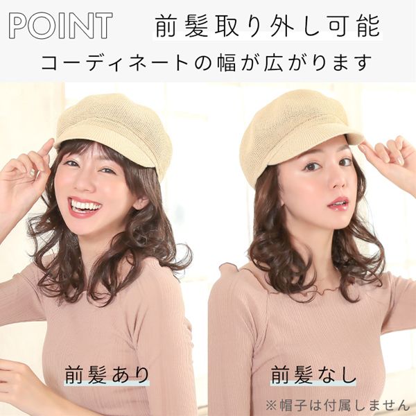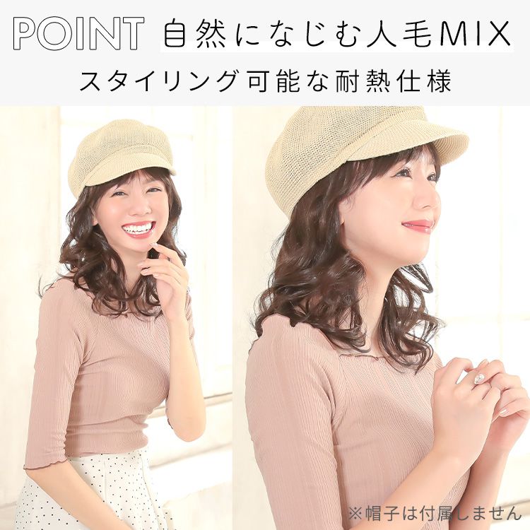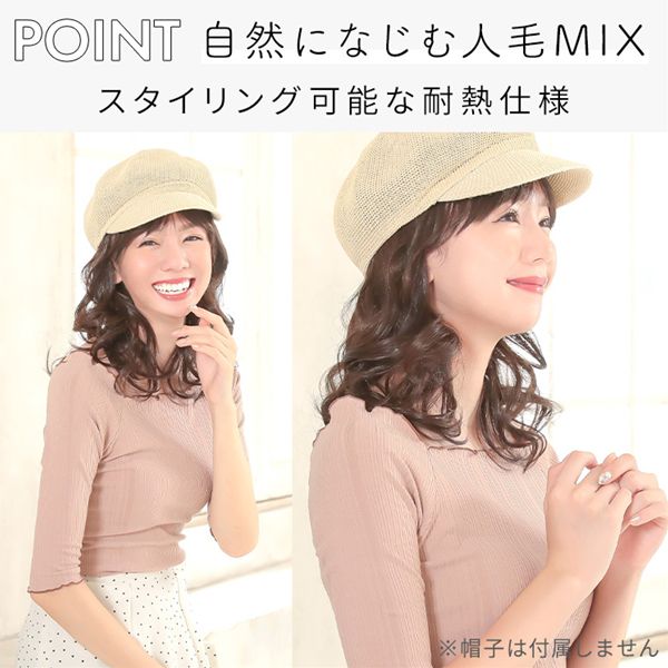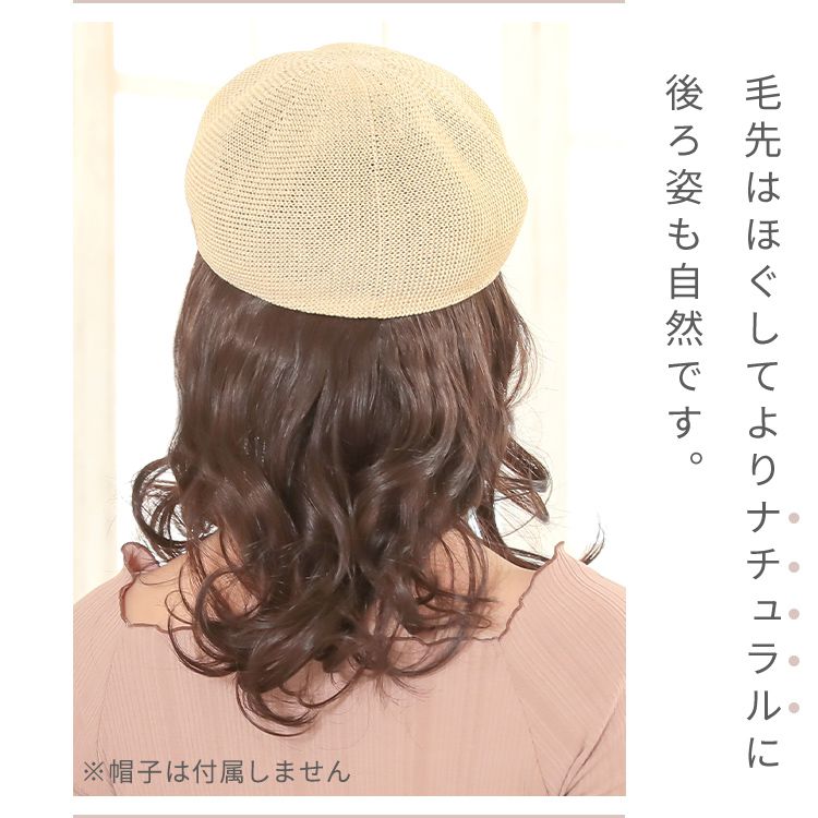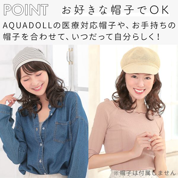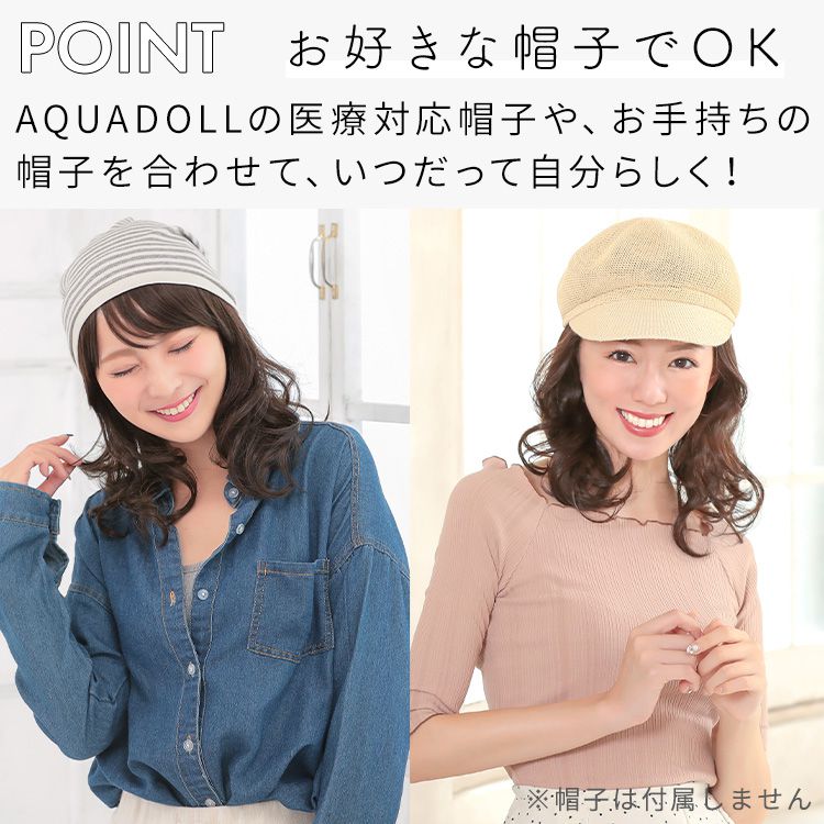 【商品詳細】 商品名: アクアドール 前髪取り外し式髪付き帽子ミディアムカール人毛MIX [wgn022] 商品説明: 後頭部部分が通気性のよいネットになった、帽子と合わせてお使いいただく医療用ウィッグです。 メッシュ部分を帽子で隠して、帽子から髪の毛が出ているようなスタイルを簡単に作れます。 さっと整えるだけで着用でき、フルウィッグと比べ締め付けが少ないため、楽にお使いいただけます。 脱毛症の方、がん治療中の方の声から誕生した人気の商品です。 髪付き帽子の最大の特徴は、帽子のようにパッとつければキマるところ。 フルウィッグをお休みしたい時、コンビニや、近くのスーパーのお買い物など、近距離のお出かけにも便利な髪付き帽子です。 大胆に手ぐしでふわふわにセットしても、整えて抑え目にセットしても可愛い、頼れる髪付き帽子です。 ざくざくなラフさを大切に開発したスタイル。 自然な見た目と、スタイリングやお手入れがしやすく、扱いやすさも兼ね備えたいいとこどりの髪質です。 アクアドールの髪付き帽子は、クリップ式で簡単に前髪を取り外しできます。 コーディネートに合わせて「前髪あり」と「前髪なし」を使い分けて♪ サイズ: フリーサイズ 頭囲:約55cm 長さ: 前髪 約14cm 横髪 約22 後髪 約24 ※いずれも自然長(カールを伸ばさない状態)での計測です。若干の誤差がある場合があります。 重さ: 約76g(重さは前髪を含みます) カラー: BKM.黒・人毛MIX FBRM.明るい自然茶・人毛MIX ※カラーについて 商品写真はできる限り実物の色に近づけるよう加工しておりますが、お客様がご使用するモニター設定や部屋の照明により実際の商品とは色味が異なる場合があります。 お手入れ方法: 1.洗面器に水またはぬるま湯とシャンプーを適量入れ、1~2分浸してからゆっくり押し洗いしてすすいでください。 2.同様にコンディショナーを適量入れ、1~2分浸してから軽くすすぎ、タオルなどを使って、しっかり水気をとってください。 3.ウィッグ用のスタンドやハンガーにかけて、風通しのよい日陰で乾燥させます(自然乾燥がおすすめですが、お急ぎの場合はドライヤーでもOK)。 ※ご使用後は髪の毛部分のホコリや花粉などを軽く払います。頻繁に洗う必要はありませんが、後頭部のネット部分は清潔に保つことが大切です(お好みでインナーキャップを着けてからご使用ください)。 ※コテ・アイロン・ドライヤーは180℃まで使用可能です(130℃くらいがおすすめです)。 ご使用上の注意: ・お肌に合わない場合はすみやかに使用を中止してください。※アレルギー体質の方は特にご注意ください。 ・火気、高熱の近くで使用しないでください。 ・最初は多少の抜け毛がございます、ご使用前に軽くブラッシングをしてご使用ください。 ・お子様の手の届かない所に保管ください。 ・カラーリングはできません。 備考: ・帽子は付属しておりません。商品写真着用の帽子はイメージです。ご自身で帽子を用意し、ご一緒にお使いください。 ・モデル着用ウィッグはモデルに合わせてブラッシング、若干のカット、整髪料を使用してのスタイリングを行っています。 ※製品の仕様向上のため、製品の仕様は、予告なしに若干の変更がされる場合があります。 広告文責: 株式会社エーウィル 0747-26-5566 関連キーワード: ウィッグ ウイッグ つけ毛 かつら エクステ ハロウィン 七五三 クリスマス Xmas 夏祭り お正月 成人式 成人の日 バレンタインデー ホワイトデー ひな祭り 雛祭り 入学 入社 就職 卒業 卒園 新生活 新年度 記念日 お祝い プレゼント ギフト 贈り物 口コミ クチコミ 人気 レビュー 評判 通販 おすすめ