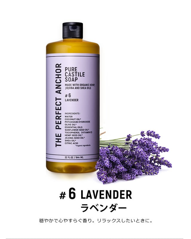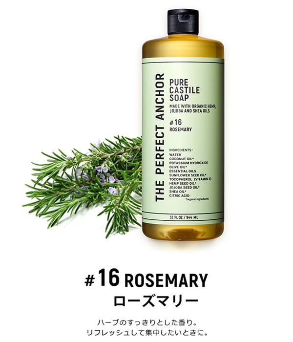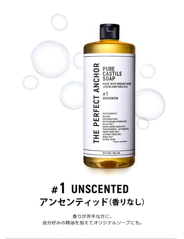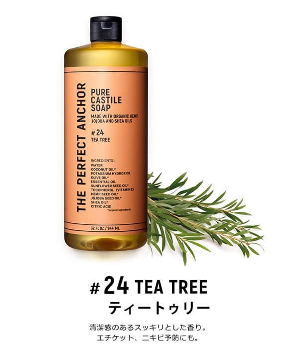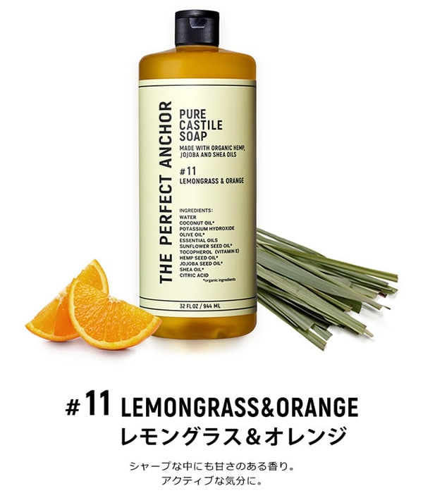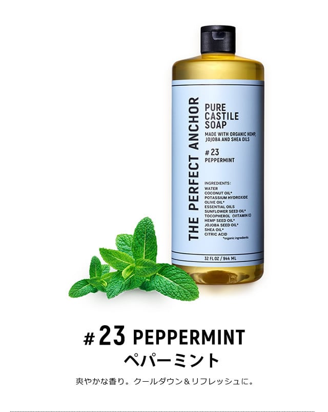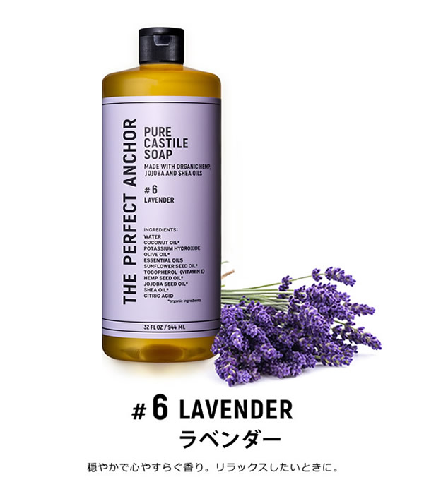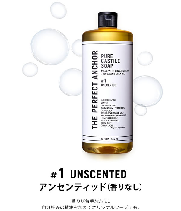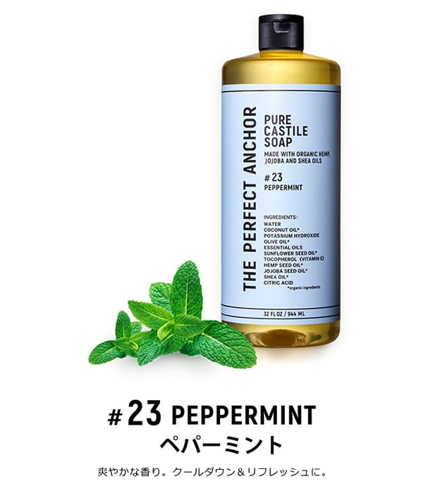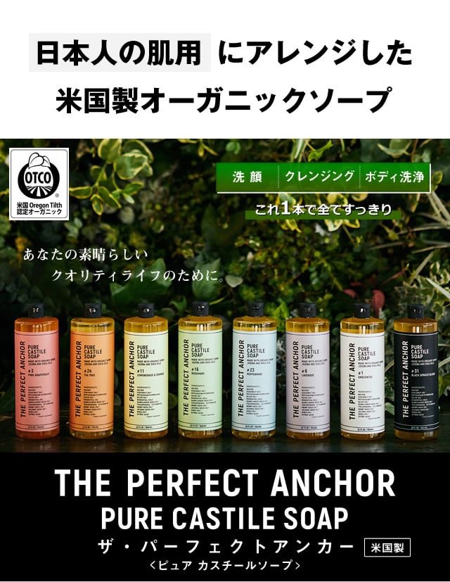 【商品詳細】 商品名: ザ・パーフェクトアンカー 商品説明: 日本人の肌用にアレンジした米国製オーガニックソープ。 POINT.1 20年以上の年月をかけ世界中のカスチールソープを試し、辿り着いた一品。 POINT.2 オーガニックにこだわった原材料。(オレゴンティルス認定オーガニック取得) POINT.3 アメリカ製のカスチールソープを日本人の肌に合わせてアレンジ。 POINT.4 これ1本で顔も体も洗え、メイクも落とせる。そしてつっぱらない。 POINT.5 贅沢な香りで毎日の洗顔や入浴の時間が、特別なアロマテラピータイムに! 種類: #3 ピンクグレープフルーツ #24 ティートゥリー #11 レモングラス&オレンジ #16 ローズマリー #23 ペパーミント #6 ラベンダー #1 アンセンティッド(香りなし) #31 ブラックスプルースブレンド 内容量: 944ml 配合成分: アンセンティッド(香りなし): 水、ヤシ油※、水酸化K、オリーブ果実油※、ヒマワリ種子油※、トコフェロール(ビタミンE)、アサ種子油※、ホホバ種子油※、シア脂油※、 クエン酸 アンセンティッド以外: 水、ヤシ油※、水酸化K、オリーブ果実油※、香料(エッセンシャルオイル)、ヒマワリ種子油※、トコフェロール(ビタミンE)、アサ種子油※、 ホホバ種子油※、シア脂油※、 クエン酸 ※オーガニック成分 (オイルが石鹸化する際にできるグリセリンは、そのまま残っております。) ご使用方法: 濡らした手やスポンジ、ネットに適量とり、泡立てて顔や体を洗ってください。 ご使用上の注意: ・自然成分なので、約15度以下で白く濁ります。 ・また、色や香りにばらつきが出たりもします。 ・合成界面活性剤不使用なので成分の一部が浮遊、沈殿することがあります。 ・どれも品質に問題はございません。 ・目に入らないようにご注意ください。 ・液が固まって穴が詰まりやすくなるので使用後は必ずフタをしめてください。 ・穴が詰まった時は、ボトルを押すと液が飛び目に入る恐れがありますので、楊枝などで穴を突いてからご使用ください。 ・目に入った時は、すぐに水で洗い流し、医師にご相談ください。 ・乳幼児が飲んだり目に入れたりしないようご注意ください。 ・お肌に合わない時や異常のある時は使用を中止し、医師にご相談ください。 区分: 雑貨 製造国: 米国 発売元: 株式会社サハラ・インターナショナルグループ 広告文責: 株式会社エーウィル 0747-26-5566