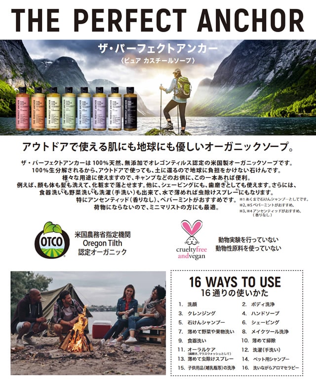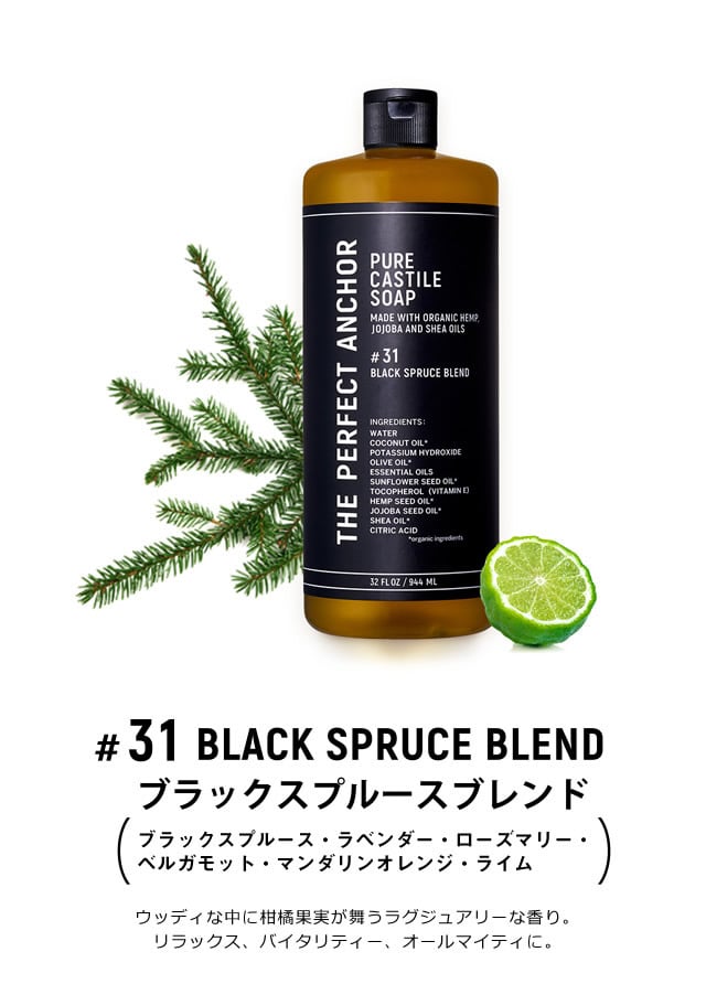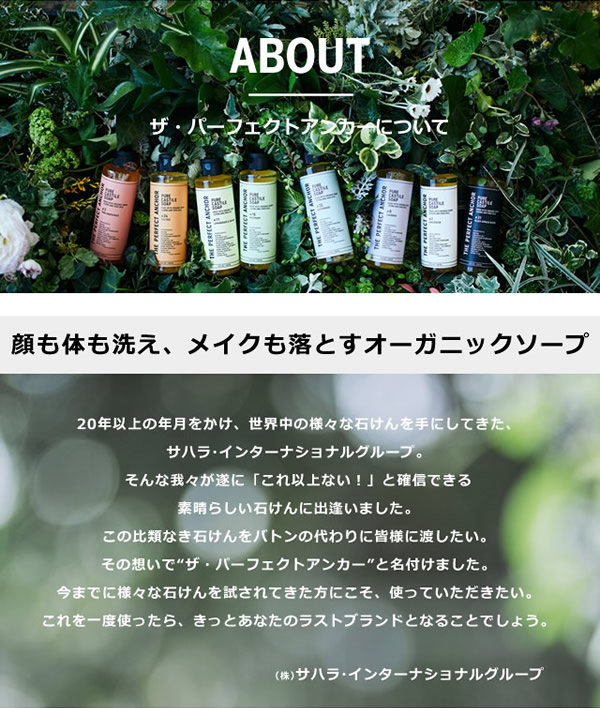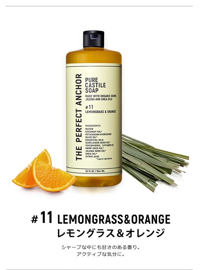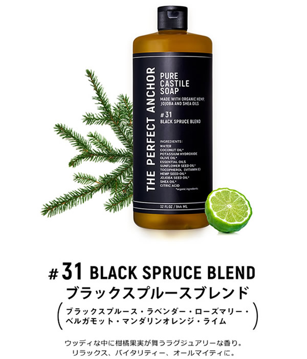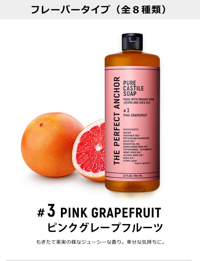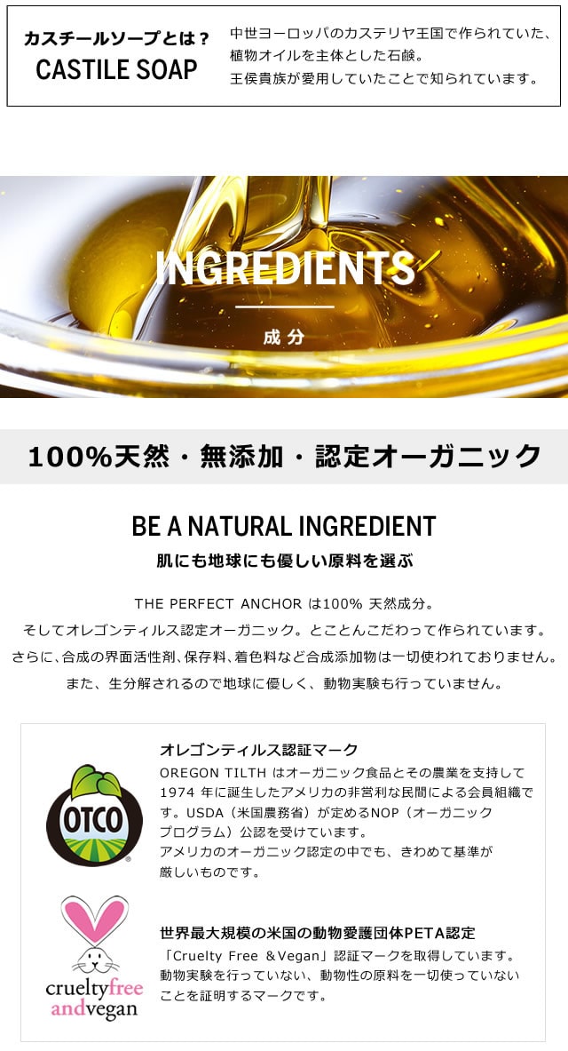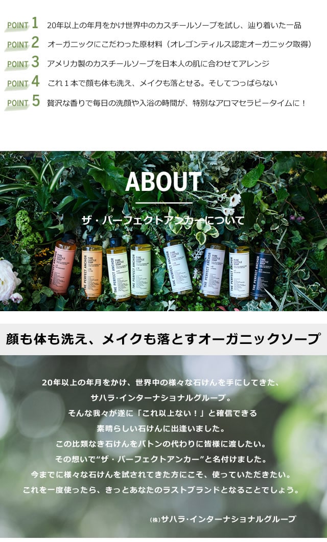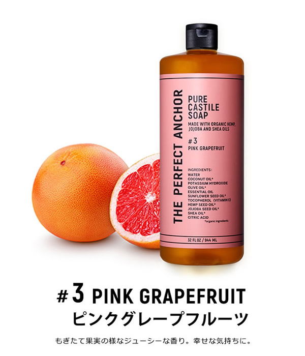 【商品詳細】 商品名: ザ・パーフェクトアンカー 商品説明: 日本人の肌用にアレンジした米国製オーガニックソープ。 POINT.1 20年以上の年月をかけ世界中のカスチールソープを試し、辿り着いた一品。 POINT.2 オーガニックにこだわった原材料。(オレゴンティルス認定オーガニック取得) POINT.3 アメリカ製のカスチールソープを日本人の肌に合わせてアレンジ。 POINT.4 これ1本で顔も体も洗え、メイクも落とせる。そしてつっぱらない。 POINT.5 贅沢な香りで毎日の洗顔や入浴の時間が、特別なアロマテラピータイムに! 種類: #3 ピンクグレープフルーツ #24 ティートゥリー #11 レモングラス&オレンジ #16 ローズマリー #23 ペパーミント #6 ラベンダー #1 アンセンティッド(香りなし) #31 ブラックスプルースブレンド 内容量: 944ml 配合成分: アンセンティッド(香りなし): 水、ヤシ油※、水酸化K、オリーブ果実油※、ヒマワリ種子油※、トコフェロール(ビタミンE)、アサ種子油※、ホホバ種子油※、シア脂油※、 クエン酸 アンセンティッド以外: 水、ヤシ油※、水酸化K、オリーブ果実油※、香料(エッセンシャルオイル)、ヒマワリ種子油※、トコフェロール(ビタミンE)、アサ種子油※、 ホホバ種子油※、シア脂油※、 クエン酸 ※オーガニック成分 (オイルが石鹸化する際にできるグリセリンは、そのまま残っております。) ご使用方法: 濡らした手やスポンジ、ネットに適量とり、泡立てて顔や体を洗ってください。 ご使用上の注意: ・自然成分なので、約15度以下で白く濁ります。 ・また、色や香りにばらつきが出たりもします。 ・合成界面活性剤不使用なので成分の一部が浮遊、沈殿することがあります。 ・どれも品質に問題はございません。 ・目に入らないようにご注意ください。 ・液が固まって穴が詰まりやすくなるので使用後は必ずフタをしめてください。 ・穴が詰まった時は、ボトルを押すと液が飛び目に入る恐れがありますので、楊枝などで穴を突いてからご使用ください。 ・目に入った時は、すぐに水で洗い流し、医師にご相談ください。 ・乳幼児が飲んだり目に入れたりしないようご注意ください。 ・お肌に合わない時や異常のある時は使用を中止し、医師にご相談ください。 区分: 雑貨 製造国: 米国 発売元: 株式会社サハラ・インターナショナルグループ 広告文責: 株式会社エーウィル 0747-26-5566
