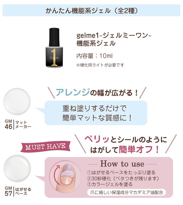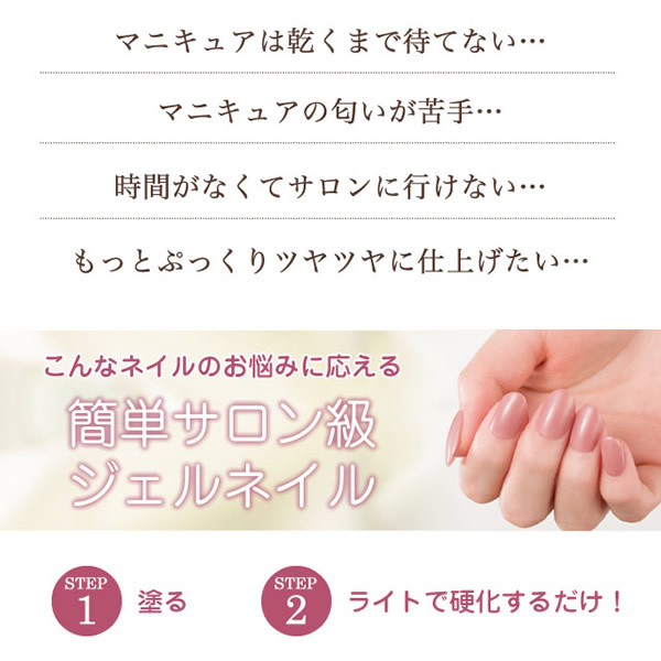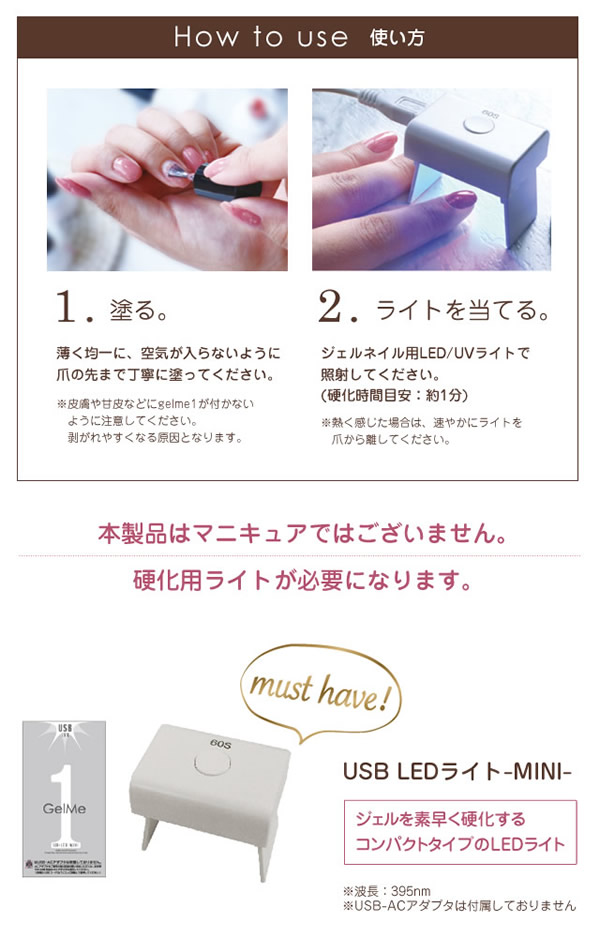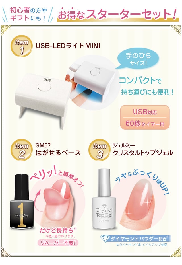【商品詳細】 商品名: ジェルミーワン スターターセット 全成分・仕様: ・GM57はがせるベース 全成分:ジカルバミン酸ジHEMAトリメチルヘキシル、ジメタクリル酸PEG-9、メタクリル酸ヒドロキシプロピル、ヒドロキシシクロヘキシルフェニルケトン、酢酸ブチル、マカデミア種子油、メチルイソチアゾリノン、メチルクロロイソチアゾリノン 内容量:10ml ・ジェルミー クリスタルトップジェル 全成分:アクリレーツコポリマー、HEMA、トリメチルベンゾイルジフェニルホスフィンオキシド、ダイヤモンド末 内容量:12ml ・USB-LEDライト MINI 波長:395nm LED×1灯 USBコード:80cm/1本 消費電力:3W 対応電圧:100-240V 50/60HZ タイマー設定時間:60秒 ※USB-ACアダプタは付属しておりません。 使用方法: 【ジェルミーワンの使い方】 1.はがせるベースを塗る 薄く均一に、空気が入らないように爪の先まで丁寧に塗ってください。 ※たっぷり2度塗りすると、はがしやすくなります。 ※硬化後べたつきが残るのは正常です。 2.ライトを当てる USB-LEDライトMINIを当てます。(硬化時間目安:約30秒) ※熱く感じた際は、速やかにライトを爪から離してください。 3.カラージェル(別売り)を塗る 薄く均一に、空気が入らないように爪の先まで丁寧に塗ってください。 ※皮膚や甘皮などに付かないように注意してください。はがれやすくなる原因となります。 ※カラージェルは別売りとなっております。 ジェルミーワン ネイルカラーより、お好みのカラーをお選びください。 4.ライトを当てる USB-LEDライトMINIを当てます。(硬化時間目安:約1分) 3.4を繰り返すことで、お好みの色に調整できます。 ※熱く感じた際は、速やかにライトを爪から離してください。 5.ジェルミー クリスタルトップジェルを塗る ジェルミーシリーズでお好みのネイルに仕上げてください。 空気が入らないように均等に塗ってください。 USB-LEDライトMINIを当てます。(硬化時間目安:約1分) ※熱く感じた際は、速やかにライトを爪から離してください。 【オフ方法】 ●はがせるベース(GM57)をご使用の場合 ペリッとシールのようにはがして簡単にオフできます! ※ジェルミーシリーズそれぞれのオフ方法に準じてオフしてください。 ●アセトンリムーバーをご使用の場合 1.コットンにアセトン入りリムーバーをたっぷり浸して爪の上に置きます。 2.指先をアルミホイルでしっかり包み、約10分待ちます。(カラーやリムーバーの種類によって時間がかかる場合がございます) 3.柔らかくなったジェルをウッドスティック等で優しく除去します。 使用上の注意: ●爪に異常が生じていないか良く注意してご使用ください。使用中または使用後、爪に異常があらわれた場合は直ちにご使用を中止し、皮膚科専門医等へご相談下さい。 ●手や皮膚に付いた場合は、すぐに石鹸と水で洗い流して下さい。 ●衣類等にジェルが付かないようにご注意下さい。 ●使用後はしっかりキャップを閉めて下さい。 ●蛍光灯の光などでジェルが固まる恐れがあります。蓋を開けたままの放置・保存は避けて下さい。 ●乳幼児の手の届かないところに保管して下さい。 ●直射日光の当たる場所、極端に高温または低温の場所では保管しないで下さい。 ●火気にご注意下さい。 ●用途以外にはお使いにならないで下さい。 ●開封後は半年以内に使い切ることをおすすめしています。 (USB-LEDライトMINI) ●熱く感じた際はライトから爪を離してください。 区分: 化粧品 製造国: 中国 メーカー: 株式会社コスメ・デ・ボーテ 注意事項: 当社では複数店舗で在庫を共有しており、システムで在庫調整を行っておりますが、TV放映等による一時的な注文数の増大や、在庫の更新タイミングにより在庫にずれが生じる場合がございます。 在庫更新が間に合わずご注文頂いた商品が欠品となる場合もございます。 欠品が生じた場合や商品の発送が遅れる場合は、改めてご連絡させていただきます。 ご迷惑をお掛けする場合がございますが、あらかじめご了承くださいませ。 広告文責: 株式会社エーウィル 0747-26-5566