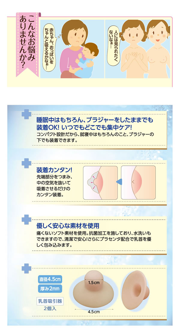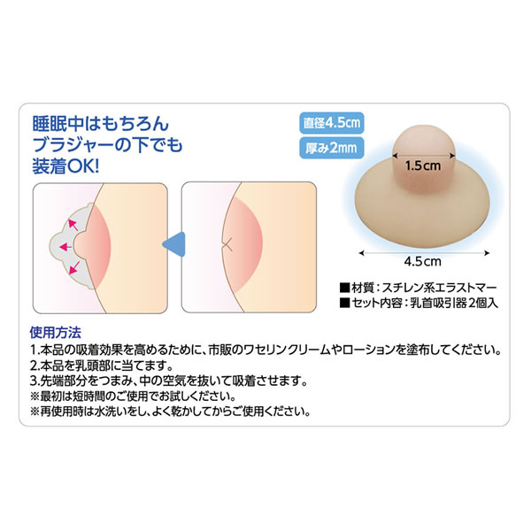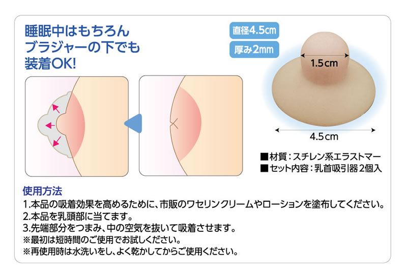 【商品詳細】 商品名: チェリートップ3 内容: 2個入り 材質: スチレン系エラストマー 使用方法: 本品の吸着効果を高めるために、市販のワセリンクリームやローションを塗布してください。 本品を乳頭部に当てます。 先端部分をつまみ、中の空気を抜いて吸着させます。 ※最初は短時間のご使用でお試しください。 ※再使用時は水洗いをし、よく乾かしてからご使用ください。 使用上のご注意: 使用中に皮膚に異常を感じたときは使用を中止してください。 炎症や外傷がある場合は使用しないでください。 使用後は水洗いし、よく乾かしてから保管してください。 乳幼児の手の届かないところへ保管してください。 区分: 雑貨 製造国: 日本 メーカー: 昭プラ株式会社 広告文責: 株式会社エーウィル 0747-26-5566