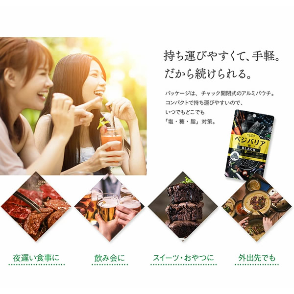 【商品詳細】 商品名: ベジエ ベジバリア塩糖脂ブラック 商品説明: 塩分・糖質・脂質の多い食事と一緒に。 現代人の美容と健康を考えた食生活サポートサプリメント。 黒の栄養素をぎゅっと一粒に凝縮しました。 ●ヤシ殻活性炭・伊那赤松妙炭・鎌倉珪竹炭・5種の黒素材配合 ●桑の葉・イヌリン・ブロッコリースプラウト配合 ●アクティブファイバー(R)・カリウム配合 ●ウーロン茶ポリフェノール・キノコキトサン配合 ※パッケージデザイン等は予告なく変更されることがあります 内容量: 33.3g(370mg×90粒) 原材料名: 麦芽糖(国内製造)、桑の葉粉末、褐藻抽出物、イヌリン、ヤシ殻活性炭、赤松炭、竹炭、ウーロン茶エキス、キノコキトサン、ブラックカラント抽出物、黒大豆、醗酵黒タマネギパウダー、醗酵黒ニンニクパウダー、ゴボウ末、ブロッコリースプラウトエキス、大麦若葉粉末、ケール粉末、ブロッコリー粉末、かぼちゃ粉末、チンゲン菜粉末、パセリ粉末、人参粉末、セロリ粉末、苦瓜粉末、ほうれん草粉末、モロヘイヤ粉末、よもぎ粉末、トマト粉末/結晶セルロース、酸化マグネシウム、塩化カリウム、ヒドロキシプロピルセルロース、ショ糖脂肪酸エステル、微粒二酸化ケイ素、ステアリン酸カルシウム 栄養成分表示3粒(1.11g)あたり: エネルギー:2.97kcal たんぱく質:0.32g 脂質:0.04g 炭水化物:0.79g(糖質0.46g、食物繊維0.33g) 食塩相当量:0.002g お召し上がり方: 栄養補助食品として、1日3粒を目安に水またはぬるま湯でお召し上がりください。 保存方法: 直射日光、高温・多湿の場所を避けて冷暗所に保存してください。 使用上のご注意: ●原材料をご参照のうえ、アレルギーがある方、妊娠中の方、疾病治療中の方の摂取はご配慮ください。まれに体質に合わない方もございます。 ●お召し上がりの前に表示及び説明文をよくお読みのうえ正しくお召し上がりください。 ●お召上がり後体調のすぐれない場合は、お召し上がりを中止してください。 ●自然由来の原料を使用しておりますので、色調などにバラつきがある場合がありますが、品質に問題はありませんので安心してお召し上がりください。 ●開封後は、必ずしっかり封をしてお早めにお召し上がりください。 ●炭粉末が飛散し肌や衣服につく恐れがありますのでご注意ください。 製造国: 日本 区分: 健康食品 販売者: 株式会社KYORA 広告文責: 株式会社エーウィル 0747-26-5566