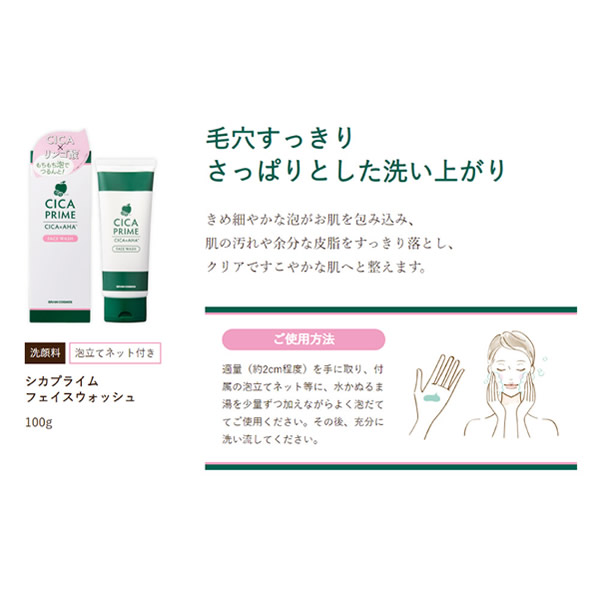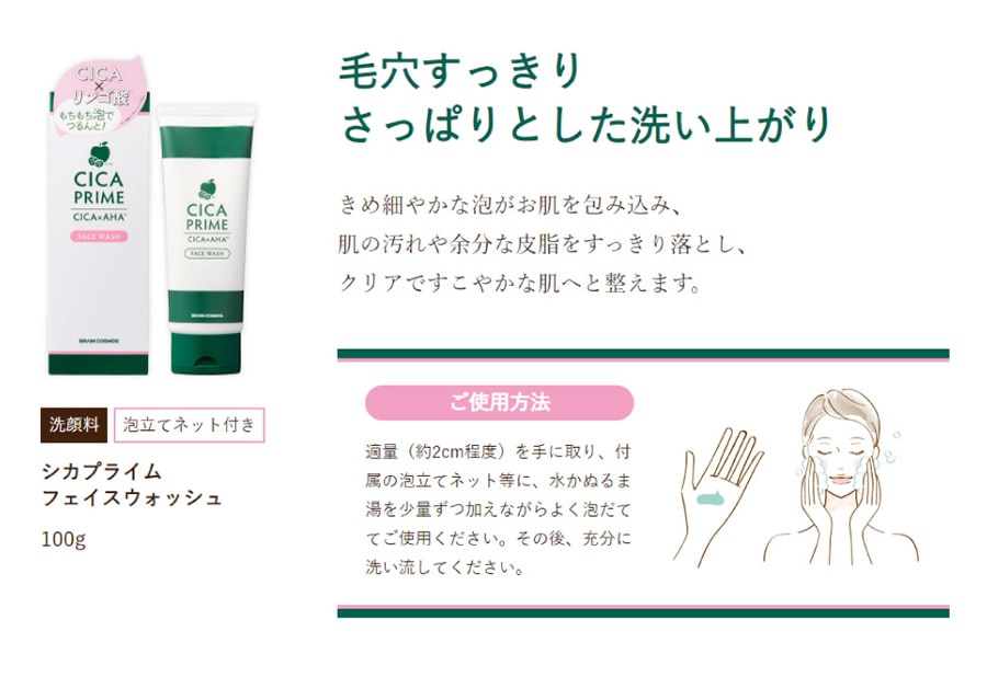 【商品詳細】 商品名: シカプライム フェイスウォッシュ 商品説明: CICA(ツボクサエキス)、AHA(リンゴ酸)、その他10種(セイヨウノコギリソウ花エキス、メリッサ葉エキス、タチジャコウソウ花/葉/茎エキス、セージ葉エキス、スギナエキス、カミツレ花エキス、オノニスエキス、アルテア根エキス、セロリエキス、フキタンポポ花/葉エキス)の植物エキス配合 6つのフリー処方 鉱物油/合成着色料/合成香料/パラベン/紫外線吸収剤/シリコン 内容量: 100g 成分: 水、ステアリン酸、ミリスチン酸、水酸化K、PG、ラウリン酸、パルミチン酸、水添ヒマシ油、ステアリン酸グリセリル、BG、フェノキシエタノール、ユーカリ葉油又は香料、ヒドロキシプロピルメチルセルロース、グリチルリチン酸2K、リンゴ酸、ヘキシルデカノール、エタノール、リンゴ果実培養細胞エキス、ツボクサエキス、リンゴ種子エキス、クリサンテルムインジクムエキス、キサンタンガム、シャクヤク根エキス、リンゴ果実エキス、尿素、セロリエキス、フキタンポポ花/葉エキス、カミツレ花エキス、アルテア根エキス、スギナエキス、メリッサ葉エキス、グリセリン、タチジャコウソウ花/葉/茎エキス、セージ葉エキス、オノニスエキス、セイヨウノコギリソウ花エキス、レシチン 使用方法: 適量(約2cm程度)を手に取り、付属の泡立てネット等に、水可ぬるま湯を少量ずつ加えながらよく泡立ててご使用ください。その後、充分に洗い流してください。 使用上の注意: ●お肌に異常が生じていないかよく注意して使用して下さい。化粧品がお肌に合わないとき、即ち次のような場合には、使用を中止してください。そのまま、化粧品類の使用を続けますと、症状を悪化させることがありますので、皮膚科専門医等にご相談されることをおすすめします。 (1)使用中、赤み、はれ、かゆみ、刺激、色抜け(白斑等)や黒ずみ等の異常があらわれた場合。 (2)使用したお肌に、直射日光があたって上記のような異常が現れた場合。 ●目に入らないようにご注意ください。入った場合には、こすらずすぐに水で充分洗い流してください。 ●傷やはれもの、湿しん等の異常のある部位にはお使いにならないでください。 保管及び取扱い上の注意: (1)使用後は必ずしっかりとフタをしめてください。 (2)乳幼児の手の届かないところに保管してください。 (3)極端に高温または低温の場所、直射日光の当たる場所には保管しないでください。 原産国: 日本 区分: 化粧品 販売元: 株式会社ブレーンコスモス 注意事項: 当社では複数店舗で在庫を共有しており、システムで在庫調整を行っておりますが、TV放映等による一時的な注文数の増大や、在庫の更新タイミングにより在庫にずれが生じる場合がございます。 在庫更新が間に合わずご注文頂いた商品が欠品となる場合もございます。 欠品が生じた場合や商品の発送が遅れる場合は、改めてご連絡させていただきます。 ご迷惑をお掛けする場合がございますが、あらかじめご了承くださいませ。 広告文責: 株式会社エーウィル 0747-26-5566
