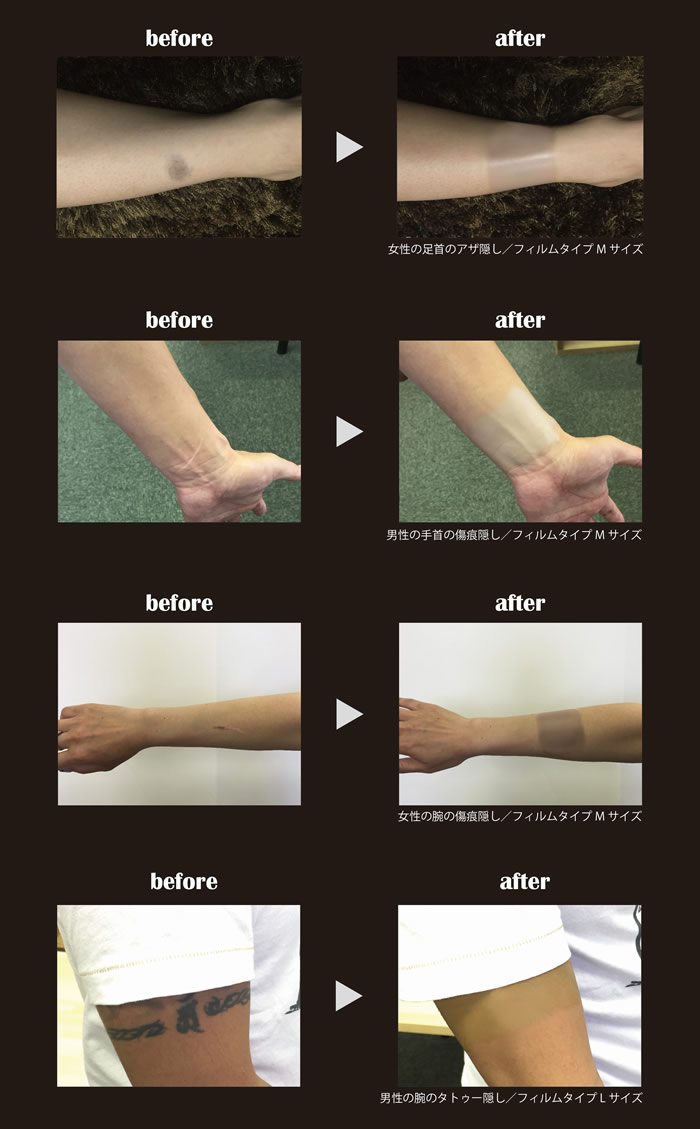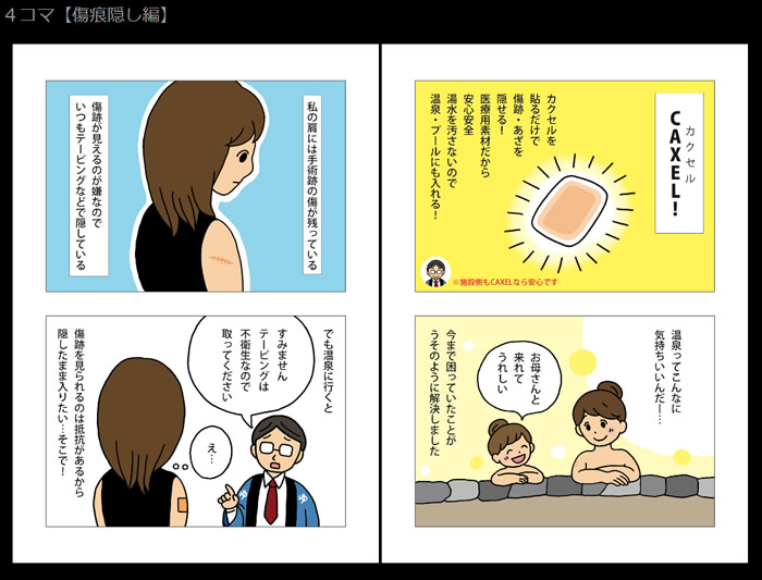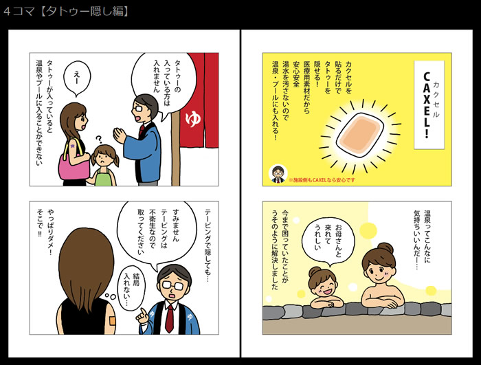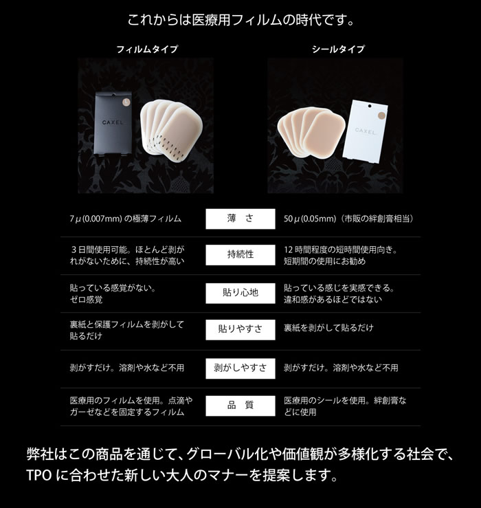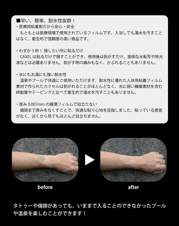 商品名:CAXELシール miniサイズ カラー:ナチュラルカラー ナチュラルな肌色のTATTOOカバーシールです。 カラー:オークカラー ナチュラルよりも少し濃い色のTATTOOカバーシールです。 商品スペック サイズ:mini 60×22mmの細長タイプ(I型) mini 直径20mmの円形タイプ(O型) 枚数:5枚 CAXELの特徴 「少しだけカクセルものが欲しい」 そんな需要にお応えして、CAXEL「シールタイプ mini」を発売いたします。 フィルムタイプよりも厚い生地のシールタイプにし、さらにセパレーターを片面だけにすることで、大幅なコストダウンを実現することができました。 生地の素材はフィルムタイプ同様、医療用シールを使用し開発しました。お肌にも安心・安全の日本製です。 ■医療用粘着シールだから安心・安全 医療で使用されている粘着シールを使用し、TATTOOや傷跡隠し専用 に加工しています。そのため人体に貼っても安全です。 ■わずか5秒!隠したい所に貼るだけ CAXELは貼るだけで隠すことができ、使用後は剥がすだけ。 面倒な水転写や除光液などは必要ありません。 ■水にもお湯にも強い耐水性 温泉やプールで快適にご使用いただけます。 途中で剥がれることもほとんどなく、水が進入することもありません。