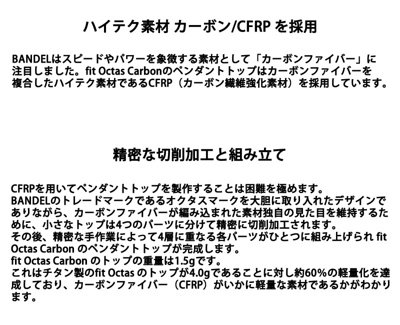 【商品詳細】 商品名: バンデル ヘルスケア ループ フィット オクタスカーボン 商品説明: BANDELはスピードやパワーを象徴する素材として「カーボンファイバー」に注目しました。 fit Octas Carbonのペンダントトップはカーボンファイバーを複合したハイテク素材であるCFRP(カーボン繊維強化素材)を採用しています。 CFRPは軽量でありながらあらゆる変化に強い特徴があり、極限の状況で高いパフォーマンスが求められるレーシングカーや航空、宇宙の分野で多様されることで知られています。 BANDELのトレードマークであるオクタスマークを大胆に取り入れたデザインでありながら、fit Octas Carbon のトップの重量は1.5gです。 これはチタン製のfit Octas のトップが4.0gであることに対し約60%の軽量化を達成しており、カーボンファイバー(CFRP)がいかに軽量な素材であるかがわかります。 fit Octas Carbonは素材やデザインのみを追求したアクセサリーではありません。 ヘルスケアループは、最大磁束密度200mTの強力な磁力を発生するネオジム磁石がループ全周に150個配置した健康的な生活を促す機能性アクセサリーです。 既存のfitシリーズで好評を得ている磁石同士の吸着を利用した自由度の高いサイズ調整としなやかな装着感は健在です。 カラー: ブラック×ゴールド ブラック×シルバー オールブラック サイズ: Free(全長約 60cm/ループ約 3.0mm/ループ重量 15g/ヘッド重量 1.5g) 素材: 【ループ部】PVC+ ネオジム磁石 【キャップ部】ステンレススティール 【ヘッド部】 ブラック×ゴールド CFRP(カーボン繊維強化素材)+テキサリウム ブラック×シルバー CFRP(カーボン繊維強化素材)+テキサリウム オールブラック CFRP(カーボン繊維強化素材) 医療機器認証番号: 3304AFBZX00035000 原産国: 日本 区分: 管理医療機器 メーカー: 株式会社BANDEL 注意事項: 当社では複数店舗で在庫を共有しており、システムで在庫調整を行っておりますが、TV放映等による一時的な注文数の増大や、在庫の更新タイミングにより在庫にずれが生じる場合がございます。 在庫更新が間に合わずご注文頂いた商品が欠品となる場合もございます。 欠品が生じた場合や商品の発送が遅れる場合は、改めてご連絡させていただきます。 ご迷惑をお掛けする場合がございますが、あらかじめご了承くださいませ。 広告文責: 株式会社エーウィル 0747-26-5566 関連キーワード: 医療機器 磁気ネックレス 磁石 血行 肩 首 コリ 肩こり ほぐし アクセサリー お洒落 オシャレ 男性用 女性用 男女兼用 プレゼント ギフト 誕生日 母の日 父の日 クリスマス Xmas バレンタインデー ホワイトデー 記念日 お祝い 入学 就職 入社 敬老の日 勤労感謝の日 贈り物 口コミ クチコミ 人気 レビュー 評判 通販 おすすめ