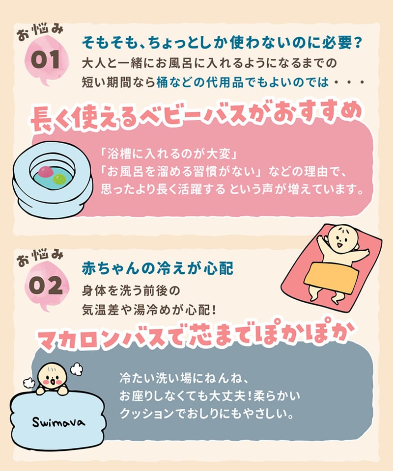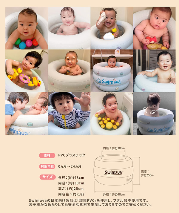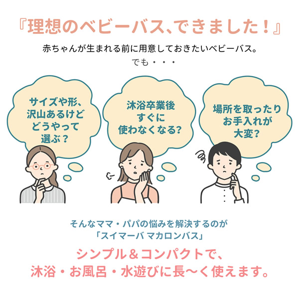 【商品詳細】 商品名: スイマーバ マカロンバス イージーパック 商品説明: スイマーバのロングセラーアイテム『マカロンバス』に付属ポンプ無し、簡易パッケージでよりリーズナブルにお買い求めいただけるイージーパック版が登場。 沐浴、お風呂、水遊びにと、0歳~2歳頃まで長くご使用頂けます。 大きくなってからも、おもちゃやおむつ、小物入れとして活用できます。 一般的なベビーバスや、お風呂の中での不安定な体勢に比べて、しっかり座ることができてリラックスして入浴できます。 対象月齢: 0ヵ月~24ヵ月頃 セット内容: マカロンバス本体、日本語公式ガイド ※ポンプは付属しておりません。 素材: PVCプラスチック(塩化ビニル樹脂) ご注意: ●ご使用中は目を離さないようにして、異変があればすぐに保護者が対応できる状況で使用してください。 メーカー: 有限会社FUNAZAWA 注意事項: 当社では複数店舗で在庫を共有しており、システムで在庫調整を行っておりますが、TV放映等による一時的な注文数の増大や、在庫の更新タイミングにより在庫にずれが生じる場合がございます。 在庫更新が間に合わずご注文頂いた商品が欠品となる場合もございます。 欠品が生じた場合や商品の発送が遅れる場合は、改めてご連絡させていただきます。 ご迷惑をお掛けする場合がございますが、あらかじめご了承くださいませ。 広告文責: 株式会社エーウィル 0747-26-5566 関連キーワード: Swimava プール バス ベビーバス お風呂 ギフト 誕生日 出産祝い 赤ちゃん ベビー 水遊び スイマーバ マカロン バス 簡易包装