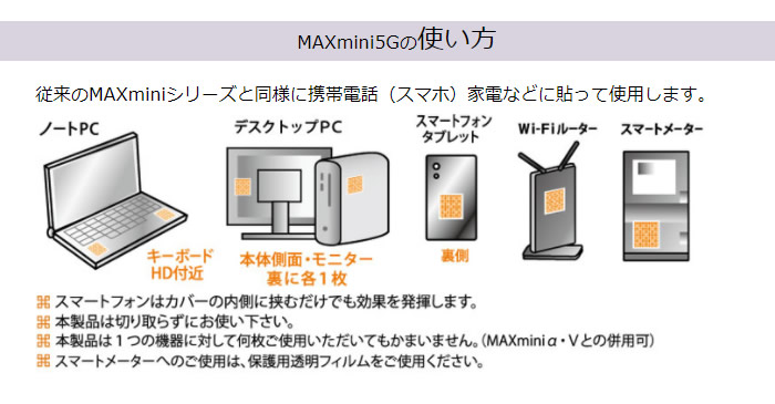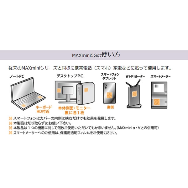 【商品詳細】 商品名: 電磁波ブロッカー MAX min 5G 商品説明: 5G通信対応機器、パソコン、携帯電話、スマートフォン、Wi-Fiルーターなどから発する電磁波、マイクロ波などを低減させるフィルムです。 セット内容: MAX mini 5G×1 機器保護透明フィルム×2 素材: MAX mini 5G:横 約43mm×縦 約45mm 機器保護透明フィルム:横 約50mm×縦 約50mm サイズ: MAX mini 5G:銅・粘着シート 機器保護透明フィルム:PET ご注意: ●本製品を使用しての事故や故障、データの損失などに関して、当社は一切の責任を負いかねます。あらかじめご了承ください。 ●本製品を用途以外の目的で使用しないでください。 ●仕様及び外観は予告なく変更されることがあります。 ●火気の近く、高温、多湿な場所でのご使用、保管はしないでください。 ●幼児の手の届かない場所に保管してください。 製造国: 日本 区分: 雑貨 販売者: 株式会社ユニカ 広告文責: 株式会社エーウィル 0747-26-5566