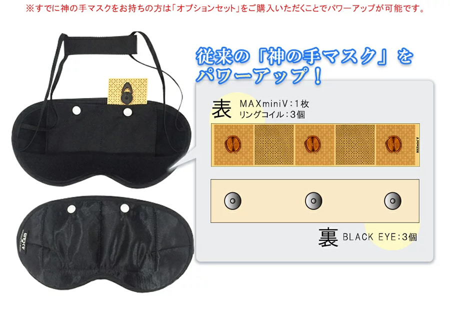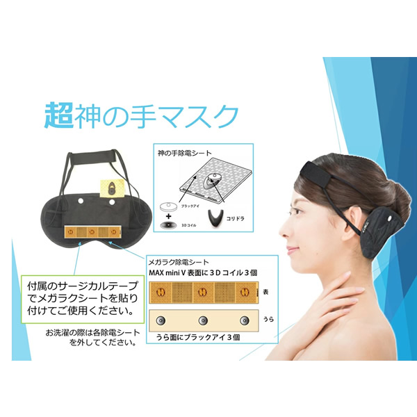 【商品詳細】 商品名: 超神の手マスク セット内容: アイマスク1個、神の手除電シート2枚、メガラク除電シート1枚 サイズ: アイマスク本体部 約20×10.5cm(調節可) 神の手除電シート 44×46×(最大厚み)5mm メガラク除電シート 103×21×(最大厚み)5mm 素材: アイマスク:表面 ポリエステル/裏面 綿/中面 セラミック炭シート 神の手除電シート 銅線基盤2種各2枚、ブラックアイ2個、コリドラ2個、3Dコイル2個 コーティング剤 エポキシ樹脂 メガラク除電シート 銅線基盤1種、ブラックアイ3個、3Dコイル3個 サージカルテープ 基材/パルプポリエステル不織布、粘着剤/アクリル系 付属品: サージカルテープ1巻(25mm×9m) 区分: 健康雑貨 発売元: 株式会社ユニカ 注意事項: 当社では複数店舗で在庫を共有しており、システムで在庫調整を行っておりますが、TV放映等による一時的な注文数の増大や、在庫の更新タイミングにより在庫にずれが生じる場合がございます。 在庫更新が間に合わずご注文頂いた商品が欠品となる場合もございます。 欠品が生じた場合や商品の発送が遅れる場合は、改めてご連絡させていただきます。 ご迷惑をお掛けする場合がございますが、あらかじめご了承くださいませ。 広告文責: 株式会社エーウィル 0747-26-5566