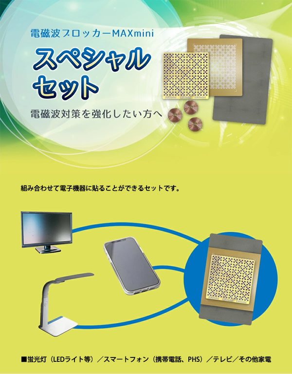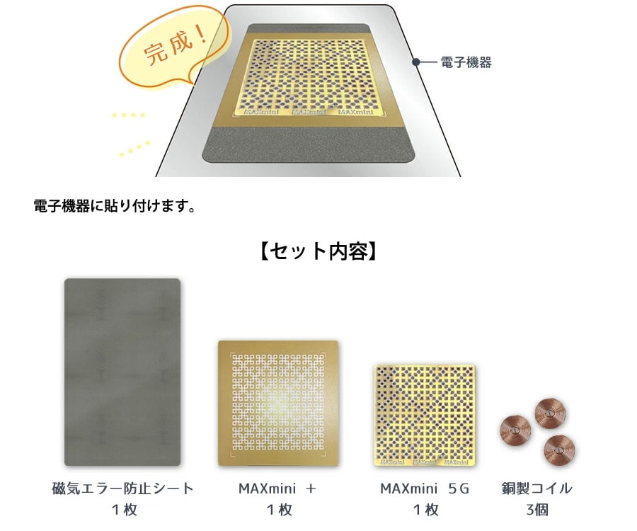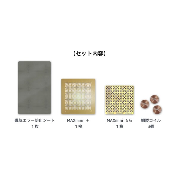 【商品詳細】 商品名: 電磁波ブロッカー MAXmini スペシャルセット 製品内容: 磁気エラー防止シート 1枚 MAXmini5G 1枚 MAXmini+ 1枚 銅製コイル 3個 サイズ: 磁気エラー防止シート 約53×85mm MAXmini5G 約43×45mm MAXmini+ 約55×55mm 銅製コイル 直径 約10mm 素材: 磁気エラー防止シート 難燃性特殊ゴム、磁性金属粉混合、アクリル系両面粘着剤 MAXmini5G 銅、粘着シート MAXmini+ 基材(PET、ナノチタンパウダー)、粘着剤(アクリル系粘着剤)、剥離紙(白紙セパレーター) 銅製コイル 銅線 ご注意: ●スマートフォン、携帯電話、PHS等にご使用の場合、電波状況、端末によっては通信機能に影響が出る場合があります。 ●MAXminiの製造の都合上、色や印刷位置に個体差があり、一部裁断ズレがありますが品質や作用に変わりはありません。 ●本製品を使用しての事故や故障、データの紛失等に関して、当社は一切責任を負いかねます。予めご了承ください。 ●本製品を用途以外の目的で使用しないでください。 ●火気の近く、高温、多湿の場所での使用・保管はしないでください。 ●幼児の手の届かない場所に保管してください。 ※スペシャルセットに使用している各パーツは独自のゼロ磁場技術を施しています。 区分: 雑貨 メーカー: 株式会社ユニカ 注意事項: 当社では複数店舗で在庫を共有しており、システムで在庫調整を行っておりますが、TV放映等による一時的な注文数の増大や、在庫の更新タイミングにより在庫にずれが生じる場合がございます。 在庫更新が間に合わずご注文頂いた商品が欠品となる場合もございます。 欠品が生じた場合や商品の発送が遅れる場合は、改めてご連絡させていただきます。 ご迷惑をお掛けする場合がございますが、あらかじめご了承くださいませ。 広告文責: 株式会社エーウィル 0747-26-5566