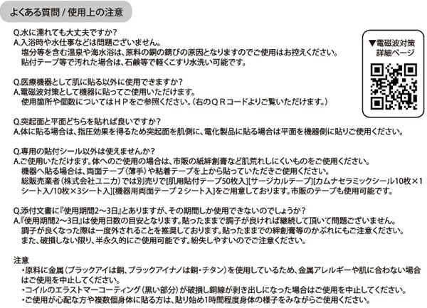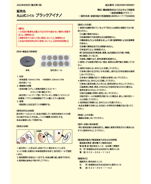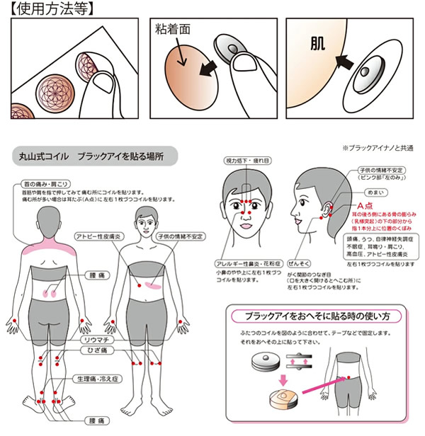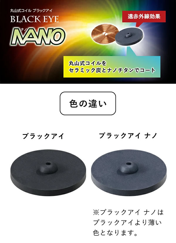 【商品詳細】 商品名: 丸山式コイル ブラックアイナノ セット内容: ブラックアイナノ 100個 両面テープ 10枚×10シート(機器貼付用両面テープ) 素材: ブラックアイナノ スチレン系熱可塑性エラストマー、セラミック炭、酸化チタン サイズ: ブラックアイナノ 直径13mm(±10%) 厚さ 2.9mm(±10%) 両面テープ 直径約12mm 厚み1mm(機器貼付用両面テープ) ※付属のテープは体貼付にはご使用いただけません。 医療機器届出番号: 23B2X00010220701 製造国: 日本 区分: 一般医療機器 発売元: 株式会社ユニカ 注意事項: 当社では複数店舗で在庫を共有しており、システムで在庫調整を行っておりますが、TV放映等による一時的な注文数の増大や、在庫の更新タイミングにより在庫にずれが生じる場合がございます。 在庫更新が間に合わずご注文頂いた商品が欠品となる場合もございます。 欠品が生じた場合や商品の発送が遅れる場合は、改めてご連絡させていただきます。 ご迷惑をお掛けする場合がございますが、あらかじめご了承くださいませ。 広告文責: 株式会社エーウィル 0747-26-5566