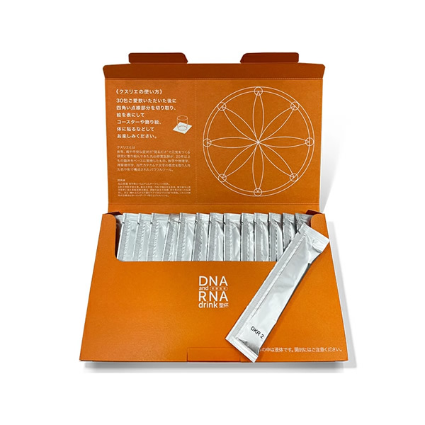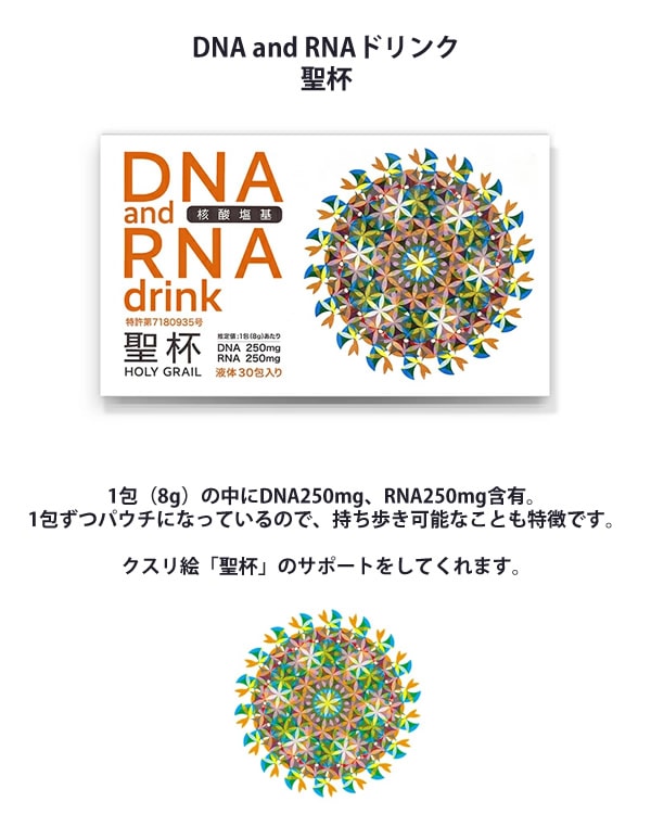 【商品詳細】 商品名: DNA and RNAドリンク 聖杯 内容量: 240g(8g×30包) 原材料: 水溶性RNAエキス末(トルラ酵母由来RNA85%含有)(国内製造)、乳糖果糖オリゴ糖、デオキシリボ核酸ナトリウム、水溶性白子核タンパク質、水溶性デオキシリボ核酸ナトリウム、亜鉛含有酵母、/L-アスコルビン酸2-グルコシド、香料、クエン酸、パントテン酸Ca、ナイアシン、ビタミンB1、ビタミンB2、ビタミンB6、ビタミンB12 栄養成分表示/1包(8g)あたり: エネルギー 3.28Kcal たんぱく質 0.64g 脂質 0.008g 炭水化物 0.0184g 食塩相当量 0.075g オリゴ糖 0.24g 原材料に含まれるアレルギー物質: 乳・サケ お召し上がり方: 栄養補助食品として1日1~3包を目安に、上下に振ってお召し上がりください。 本品は、そのままでも水やジュースで希釈してもお飲みいただけます。 希釈すると天然原料使用のため、自濁したり沈殿したりすることがあります。 ご注意: 万一、体質、体調に合わない場合は、ご使用を中止してください。 開封後は保存できません。すぐにお飲みください。 天然原料使用のため浮遊・沈殿・変色等を生じることがありますが、品質には問題ございません。 開封時に袋の切り口でけがをしないよう、また水分が飛び散る場合がありますので、衣服などに付着しないようにご注意ください。 薬の服用中、または通院中の方は、医師とご相談の上、お飲みください。 賞味期限: 枠外箱右下に掲載 保存方法: 高温多湿避けて保存してください。 製造国: 日本 区分: 健康食品 販売者: 株式会社ユニカ 製造所: 株式会社VIVID 注意事項: 当社では複数店舗で在庫を共有しており、システムで在庫調整を行っておりますが、TV放映等による一時的な注文数の増大や、在庫の更新タイミングにより在庫にずれが生じる場合がございます。 在庫更新が間に合わずご注文頂いた商品が欠品となる場合もございます。 欠品が生じた場合や商品の発送が遅れる場合は、改めてご連絡させていただきます。 ご迷惑をお掛けする場合がございますが、あらかじめご了承くださいませ。 広告文責: 株式会社エーウィル 0747-26-5566 関連キーワード: 日本製 ユニカ DNA RNA サプリメント 健康食品 クスリエ 酵母 還元型ビタミンC 亜鉛 補酵素 ディエヌエー アールエヌエー 核酸 塩基 ドリンク