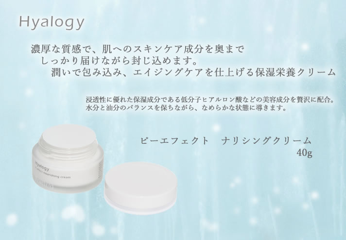 【商品詳細】 商品名: ヒアロジー ピーエフェクト ナリシングクリーム 商品説明: 濃厚な質感で、肌へのスキンケア成分を奥までしっかり届けながら封じ込めます。 潤いで包み込み、エイジングケアを仕上げる保湿栄養クリーム 浸透性に優れた保湿成分である低分子ヒアルロン酸などの美容成分を贅沢に配合。 水分と油分のバランスを保ちながら、なめらかな状態に導きます。 内容量: 40g 主成分: 低分子ヒアルロン酸、低分子EMプロテイン低分子パールプロテイン、リポソーム化コエンザイムQ10レチノール、海洋性コラーゲン、海洋性エラスチン、スクワラン、アミノセラミド 使い方・注意事項: 適量を付属のスパチュラで指先にとり、顔全体から首筋にかけてムラなく全体にのばします。その後、ゆっくりと指の腹に力を入れながら、円を描くようになじませます。 製造国:日本