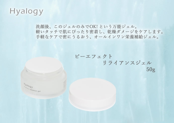 【商品詳細】 商品名: ヒアロジー ピーエフェクト リライアンスジェル 商品説明: 洗顔後、このジェルのみでOK! という万能ジェル。 軽いタッチで肌にぴったり密着し、乾燥ダメージをケアします。 手軽なケアで密にうるおう、オールインワン栄養補給ジェル。 まるで肌のサプリメント。 プルプルのジェルに、コエンザイムQ10、海洋性コラーゲン、海洋性エラスチン、浸透性ビタミンCといったすこやかな肌に必要な成分を凝縮しました。 乾燥ダメージによる肌の悩みをマルチにケアしながら、肌の保水機能を後押し。 吸いつくような、しっとり感のある肌に導きます。 手早くシンプルにケアしたい時は、洗顔後これひとつでお手入れ完了。 頼れるジェルです。 内容量: 50g 成分: 低分子ヒアルロン酸、低分子EMプロテイン、低分子パールプロテイン、リポソーム化コエンザイムQ10、海洋性コラーゲン、海洋性エラスチン、安定型ビタミンC 使い方、注意事項: 毎朝晩の洗顔後にお使いください。 適量を指先にとり、顔全体、または顔の気になる部分にやさしくマッサージするようにのばして、なじませます。 製造国:日本