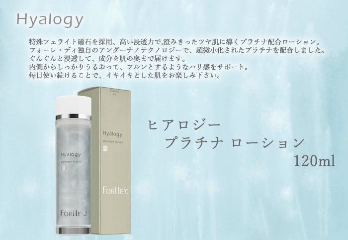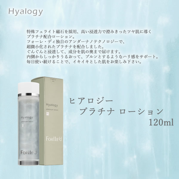 【商品詳細】 商品名: ヒアロジー プラチナ ローション 商品説明: 特殊フェライト磁石を採用、高い浸透力で,澄みきったツヤ肌に導くプラチナ配合ローション。 フォーレ・ディ独自のアンダーナノテクノロジーで、超微小化されたプラチナを配合しました。 ぐんぐんと浸透して、成分を肌の奥まで届けます。 内側からしっかりうるおって、プルンとするようなハリ感をサポート。 毎日使い続けることで、イキイキとした肌をお楽しみ下さい。 内容量: 120ml 成分: 水、BG、ヒアルロン酸Na、アルブチン、白金、加水分解卵殻膜、加水分解コンキオリン、セラミド3、酸化チタン、塩化Ca、酢酸Ca、塩化Na、塩化Mg、グリセリン、プルーン分解物、カッコンエキス、アロエベラエキス-1、クロレラエキス、ソルビトール、PEG-75、ベタイン、PCA-Na、酢酸トコフェノール、セリン、グリシン、グルタミン酸、アラニン、リシン、アルギニン、トレオニン、プロリン、ヒドロキシエチルセルロース、アルギン酸Na、PEG-60水添ヒマシ油、マイカ、グリチルリチン酸2K、エトキシグリコール、フェノキシエタノール、メチルパラベン、プロピルパラベン 使い方・注意事項: 適量を手のひらに取り、顔全体から首筋にかけてなじませ毎朝晩の洗顔後にご使用下さい。 使用時には容器を2~3回軽く振ってからご使用下さい。 製造国:日本