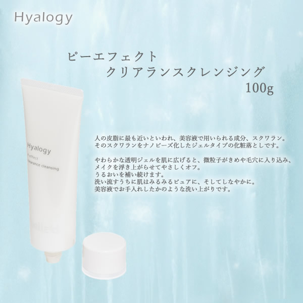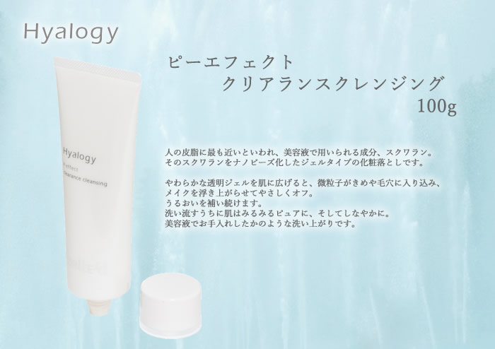 【商品詳細】 商品名: ヒアロジー ピーエフェクト クリアランスクレンジング 商品説明: 人の皮脂に最も近いといわれ、美容液で用いられる成分、スクワラン。 そのスクワランをナノビーズ化したジェルタイプの化粧落としです。 やわらかな透明ジェルを肌に広げると、微粒子がきめや毛穴に入り込み、メイクを浮き上がらせてやさしくオフ。 うるおいを補い続けます。 洗い流すうちに肌はみるみるピュアに、そしてしなやかに。 美容液でお手入れしたかのような洗い上がりです。 内容量: 100g 成分: 低分子ヒアルロン酸、低分子EMプロテイン、低分子パールプロテイン、イオン化スクワラン 使い方・注意事項: 適量を顔や手が乾いた状態で手のひらにとり、指先で円を描くようにメイクアップ料や皮脂とよくなじませます。 その後、水またはぬるま湯で十分に洗い流してください。 製造国:日本