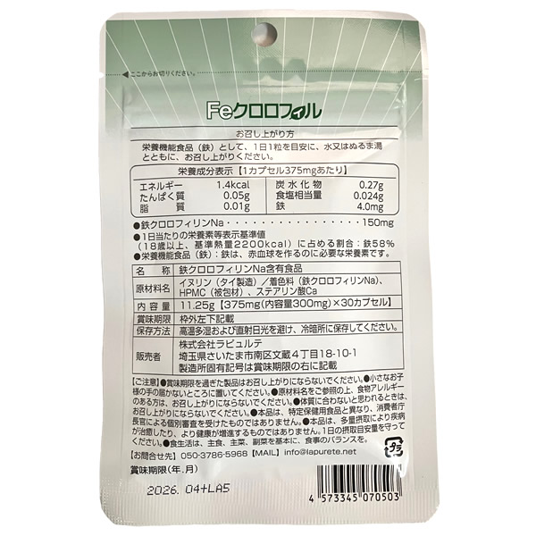 【商品詳細】 商品名: Feクロロフィル 内容量: 11.25g(375mg×30カプセル) 原材料: イヌリン(タイ製造)/着色料(鉄クロロフィリンNa)、HPMC(被包材)、ステアリン酸Ca お召し上がり方: 栄養機能食品(鉄)として、1日1カプセルを目安に、水又はぬるま湯とともに、お召し上がり下さい。 保存方法: 高温多湿および直射日光を避け、冷暗所に保存してください。 ご注意: ●賞味期限を過ぎた製品はお召し上がりにならないでください。 ●小さなお子様の手の届かないところに置いてください。 ●原材料名をご参照の上、食物アレルギーのある方はお召し上がりにならないでください。 ●体質に合わないと思われるときは、お召し上がりにならないでください。 ●本品は、特定保健用食品とは異なり、消費者庁長官による個別審査を受けたものではありません。 ●本品は多量摂取により疾病が治癒したり、より健康が増進するものではありません。1日の摂取目安量を守ってください。 ●食生活は、主食、主菜、副菜、を基本に、食事のバランスを。 生産国: 日本 区分: 栄養機能食品 販売者: 株式会社ラピュルテ 注意事項: 当社では複数店舗で在庫を共有しており、システムで在庫調整を行っておりますが、TV放映等による一時的な注文数の増大や、在庫の更新タイミングにより在庫にずれが生じる場合がございます。 在庫更新が間に合わずご注文頂いた商品が欠品となる場合もございます。 欠品が生じた場合や商品の発送が遅れる場合は、改めてご連絡させていただきます。 ご迷惑をお掛けする場合がございますが、あらかじめご了承くださいませ。 広告文責: 株式会社エーウィル 0747-26-5566