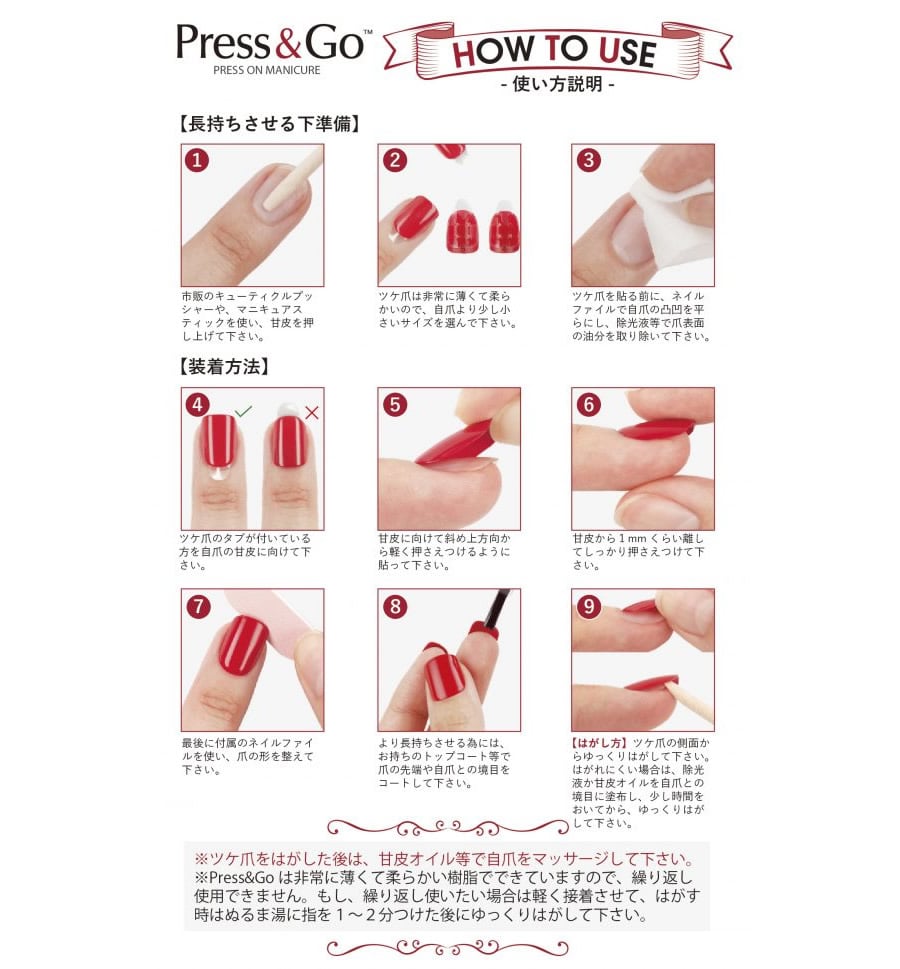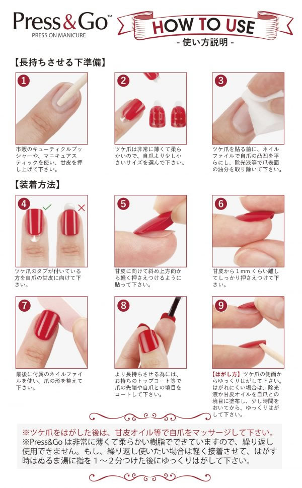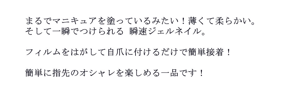 【商品詳細】 商品名: KISS NEW YORK プレス&ゴー ラグジュアリー 商品説明: まるでマニキュアを塗っているみたい!薄くて柔らかい。 そして一瞬でつけられる瞬速ジェルネイル。 フィルムをはがして自爪に付けるだけで簡単接着! 簡単に指先のオシャレを楽しめる一品です! 種類: #10(LPG10J) #19(LPG19J) #20(LPG20J) #21(LPG21J) #22(LPG22J) #23(LPG23J) #24(LPG24J) #34(LPG34J) #35(LPG35J) #36(LPG36J) #37(LPG37J) #38(LPG38J) #39(LPG39J) #40(LPG40J) #41(LPG41J) #42(LPG42J) #43(LPG43J) #44(LPG44J) #45(LPG45J) #46(LPG46J) #48(LPG48J) #50(LPG50J) #51(LPG51J) #52(LPG52J) #54(LPG54J) #55(LPG55J) #56(LPG56J) #57(LPG57J) #58(LPG58J) #59(LPG59J) 装着方法: 自爪の汚れやマニキュアなどをきれいに拭き取り、しっかり手を洗ってください。 お手持ちのコットンやティッシュペーパーなどで、爪表面をきれいに拭いてください。 自爪に合ったPress&Goを選んでください。もしサイズが合わない場合はネイルファイルを使ってサイズを調整してください。装着前にはプッシャーで甘皮を押し上げてください。 Press&Goの裏面の粘着フィルムをはがし、タブが付いていた方を甘皮に向けて斜め上方向から軽く押さえ付けるように貼ってください。(甘皮から1mm程度離して貼ってください) 親指を使ってしっかり密着するまで押し付けてください。 はがし方: Press&Goの側面からゆっくりとはがしてください。 はがれにくい場合は、お手持ちの除光液か甘皮オイルを自爪との境目に塗布し、1分程待ってからゆっくりはがしてください。 はがした後は、手をきれいに洗い、甘皮オイル等で爪全体をマッサージしてください。 使用上のご注意: ●アレルギー体質の方及び爪に異常がある方は使用しないでください。 ●子供の手の届かない所に保管してください。 ●衛生管理をしっかり行い、爪に異常を感じたら医師にご相談ください。 製造国: 中国 区分: 美容雑貨 メーカー: 株式会社KISS JAPAN 注意事項: 当社では複数店舗で在庫を共有しており、システムで在庫調整を行っておりますが、TV放映等による一時的な注文数の増大や、在庫の更新タイミングにより在庫にずれが生じる場合がございます。 在庫更新が間に合わずご注文頂いた商品が欠品となる場合もございます。 欠品が生じた場合や商品の発送が遅れる場合は、改めてご連絡させていただきます。 ご迷惑をお掛けする場合がございますが、あらかじめご了承くださいませ。 広告文責: 株式会社エーウィル 0747-26-5566