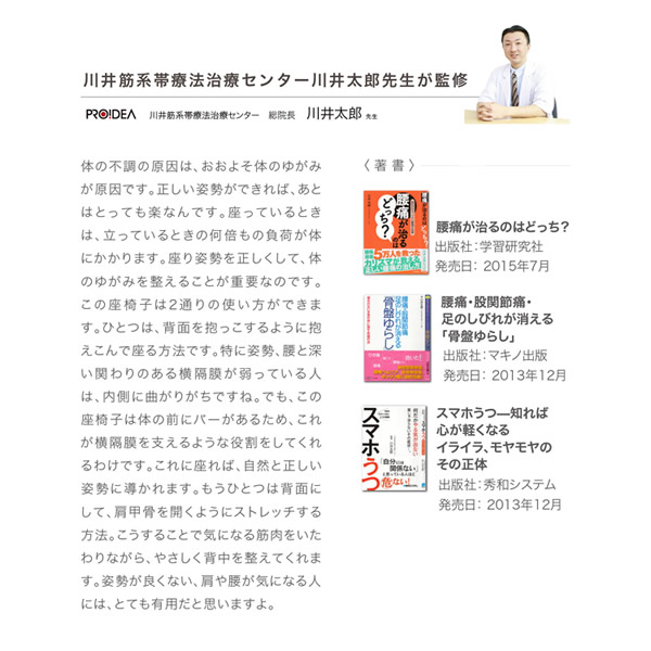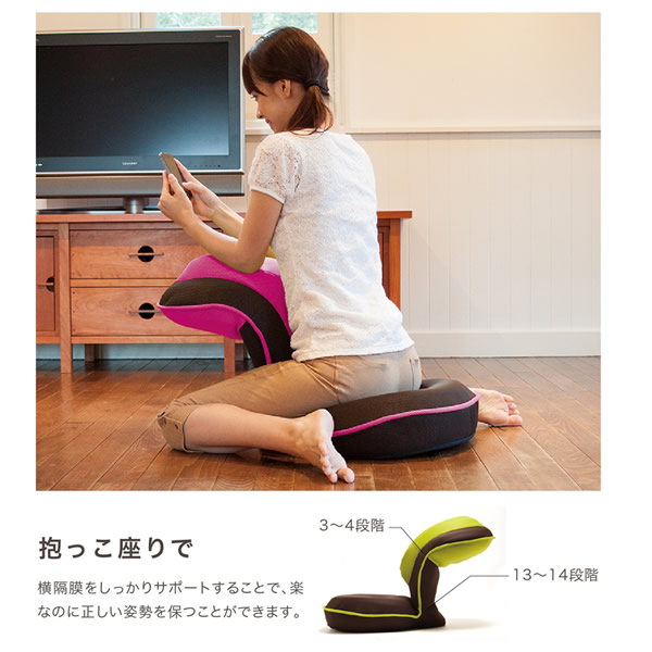 抱っこするように抱え込んで座る方法です。特に姿勢・腰と深い関わりのある横隔膜が弱っている人は、身体が内側に丸まりがちです。この座り方では背もたれのクッションが身体の前にくるため、これが横隔膜を支えるような役割をしてくれます。