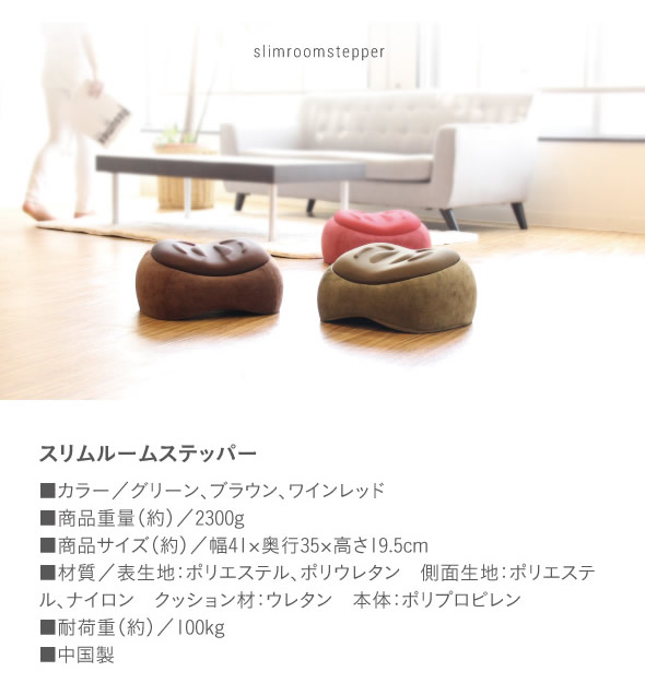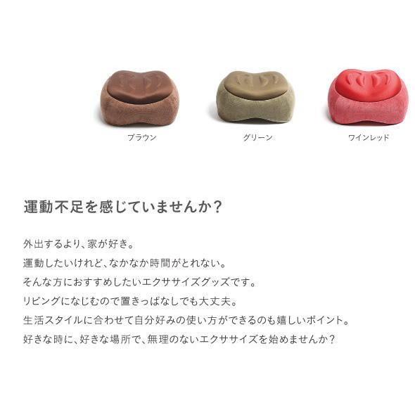 【商品詳細】 商品名: スリムルームステッパー 商品説明: 自宅で砂浜感覚ウォーキング。 短い時間で効果的に昇降運動! 自宅で簡単・手軽な運動で、効率的にエクササイズしたい方におすすめのスリムルームステッパー。 昇降運動とストレッチが手軽にできるうえ、骨盤クッションとしても使用可能。 1.エクササイズ:しっかり筋肉を使える本格派。 2.ストレッチ:下半身のストレッチでふくらはぎスッキリ。 3.リラックス:足枕として、骨盤クッションとしても使えます。 商品特長 ・負荷のかかるやわらか素材 ・こだわりの傾斜角度 ・足裏リラックス構造 カラー: ブラウン グリーン ワインレッド サイズ: 約41×35×19.5cm 材質: 表生地:ポリエステル、ポリウレタン 側面生地:ポリエステル、ナイロン クッション材:ウレタン 本体:ポリプロピレン 区分: 雑貨 原産国: 中国 メーカー: 株式会社ドリーム 広告文責: 株式会社エーウィル 0747-26-5566
