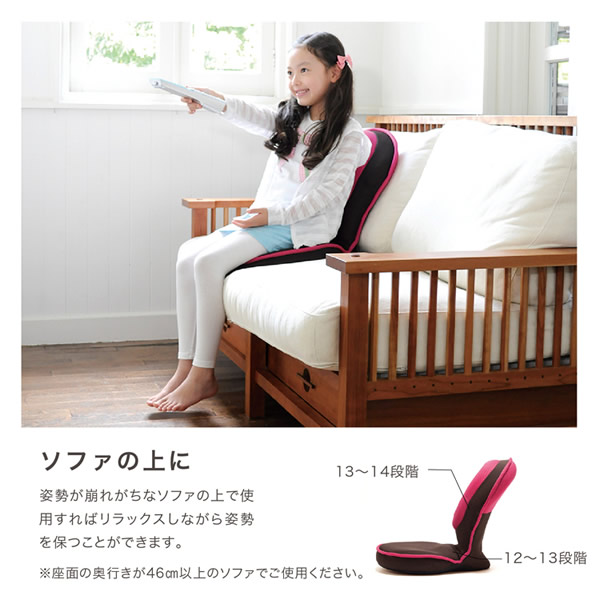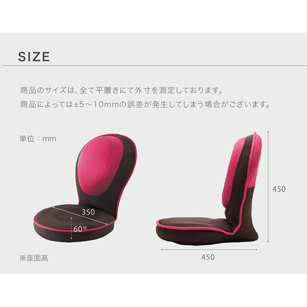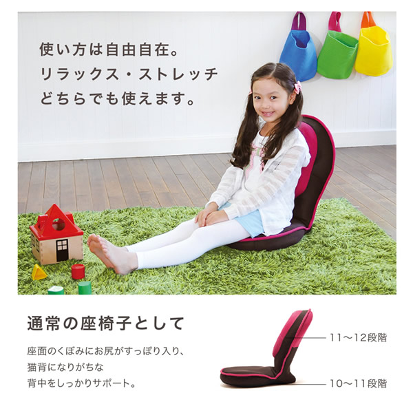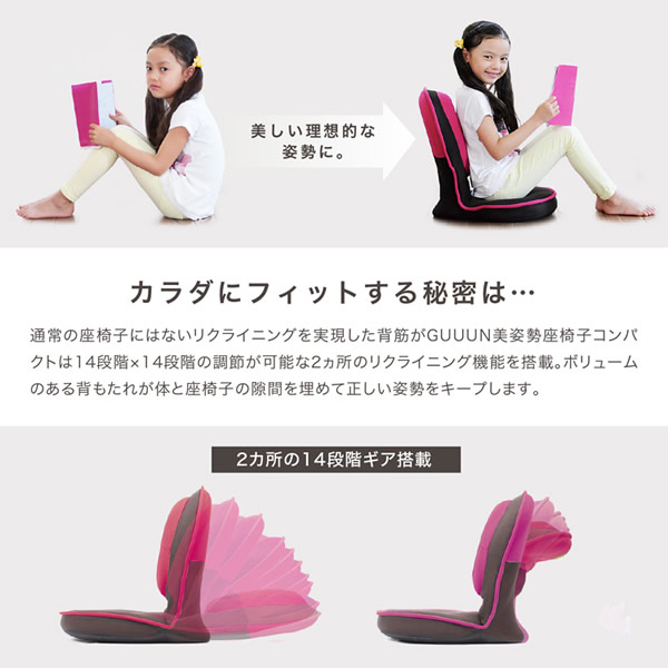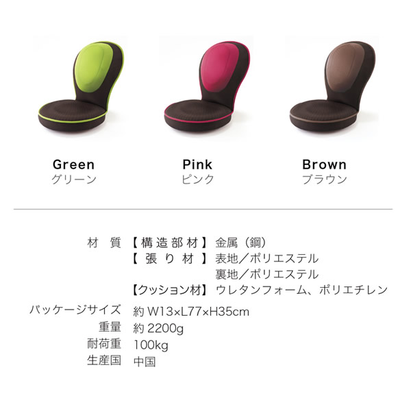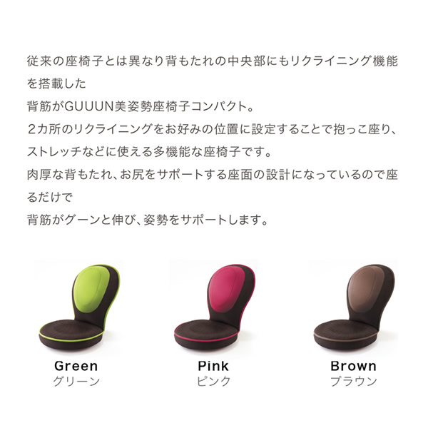 【商品詳細】 商品名: 背筋がGUUUN 美姿勢座椅子 コンパクト 商品説明: 腰が辛い、背中がはる!そんな人ほど実感できる長時間離れられなくなる居心地最高のプライベート座椅子【背筋がGUUUN美姿勢座椅子】 大人気GUUUN座椅子シリーズにコンパクトタイプ登場! 一回り小さくなっても、おなじみの機能のまま! ◆肉厚クッション+2つの14段階リクライニング! 背もたれのリクライニングはもちろん背中クッションがなんと90度に曲がっちゃうんです。 機能1:椅子の上でも姿勢がよくなりやる気アップ! 椅子の上でも使用できます。無理せず良い姿勢が保てるので、こどものやる気アップにもつながります。 機能2:矯正せず、自然と正しい姿勢に 座るだけで自然と正しい姿勢に導かれるので、じっとしていられない子どもでも自然と正しい姿勢で座ることができます。 機能3:読書やゲームのリラックスシーンにも ついついソファなどでリラックスしているときなどは、姿勢が悪くなりがち。ゲームをするときや、漫画、読書をするときにもぴったり。 ※当該商品は、お子様にもご使用頂ける仕様となっております。 カラー: グリーン ピンク ブラウン 素材・品質: 構造部材 金属(鋼) 張り材 ポリエステル クッション材 ウレタンフォーム、ポリエチレン 本体サイズ・重量: 本体サイズ 幅35cm×奥行45cm(45~77cm)×高さ12cm(12~45cm) 重量 2200g 区分: 雑貨 生産国: 中国 メーカー: 株式会社ドリーム 広告文責: 株式会社エーウィル 0747-26-5566