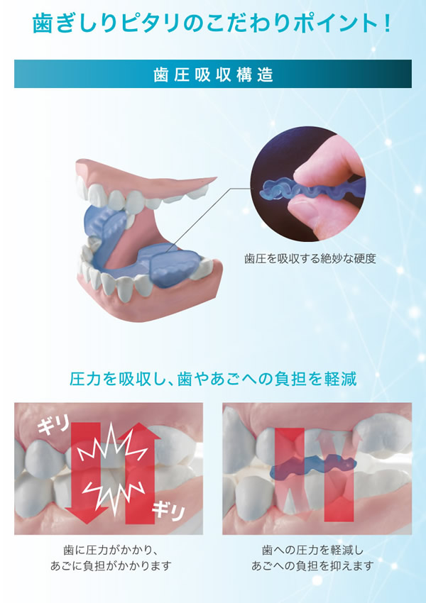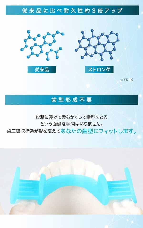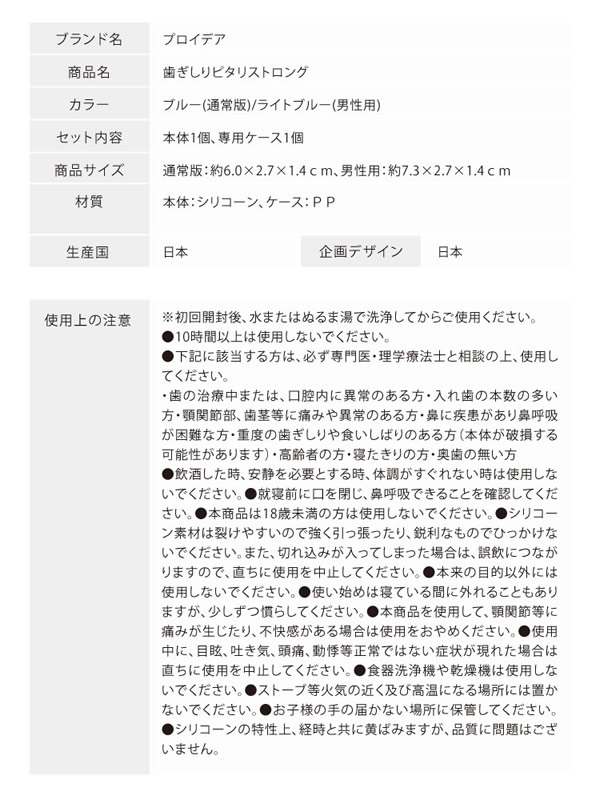 【商品詳細】 商品名: 歯ぎしりピタリ ストロング 商品説明: 歯医者さんと共同開発しました。 食いしばりは、歯を激しく摩耗し、ひどい知覚過敏や歯周病を引き起こします。 肩こりや頭痛、そしてなぜか腰痛やひざ痛まで引き起こし、全身の筋肉と神経を疲労させます。 また、歯ぎしり音はが周りに迷惑をかけるので後ろめたい気持ちになりがちです。 当商品は、寝る時にはめるだけで歯ぎしりや食いしばりを簡単に防ぐことができます。 噛み合わせ矯正ではないので、失敗が多い面倒な型どりが必要ありません。 寝る時にはめるだけで歯圧が吸収分散し、奥歯に負担をかけることなくピタっと止まります。 従来品よりも耐久性が約3倍アップ!男性でもお使いいただけるストロングタイプになりました。 カラー: ブルー ライトブルー サイズ: ブルー 6.0×2.7×1.4cm ライトブルー 7.3×2.7×1.4cm 材質: 本体 シリコーン ケース PP 区分: 雑貨 生産国: 日本 メーカー: 株式会社ドリーム 広告文責: 株式会社エーウィル 0747-26-5566