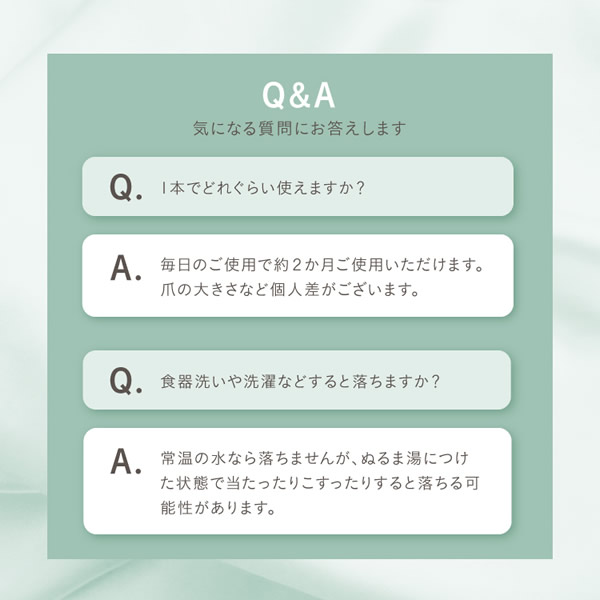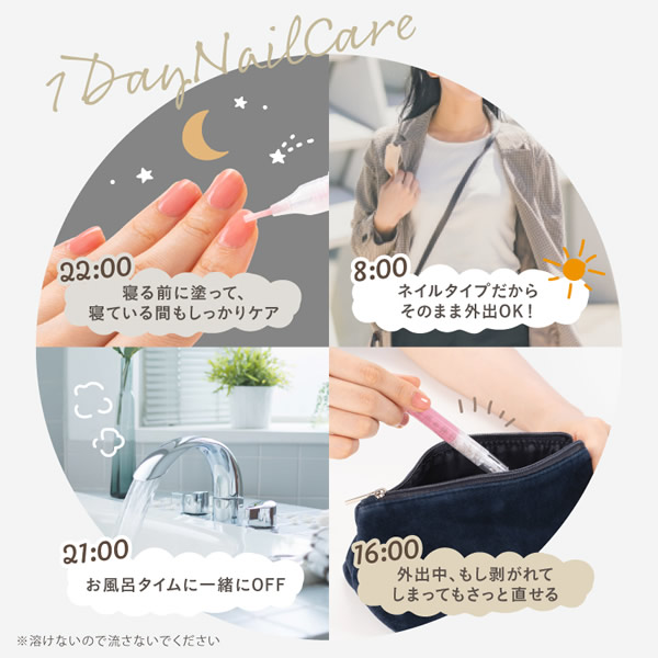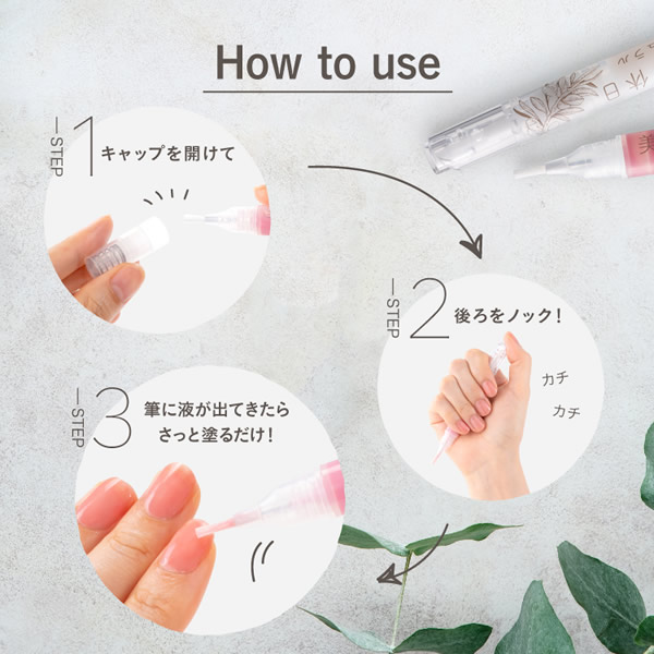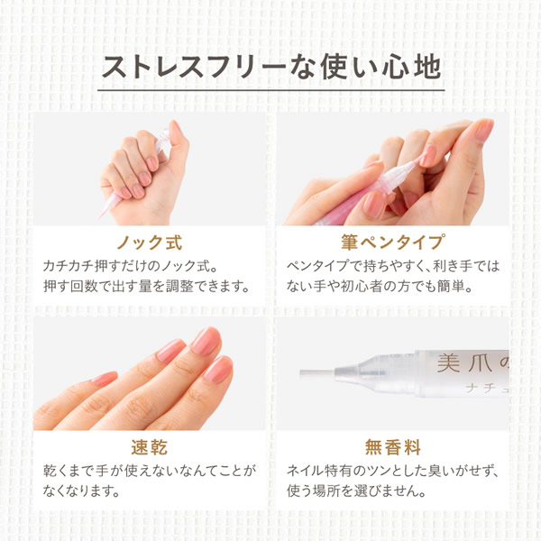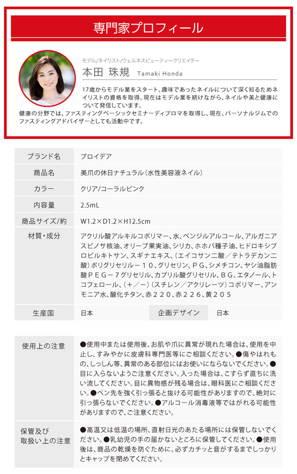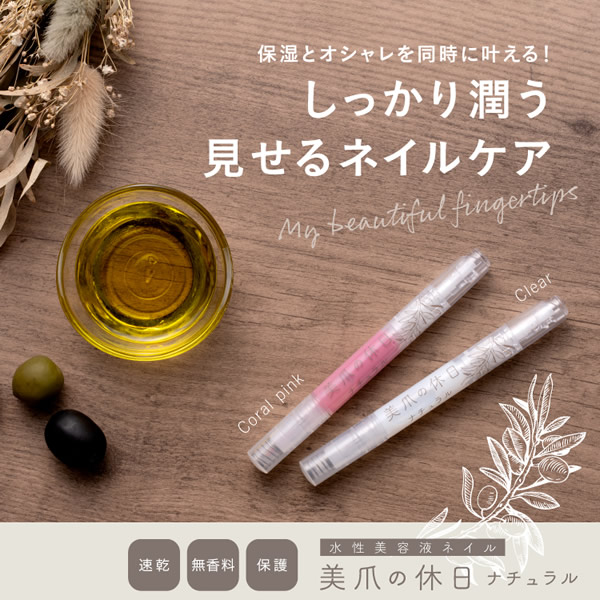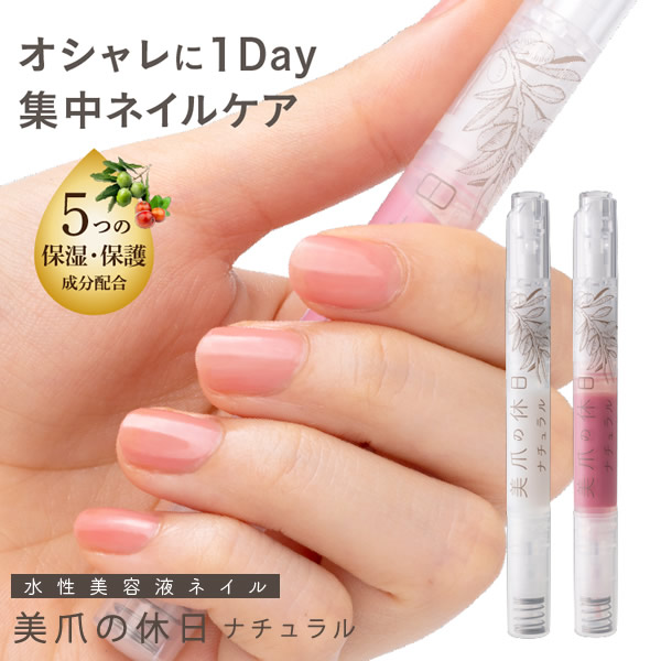 【商品詳細】 商品名: 美爪の休日ナチュラル 商品説明: ボロボロ爪をキレイに隠しながらケアする、ウォーターベースの美容液ネイル。 オイルを3種類配合したことでダメージ爪に潤いを与えて補修(コーティング効果)。 自然な発色で上品にほんのり色づきます。 筆ペンタイプで塗りやすくネイルが苦手な人も簡単。 速乾なので忙しい人も、いつでもどこでもネイルケアできます。 お湯でペロリと剥がせるので、除光液で爪を傷める心配もありません。 ツンとしたネイル特有のイヤなにおいがしないためにおいが苦手な方でも塗りやすいです。 また、無香料タイプなので塗布後もご自身な好きな香りを邪魔しません。 カラー: クリア コーラルピンク 商品サイズ: W1.2×D1.2×H12.5cm パッケージサイズ: W2.5×D2.0×H12.7cm 重量・内容量: 12.3g 2.5ml 素材・品質: アクリル酸アルキルコポリマー、水、ベンジルアルコール、アルガニアスピノサ核油、オリーブ果実油、シリカ、ホホバ種子油、ヒドロキシプロピルキトサン、スギナエキス、(エイコサン二酸/テトラデカン二酸)ポリグリセリル-10、グリセリン、PG、シメチコン、ヤシ油脂肪酸PEG-7グリセリル、カプリル酸グリセリル、BG、エタノール、トコフェロール、(+/-)(スチレン/アクリレーツ)コポリマー、アンモニア水、酸化チタン、赤220、赤226、黄205 原産国: 日本 メーカー: 株式会社ドリーム 注意事項: 当社では複数店舗で在庫を共有しており、システムで在庫調整を行っておりますが、TV放映等による一時的な注文数の増大や、在庫の更新タイミングにより在庫にずれが生じる場合がございます。 在庫更新が間に合わずご注文頂いた商品が欠品となる場合もございます。 欠品が生じた場合や商品の発送が遅れる場合は、改めてご連絡させていただきます。 ご迷惑をお掛けする場合がございますが、あらかじめご了承くださいませ。 広告文責: 株式会社エーウィル 0747-26-5566