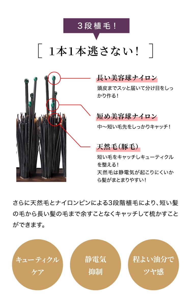 【商品詳細】 商品名: 熊本艶髪ブラシ ボリュームアップ 商品説明: 熊本艶髪ブラシはふんわりとしたボリューム感のある髪型に簡単にスタイリングができるヘアブラシです。 秘密は210度の範囲で3段階に植毛されたブラシの構造にあります。 短い毛から長い毛までしっかりとキャッチし立ち上げることで、ふんわり感を演出します。 ブラシ自体はナイロンピンと天然毛(豚毛)の混合植毛となっており、ナイロンの先にはセラミドとフコイダン成分がマイクロカプセルとなり配合されております。 梳かす度に艶やかな髪を目指せます。 カラー: ブラック 素材: ハンドル部 / ABS樹脂 毛 / ナイロン、豚毛 先玉 / ウレタン 商品サイズ: 6.2×4.3×21.5cm 重量: 60g 原産国: 日本 区分: 雑貨 メーカー: 株式会社ドリーム 注意事項: 当社では複数店舗で在庫を共有しており、システムで在庫調整を行っておりますが、TV放映等による一時的な注文数の増大や、在庫の更新タイミングにより在庫にずれが生じる場合がございます。 在庫更新が間に合わずご注文頂いた商品が欠品となる場合もございます。 欠品が生じた場合や商品の発送が遅れる場合は、改めてご連絡させていただきます。 ご迷惑をお掛けする場合がございますが、あらかじめご了承くださいませ。 広告文責:株式会社エーウィル 0747-26-5566