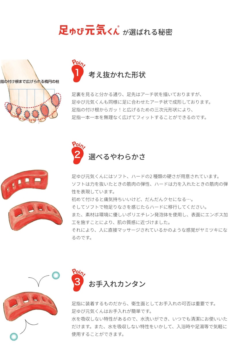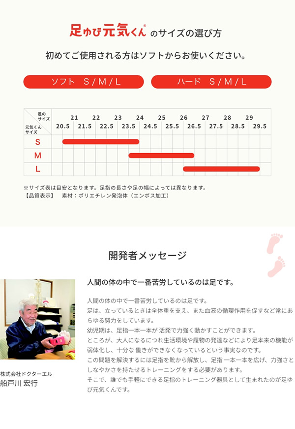 【商品詳細】 商品名: 足ゆび元気くん 商品説明: 足に合わせた形状だから痛気持ちいい! 足の形状に合わせた3次元形状により、足指1本1本にフィットします。 指を無理なく、付け根からしっかり広げることが可能です。 ソフトタイプは、リラックス状態の筋肉の柔らかさに近づけています。初めての方におすすめ! ハードタイプは力を入れた時の筋肉の弾性の硬さがあります。ソフトが物足りない方におすすめ! 表面は肌の質感に近づけたエンボス加工、素材は地球にやさしいポリエチレン発泡体を使用しています。 足ゆび元気くんは水を吸収しません。入浴時に使用した場合はサッと拭くだけなので衛生的にも安心して使えます。 タイプ: ソフト ハード サイズ: Sサイズ(20.5cm~24cm程度) Mサイズ(23.5cm~26.5cm程度) Lサイズ(26cm~29.5cm程度) カラー: 赤 青 素材: 発泡ポリエチレン(熱圧成型特殊エンボス加工) 装着方法: 指を1本1本広げて順に装着します。 指の付け根までしっかり装着してください。 製造国: 日本 区分: 健康グッズ メーカー: 株式会社ドクターエル 注意事項: 当社では複数店舗で在庫を共有しており、システムで在庫調整を行っておりますが、TV放映等による一時的な注文数の増大や、在庫の更新タイミングにより在庫にずれが生じる場合がございます。 在庫更新が間に合わずご注文頂いた商品が欠品となる場合もございます。 欠品が生じた場合や商品の発送が遅れる場合は、改めてご連絡させていただきます。 ご迷惑をお掛けする場合がございますが、あらかじめご了承くださいませ。 広告文責: 株式会社エーウィル 0747-26-5566 関連キーワード: 外反母趾 内反小趾 浮指 足指 対策 サポーター スポーツ 予防 健康器具 健康グッズ ハイヒール パンプス トレーニング フットケア 足指元気君 ドクターエル ソフト ハード ポリエチレン レッド ブルー