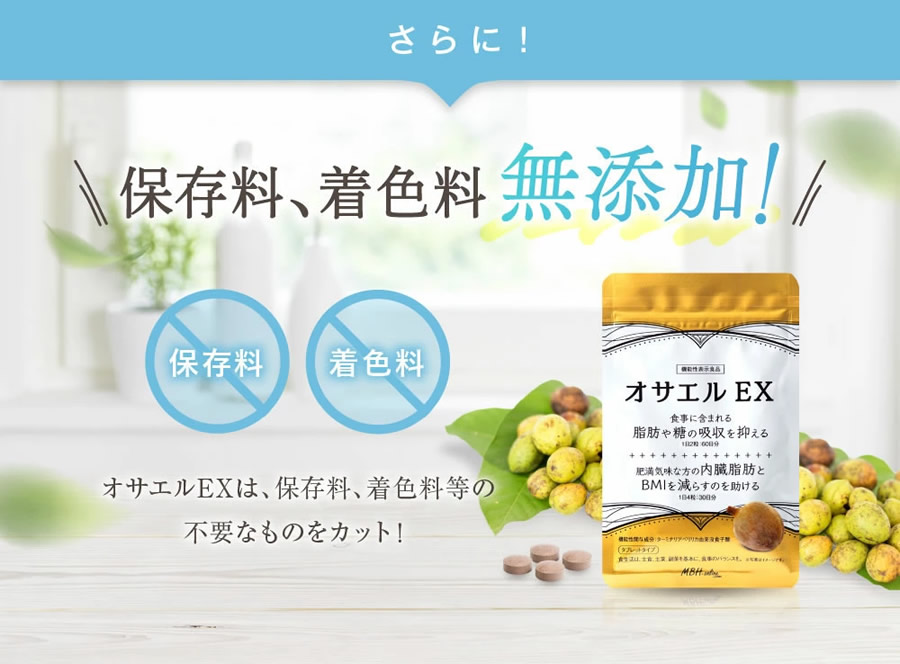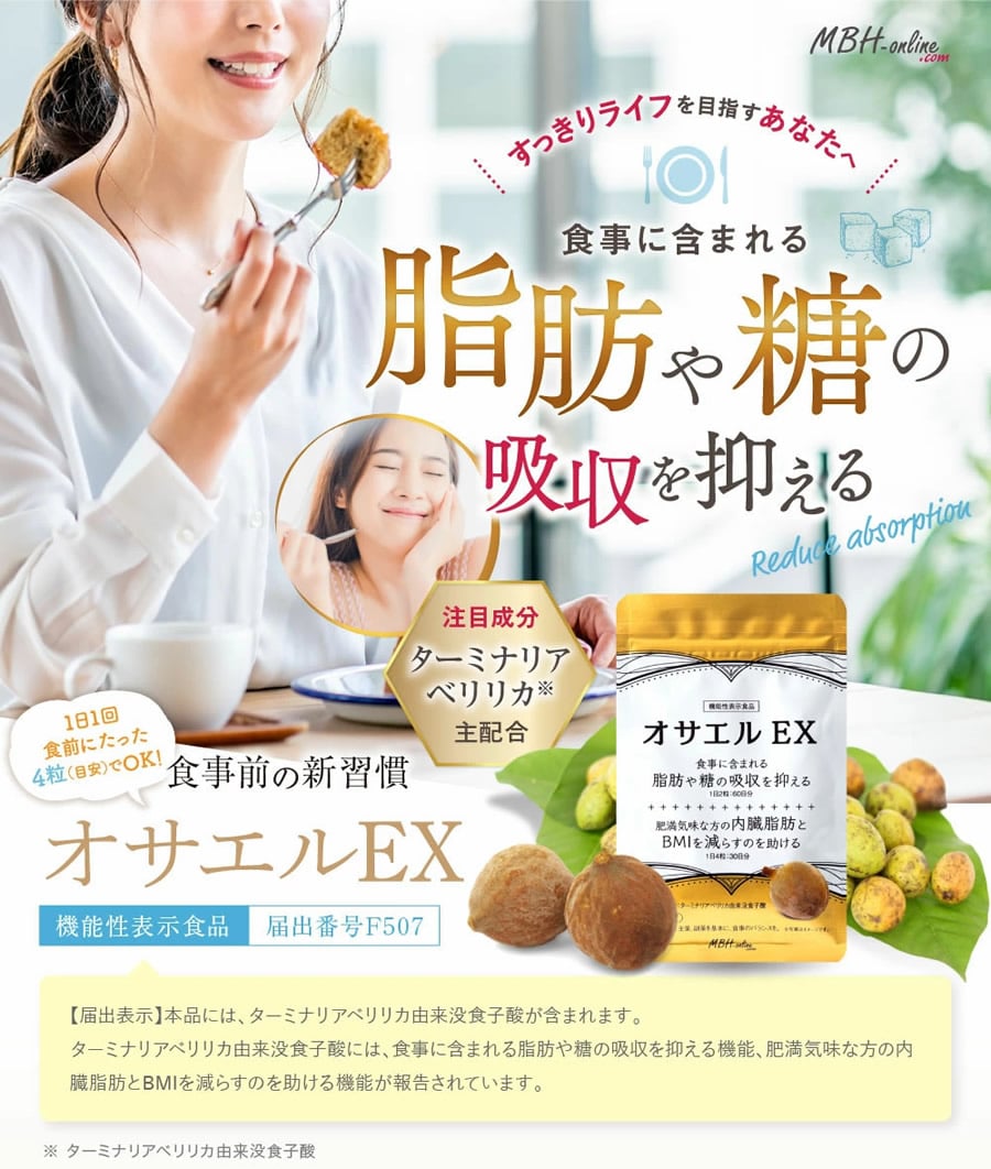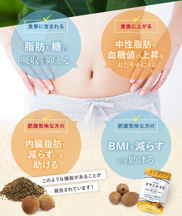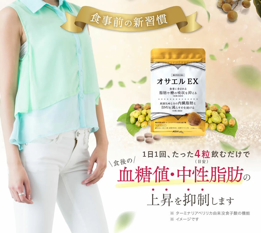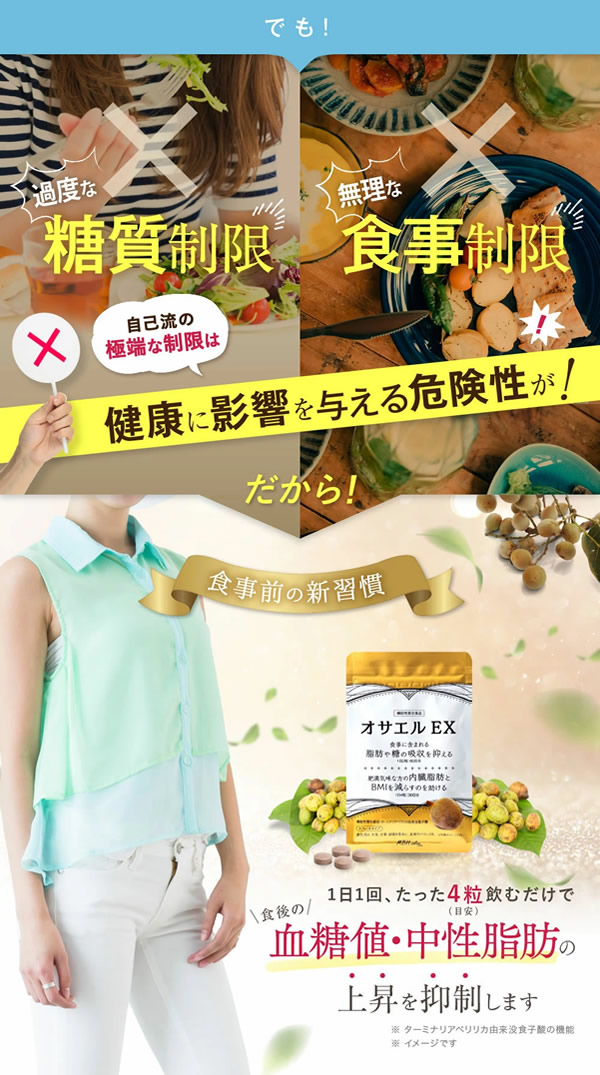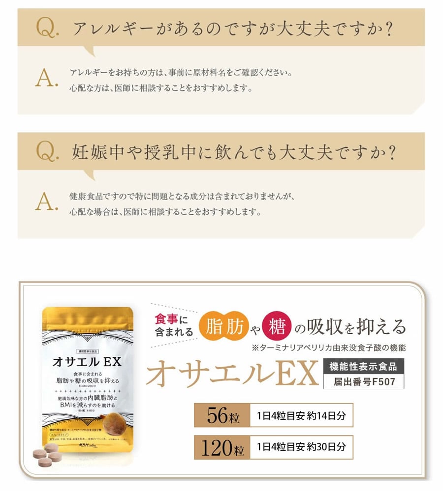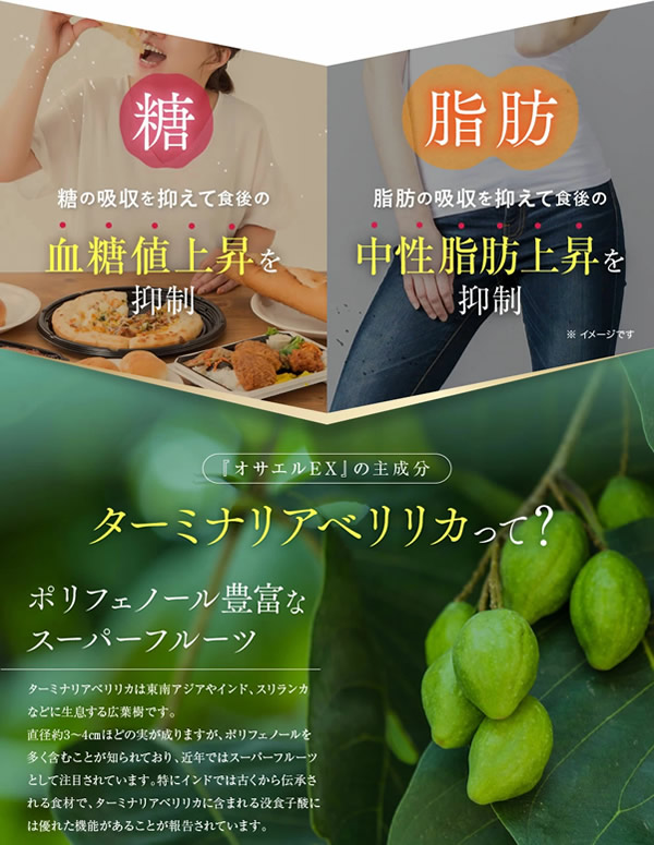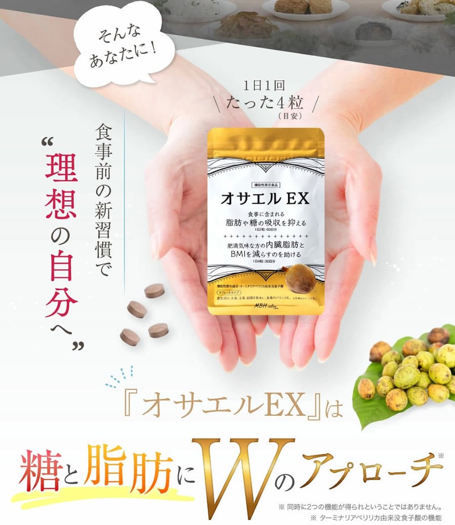 【商品詳細】 商品名: オサエルEX 商品説明: 脂肪や糖の吸収を抑える機能性表示食品。食事前の新習慣で理想の自分へ。 ターミナリアベリリカ配合(※ターミナリアベリリカ由来没食子酸)で糖と脂肪にアプローチ。 食後の血糖値、中性脂肪の上昇を抑制。 内容量: 12.32g(220mg×56粒) 原材料名: ターミナリアベリリカ抽出物(インド製造)、還元麦芽糖/セルロース、ステアリン酸カルシウム、二酸化ケイ素 栄養成分表示(2粒あたり): エネルギー 1.2~2kcal たんぱく質 0.01~0.04g 脂質 0.01g 炭水化物 0.35g 食塩相当量 0~0.01g 機能性関与成分 ターミナリアベリリカ由来没食子酸 20.8mg お召し上がり方: 【摂取の方法】食事の前を目安に、噛まずに水またはぬるま湯でお召し上がりください。 【一日摂取目安量】食後の中性脂肪や血糖値が気になる方は1日当たり2粒(2粒を1回)を、肥満気味で内臓脂肪が気になる方は1日当たり4粒(2粒を2回)を目安にお召し上がりください。 保存方法: 高温、多湿及び直射日光を避けて保存してください。 使用上の注意: 【摂取上の注意】 ●多量摂取により疾病が治癒したり、より健康が増進するものではありません。 ●1日の摂取目安量をお守りください。また、妊娠中の方はあるいは妊娠の可能性のある方は医師に相談してください。 ●鉄の吸収を阻害する可能性がありますので、貧血のお薬を服用している方はご注意ください。 【その他の注意】 ●食物アレルギーのある方は原材料をご確認の上、お召し上がりください。 ●開封後は、お早めにお召し上がりください。また、品質保持のため、チャックをしっかり閉めた状態で保存してください。 ●本品は天産物を使用しておりますので、収穫時期などにより色・風味のばらつきがございますが、品質に問題はありません。 ●原料由来の斑点や色ムラが見られることがございますが、品質に問題はありません。 ●乾燥剤が入っていますので、お召し上がりにならないようにご注意ください。 ●乳幼児の手の届かないところに保存してください。 ●本品は、事業者の責任において特定の保健の目的が期待できる旨を表示するものとして、消費者庁長官に届出されたものです。ただし、特定保健用食品と異なり、消費者庁長官による個別審査を受けたものではありません。 ●本品は、疾病の診断、治療、予防を目的としたものではありません。 ●本品は、疾病に罹患している者、未成年者、妊産婦(妊娠を計画している者を含む。)及び授乳婦を対象に開発された食品ではありません。 ●疾病に罹患している場合は医師に、医薬品を服用している場合は医師、薬剤師に相談してください。 ●体調に異変を感じた際は、速やかに摂取を中止し、医師に相談してください。 製造国: 日本 区分: 機能性表示食品 届出番号: F507 届出表示: 本品には、ターミナリアベリリカ由来没食子酸が含まれます。 ターミナリアベリリカ由来没食子酸には、食事に含まれる脂肪や糖の吸収を抑える機能、肥満気味な方の内臓脂肪とBMIを減らすのを助ける機能が報告されています。 メーカー: 株式会社マッチバンク 注意事項: 当社では複数店舗で在庫を共有しており、システムで在庫調整を行っておりますが、TV放映等による一時的な注文数の増大や、在庫の更新タイミングにより在庫にずれが生じる場合がございます。 在庫更新が間に合わずご注文頂いた商品が欠品となる場合もございます。 欠品が生じた場合や商品の発送が遅れる場合は、改めてご連絡させていただきます。 ご迷惑をお掛けする場合がございますが、あらかじめご了承くださいませ。 広告文責: 株式会社エーウィル 0747-26-5566