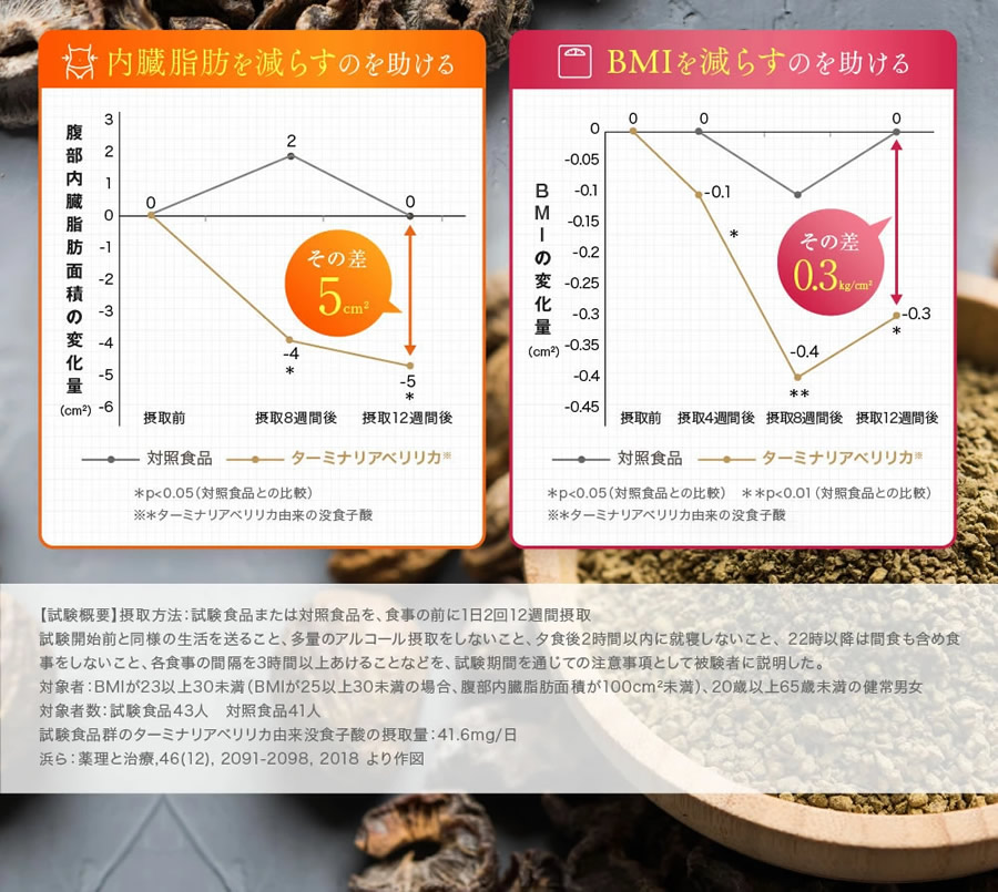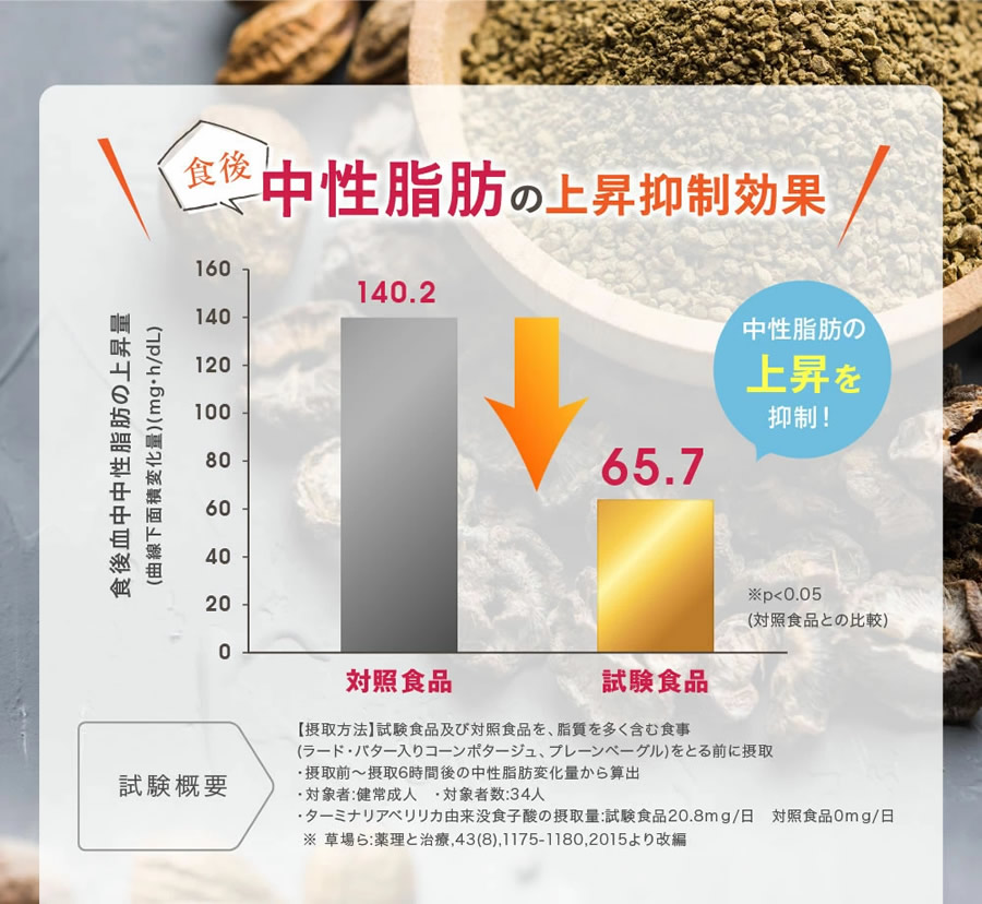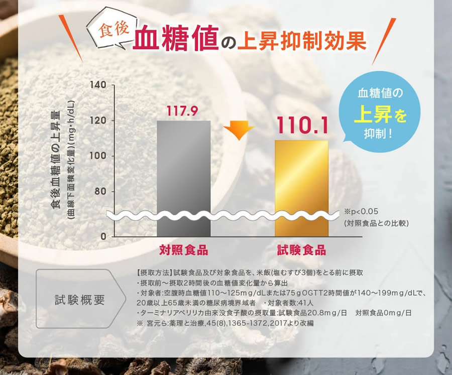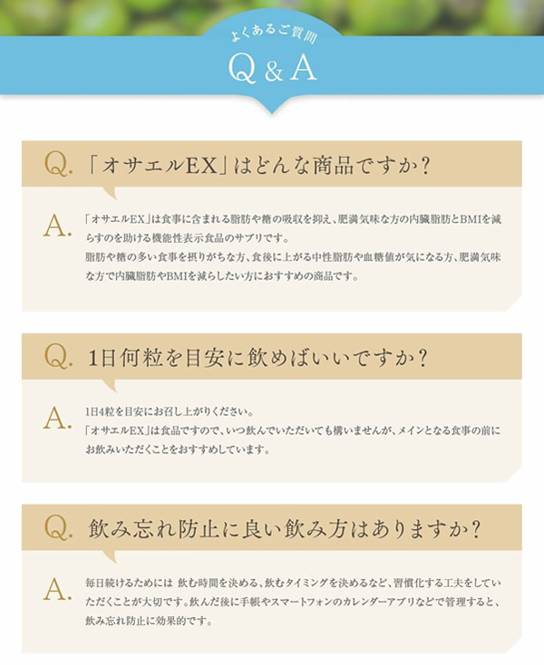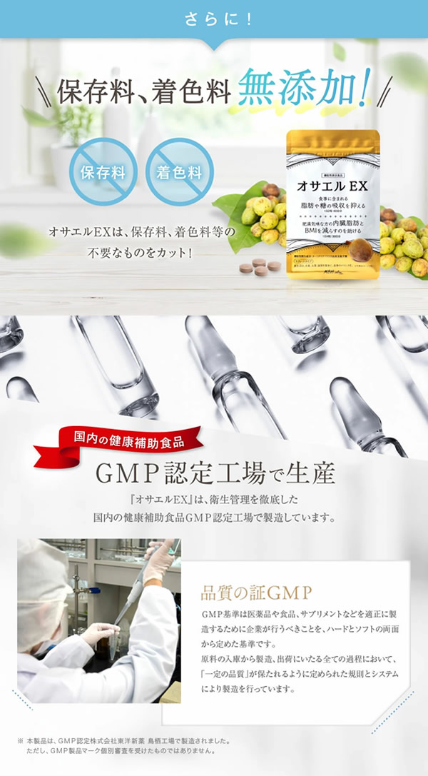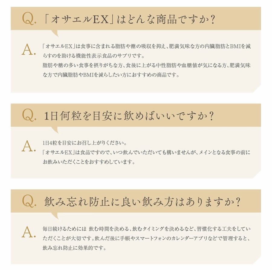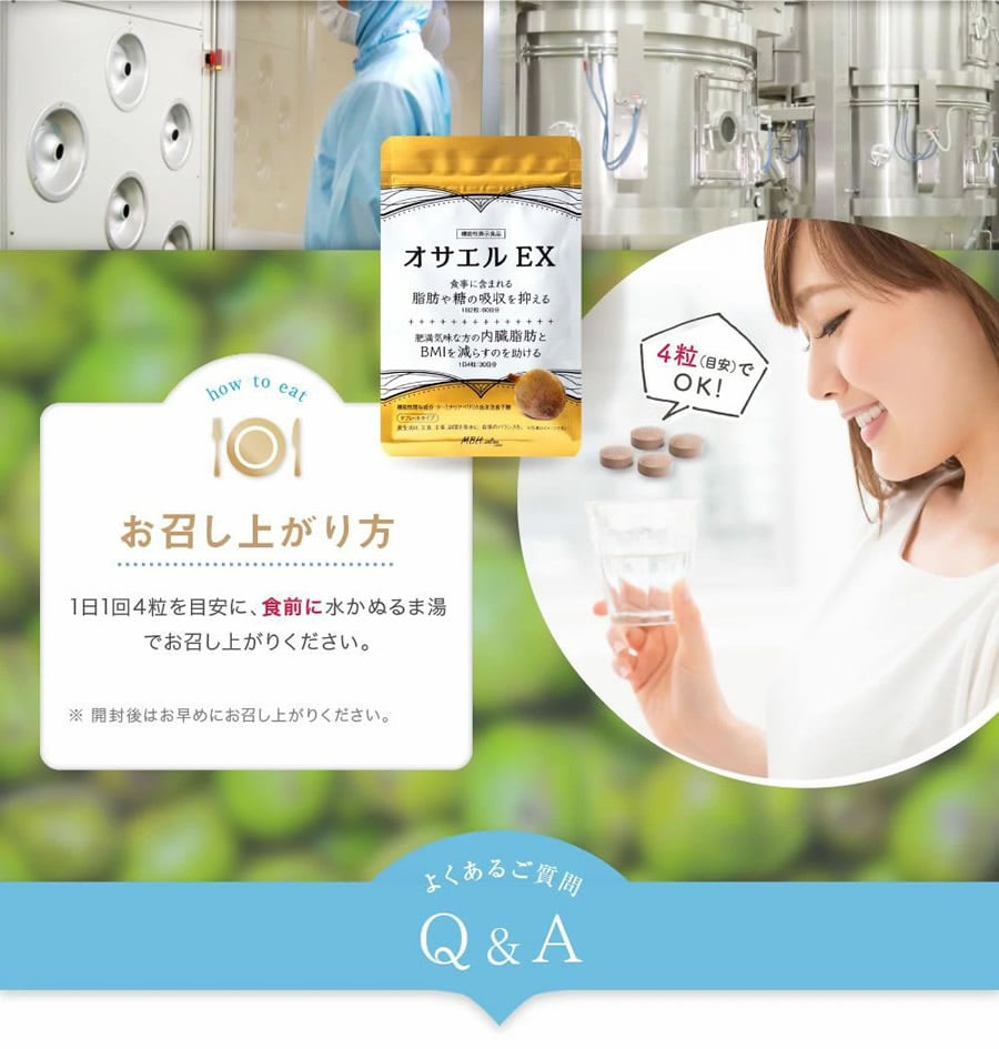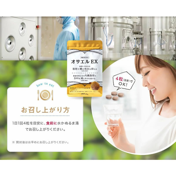 【商品詳細】 商品名: オサエルEX 商品説明: 脂肪や糖の吸収を抑える機能性表示食品。食事前の新習慣で理想の自分へ。 ターミナリアベリリカ配合(※ターミナリアベリリカ由来没食子酸)で糖と脂肪にアプローチ。 食後の血糖値、中性脂肪の上昇を抑制。 内容量: 12.32g(220mg×56粒) 原材料名: ターミナリアベリリカ抽出物(インド製造)、還元麦芽糖/セルロース、ステアリン酸カルシウム、二酸化ケイ素 栄養成分表示(2粒あたり): エネルギー 1.2~2kcal たんぱく質 0.01~0.04g 脂質 0.01g 炭水化物 0.35g 食塩相当量 0~0.01g 機能性関与成分 ターミナリアベリリカ由来没食子酸 20.8mg お召し上がり方: 【摂取の方法】食事の前を目安に、噛まずに水またはぬるま湯でお召し上がりください。 【一日摂取目安量】食後の中性脂肪や血糖値が気になる方は1日当たり2粒(2粒を1回)を、肥満気味で内臓脂肪が気になる方は1日当たり4粒(2粒を2回)を目安にお召し上がりください。 保存方法: 高温、多湿及び直射日光を避けて保存してください。 使用上の注意: 【摂取上の注意】 ●多量摂取により疾病が治癒したり、より健康が増進するものではありません。 ●1日の摂取目安量をお守りください。また、妊娠中の方はあるいは妊娠の可能性のある方は医師に相談してください。 ●鉄の吸収を阻害する可能性がありますので、貧血のお薬を服用している方はご注意ください。 【その他の注意】 ●食物アレルギーのある方は原材料をご確認の上、お召し上がりください。 ●開封後は、お早めにお召し上がりください。また、品質保持のため、チャックをしっかり閉めた状態で保存してください。 ●本品は天産物を使用しておりますので、収穫時期などにより色・風味のばらつきがございますが、品質に問題はありません。 ●原料由来の斑点や色ムラが見られることがございますが、品質に問題はありません。 ●乾燥剤が入っていますので、お召し上がりにならないようにご注意ください。 ●乳幼児の手の届かないところに保存してください。 ●本品は、事業者の責任において特定の保健の目的が期待できる旨を表示するものとして、消費者庁長官に届出されたものです。ただし、特定保健用食品と異なり、消費者庁長官による個別審査を受けたものではありません。 ●本品は、疾病の診断、治療、予防を目的としたものではありません。 ●本品は、疾病に罹患している者、未成年者、妊産婦(妊娠を計画している者を含む。)及び授乳婦を対象に開発された食品ではありません。 ●疾病に罹患している場合は医師に、医薬品を服用している場合は医師、薬剤師に相談してください。 ●体調に異変を感じた際は、速やかに摂取を中止し、医師に相談してください。 製造国: 日本 区分: 機能性表示食品 届出番号: F507 届出表示: 本品には、ターミナリアベリリカ由来没食子酸が含まれます。 ターミナリアベリリカ由来没食子酸には、食事に含まれる脂肪や糖の吸収を抑える機能、肥満気味な方の内臓脂肪とBMIを減らすのを助ける機能が報告されています。 メーカー: 株式会社マッチバンク 注意事項: 当社では複数店舗で在庫を共有しており、システムで在庫調整を行っておりますが、TV放映等による一時的な注文数の増大や、在庫の更新タイミングにより在庫にずれが生じる場合がございます。 在庫更新が間に合わずご注文頂いた商品が欠品となる場合もございます。 欠品が生じた場合や商品の発送が遅れる場合は、改めてご連絡させていただきます。 ご迷惑をお掛けする場合がございますが、あらかじめご了承くださいませ。 広告文責: 株式会社エーウィル 0747-26-5566