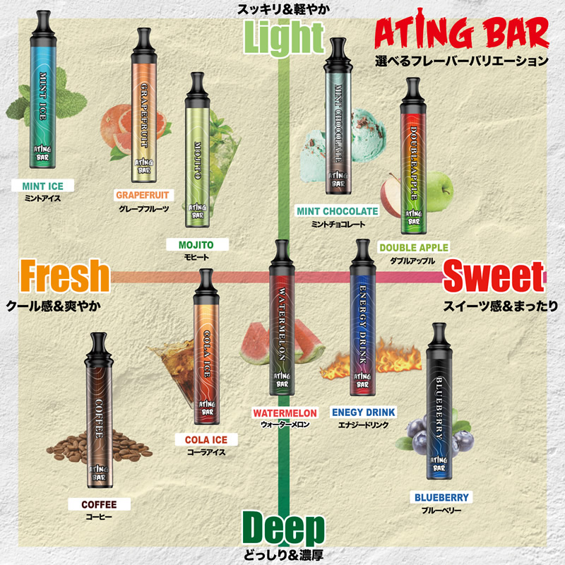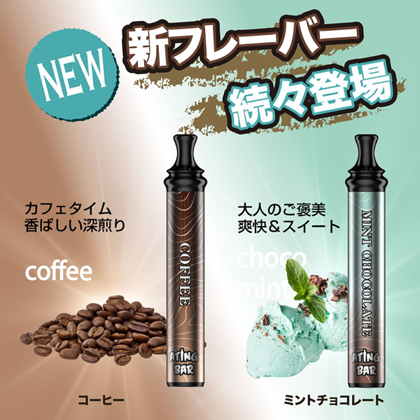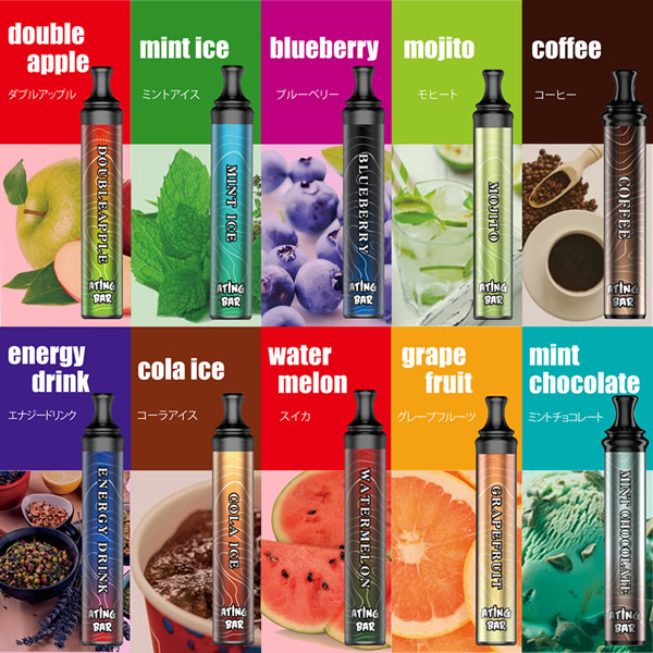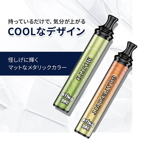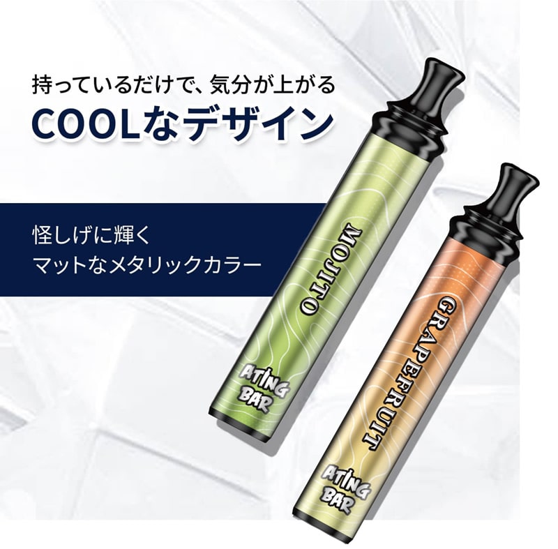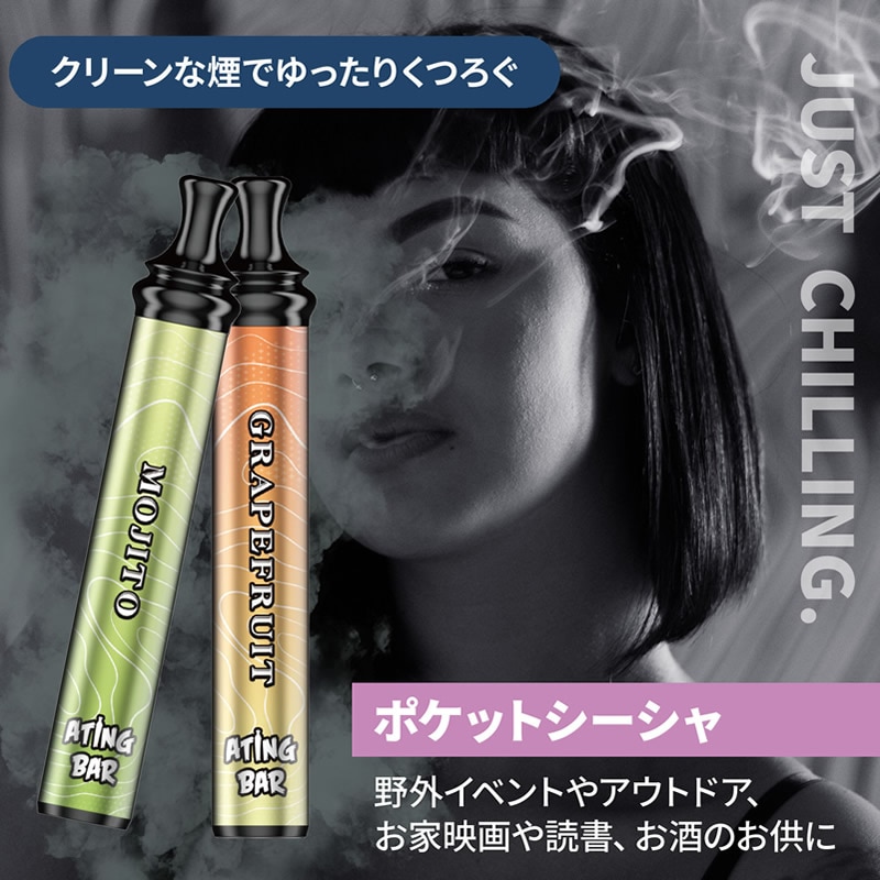 【商品詳細】 商品名: ATING BAR(エイティングバー) スマートシーシャ 商品説明: ニコチン・タール等の有害物質を含まない、使い捨て電子シーシャ。 香り付きリキッドを加熱して発生する水蒸気を吸引し、香りをお楽しみいただけます。 ポケットシーシャは、タバコを吸わない人でも楽しめる新たなリフレッシュ体験です。仕事や勉強の合間のリフレッシュや、アウトドアや野外イベント、お家映画や読書、お酒のお供に。 コンパクトなボディながら、1本あたり最大1800回の吸引が可能。抜群のコストパフォーマンスで、長く楽しむことができます。 シーシャのように吸いごたえがあり、煙がたっぷりと出る仕様です。 シリコンキャップを外して吸うだけの簡単起動で、面倒な準備や片付けはありません。 先端が細く丸い形のマウスピースで、シーシャと同じような吸い心地を実現しています。フラットで大きなマウスピースと比べ、吸いやすさ・デザイン性ともに優れています。 また、両端をシリコンキャップでしっかりと密閉するため、リキッドの蒸発を防止し、長く楽しむことができます。 フレーバー: ブルーベリー エナジードリンク ミントアイス ウォーターメロン ダブルアップル コーラアイス グレープフルーツ モヒート コーヒー ミントチョコレート リキッド成分: 植物性グリセリン、プロピレングリコール、香料 仕様: 使用回数(目安) 最大1,800回吸引(目安であり吸引回数は吸う時間の長さと強さによって個人差が生じます。) 製品構成 リチウムイオンバッテリー、リキッド バッテリー容量 1000mAh サイズ 11.8×2×2cm 重量 本体約40g 使用方法: 両端のシリコンキャップを外し、マウスピース側(細い方)をくわえて吸います。 吸い終わった後は、リキッドの蒸発を防ぐため、必ず両端のシリコンキャップを装着してください。 使用上の注意: ●ご使用の際は、公共マナーなどを遵守し、周囲に配慮の上ご自身の責任にてご使用ください。 ●直射日光、高温多湿、水濡れ、火気の近く、引火性物質(ガソリン、シンナー、ベンジン、ガス)の近くの場所を避けて、常温で保管・ご使用ください。 ●本製品をご自分で修理、分解、改造しないでください。 ●破損、故障、やけど、感電の原因となりますので、高い場所から落とすなどの強い衝撃や、無理な力を加えないでください。 ●お子様の手の届かない場所に保管してください。小さいお子様が誤飲するおそれがあります。万が一飲み込んだ場合には、ただちに医師の診察を受けてください。 ●本製品を使用中に身体に合わないと感じた場合や気分が悪くなった場合には、ただちに使用を中止し、医師の診察を受けてください。 ●ご使用後は不燃物として廃棄してください。 区分: 雑貨 製造国: 中国 輸入元: 株式会社トランスペクト 注意事項: 当社では複数店舗で在庫を共有しており、システムで在庫調整を行っておりますが、TV放映等による一時的な注文数の増大や、在庫の更新タイミングにより在庫にずれが生じる場合がございます。 在庫更新が間に合わずご注文頂いた商品が欠品となる場合もございます。 欠品が生じた場合や商品の発送が遅れる場合は、改めてご連絡させていただきます。 ご迷惑をお掛けする場合がございますが、あらかじめご了承くださいませ。 広告文責: 株式会社エーウィル 0747-26-5566