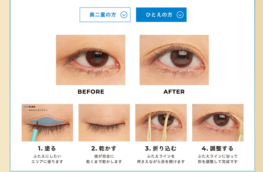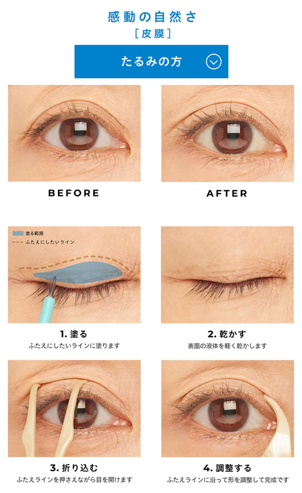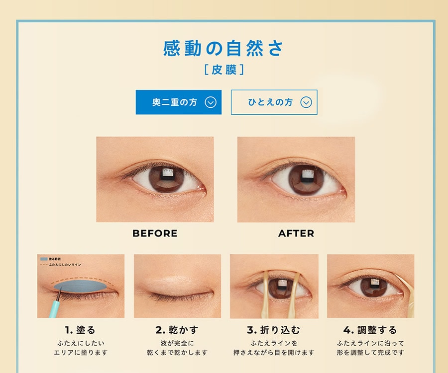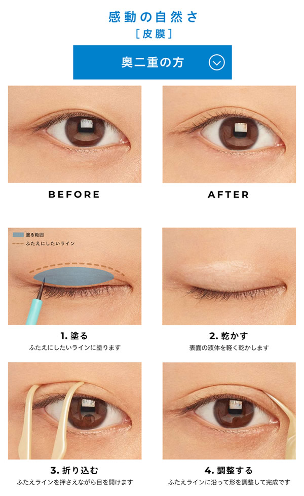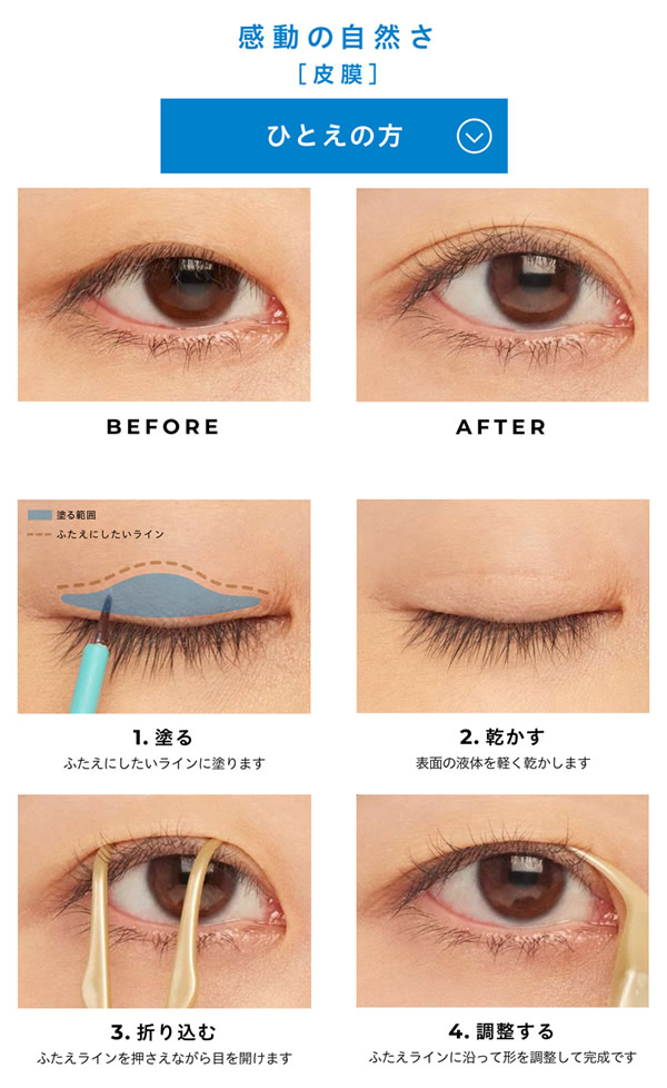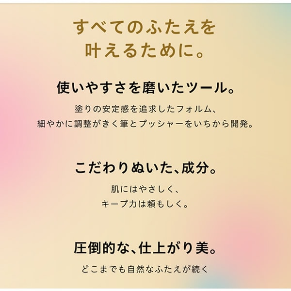 【商品詳細】 商品名: トゥール ダブルアイリッドハイブリットフィルム 商品詳細: 感動の自然さ [皮膜タイプ] 膜を作ってまぶたに折り込むタイプ 薄づきなのにしっかり硬い膜 テカらず肌になじむ ふたえの幅を広げたい方、ひとえの方 今までの皮膜では叶わなかった方にオススメ 内容量: 3ml 全成分: 水、ポリイソプレン、(スチレン/アクリレーツ)コポリマー、ヒアルロン酸Na、加水分解コラーゲン、プラセンタエキス、カフェイン、グラウシン、ツノゲシ葉エキス、ユーグレナエキス、ユズ果実エキス、カンゾウ根エキス、パパイン、デキストリン、グリセリン、BG、カプリリルグリコール、エタノール、ベントナイト、PVP、ラウリル硫酸Na、オレス-15、オレス-50、ヤシ油アルキルグルコシド、水酸化Na、クオタニウム-73、デヒドロ酢酸Na 付属品: 専用プッシャー(材質 ポリプロピレン) 使用方法: ふたえにしたいラインの内側に、まんべんなく液を塗布します。 完全に液が乾いてから、付属のプッシャーでふたえラインの中央あたりを軽く押さえながら、そっと目を開けます。 ※詳しいご使用方法や落とし方は、説明書をお読みください。 ご使用上の注意: ●本来の用途以外には使用しないでください。 ●お肌に異常が生じていないかよく注意して使用してください。お肌に合わないとき即ち次のような場合には、使用を中止してください。そのまま使用を続けますと、症状を悪化させることがありますので、皮フ科専門医などにご相談されることをおすすめします。 (1)使用中、赤味、はれ、かゆみ、刺激、色抜け(白斑など)や黒ずみなどの異常があらわれた場合。 (2)使用したお肌に、直射日光があたって(1)のような異常があらわれた場合。 ●傷やはれもの、しっしんなど、異常のある部位にはお使いにならないでください。 ●目に入らないようご注意ください。目に入った場合は、こすらずにすぐに水またはぬるま湯で洗い流してください。目に異物感が残る場合は、眼科医にご相談ください。 ●ご使用後は、容器の口元をきれいに拭き取り、キャップをしっかりしめてください。容器の口元に液がついたままだと、キャップの中で液が固まり、しまりづらくなったり液漏れしたりする原因になります。 ●衣服などにつくと落ちない場合がありますので、ご注意ください。 ●破損の原因となりますので、落下などの強い衝撃を与えないでください。 ●乳幼児の手の届かないところに保管してください。 ●火気の近くや極端に高温・多湿・低温の場所、温度変化の激しい場所、直射日光のあたる場所を避けて保管してください。 ●製品の特性上、凍結すると使えなくなります。0度以下になる可能性のある場所では、保管しないでください。 ●開封後はできるだけ早めに使いきるようにしてください。 生産国: 日本 区分: 化粧品 メーカー: 粧美堂株式会社 注意事項: 当社では複数店舗で在庫を共有しており、システムで在庫調整を行っておりますが、TV放映等による一時的な注文数の増大や、在庫の更新タイミングにより在庫にずれが生じる場合がございます。 在庫更新が間に合わずご注文頂いた商品が欠品となる場合もございます。 欠品が生じた場合や商品の発送が遅れる場合は、改めてご連絡させていただきます。 ご迷惑をお掛けする場合がございますが、あらかじめご了承くださいませ。 広告文責: 株式会社エーウィル 0747-26-5566