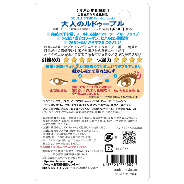 【商品詳細】 商品名: 大人のルドゥーブル 内容量: 2ml 全成分: ゴムラテックス(スチレン/アクリレーツ)コポリマー、水、コラーゲン、ヒアルロン酸Na、PG、グリチルリチン酸アンモニウム、エタノールアミン、アンモニア水、赤227、エチルパラベン、プロピルパラベン、クオタニウム-73 使用上の注意: ●使用感・仕上がりには個人差があります。 ●説明書をよく読んでからご使用ください。 ●ゴムラテックスにアレルギーをお持ちの方は使用しないでください。 ●製品の性質上0℃以下で保管すると凍結し、成分が分離して使用できなくなります。 ●直射日光の当たる場所、温度変化の激しい場所を避け、10℃~25℃位の冷暗所に立てて保管してください。 ●お肌に異常が生じていないかよく注意してご使用ください。 ●お肌に合わないときはご使用をおやめください。 ●開封後は1か月以内にご使用ください。 ●パッチテスト済(但し、全ての方にアレルギーが起こらないわけではありません。) 製造国: 日本 区分: 化粧品 メーカー: 株式会社アチーブ 注意事項: 当社では複数店舗で在庫を共有しており、システムで在庫調整を行っておりますが、TV放映等による一時的な注文数の増大や、在庫の更新タイミングにより在庫にずれが生じる場合がございます。 在庫更新が間に合わずご注文頂いた商品が欠品となる場合もございます。 欠品が生じた場合や商品の発送が遅れる場合は、改めてご連絡させていただきます。 ご迷惑をお掛けする場合がございますが、あらかじめご了承くださいませ。 広告文責: 株式会社エーウィル 0747-26-5566
