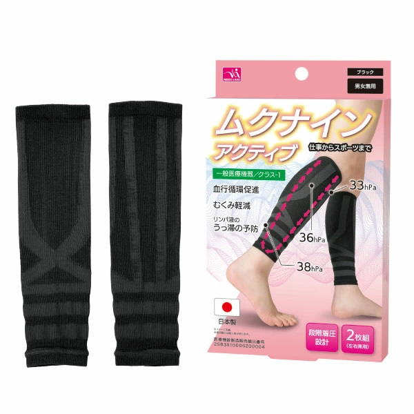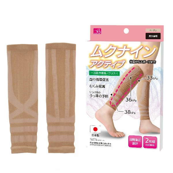【商品詳細】 商品名: 一般医療機器サポーター ムクナインアクティブ 商品説明: 人体工学に基づいた段階着圧でむくみを軽減。 足首を360°ぎゅっと包み込むスリーラインは強圧編み。 ふくらはぎを下から支えるバッククロスラインと前方部分のストレートラインは中圧編みです。 人間工学に基づき、段階的に着圧することでリンパ液の流れをサポートし、足の疲れを軽減してくれます。 効果効能 ・血行循環促進・むくみ軽減・リンパ液のうっ滞の予防 カラー: ブラック ベージュ サイズ: ふくらはぎまわり(約)30~40cmまで 材質: 綿33%・ポリエステル30%・ナイロン17%・アクリル15%・ポリウレタン5% 使用方法: ※装着する際には、爪や指先の荒れ、指輪などで本品を傷つけないよう十分にご注意ください。内側のラインが前側上部になるように着用してください。 1.上下前後を確認して、つま先からはきます。 2.両手で少しずつひざ下まで引き上げます。 3.本品のたるみ、ゆがみを整えてご使用ください。 使用上の注意: ●ご使用後、着圧のあとが脚に残る場合がありますが、しばらくすると元に戻ります。 ●商品の構造上、裏側に糸が出ていますがほつれ等ではございません。 ●部分的に締め付けが強くなるおそれがありますので、着用後はできるだけシワをのばしてください。 ●着圧機能のついた製品との併用は危険ですのでおやめください。 ●最初は短時間の着用から開始して、徐々に着用時間を延ばすようにしてください。 ●使用感には個人差があります。 ●お肌に合わない場合や、かぶれ・かゆみ等を感じた場合、気分が悪くなったり、発疹、痛み等の異常を感じた場合はすぐにご使用を中止してください。 ●現在、病気やけがなどによるむくみやだるさを感じる方、血圧の高い方、心臓・腎臓などに障害のある方、かゆみや発疹を起こしている方、血行障害を起こしたことがある方、その他体に異常を感じる方は本品着用に関して事前に医師にご相談ください。 ●ご使用中、またはご使用後に異常を感じた場合は、すぐにご使用をおやめください。 ●妊娠中の方や妊娠の可能性のある方、また就寝時にご使用する場合は、本品の使用について事前に専門医にご相談ください。 ●サイズが合わない場合は無理に着用しないでください。 ●同じ姿勢を長時間続けると締め付けの強い部分ができてしまいますので、適度な着脱を繰り返してください。 ●生地部分に爪を立て、無理に引っ張ると破れるおそれがあります。着脱の際はご注意ください。 ●水や汗等で湿った状態で強い摩擦を受けると他のものに色移りするおそれがあります。万一色移りした場合は早めに洗濯してください。 ●乳幼児の手の届かない場所に保管してください。 ●火気のそばや高温多湿な場所、直射日光の当たる場所には保管しないでください。 ●本来の目的以外でのご使用はおやめください。 医療機器届出番号: 29B3X10006200004 製造国: 日本 区分: 一般医療機器 販売者: 株式会社ニーズ 注意事項: 当社では複数店舗で在庫を共有しており、システムで在庫調整を行っておりますが、TV放映等による一時的な注文数の増大や、在庫の更新タイミングにより在庫にずれが生じる場合がございます。 在庫更新が間に合わずご注文頂いた商品が欠品となる場合もございます。 欠品が生じた場合や商品の発送が遅れる場合は、改めてご連絡させていただきます。 ご迷惑をお掛けする場合がございますが、あらかじめご了承くださいませ。 広告文責: 株式会社エーウィル 0747-26-5566