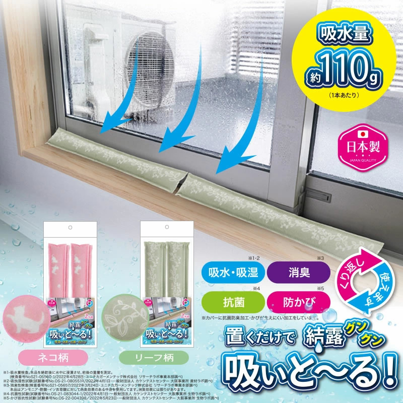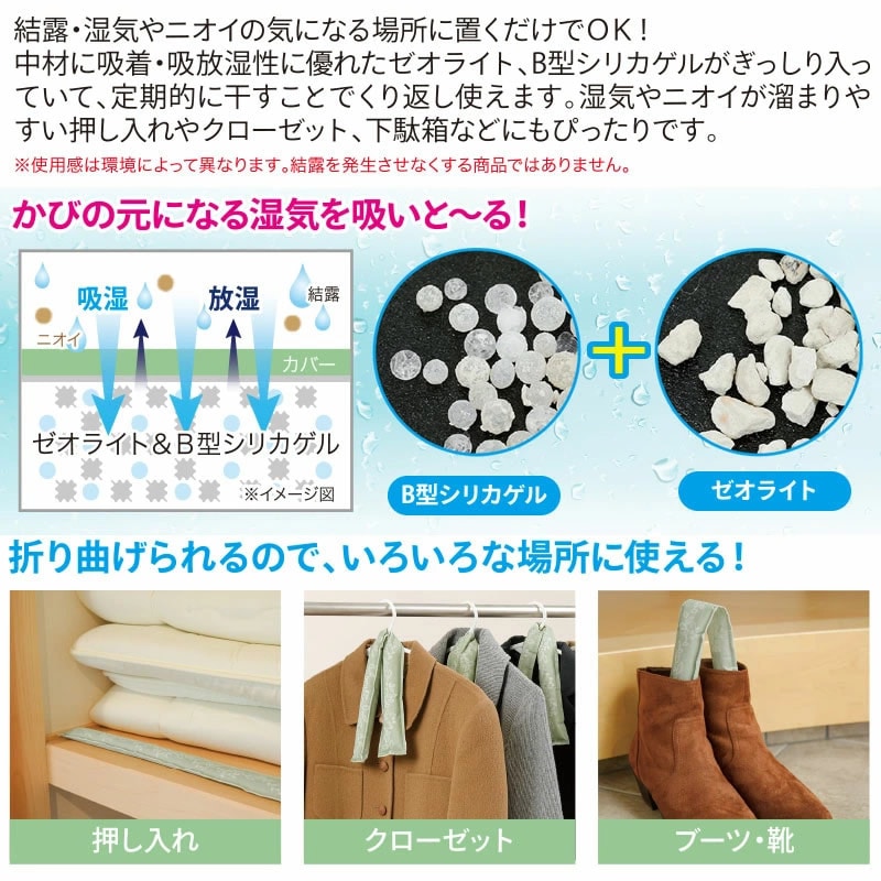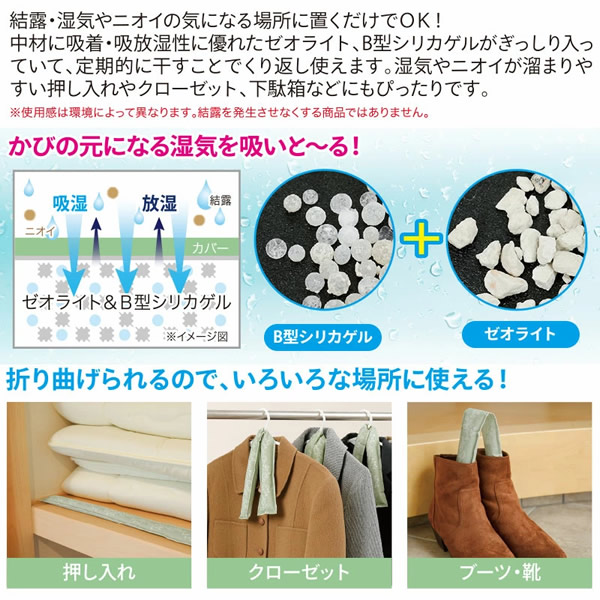 【商品詳細】 商品名: 置くだけ消臭・結露吸いと~る 商品説明: 置くだけで、グングン結露吸いと~る!! ・中材に吸着・吸放湿性に優れたゼオライト、B型シリカゲルがぎっしり入っていて、乾燥させることで繰り返し使えます。 ・湿気の気になる押入れ、クローゼット、シンク下、ブーツなどの履物などにご使用いただけます。 カラー: リーフ柄 ネコ柄 内容量: 2本 材質: カバー(不織布) 複合繊維(ポリエステル/ポリエチレン)100% 中身 ゼオライト、B型シリカゲル 使用方法: 【サッシに使用する場合】 窓枠やサッシなどについている水分、汚れを拭き取り乾いた状態にし、窓をしっかり閉めてから本品を置いてください。窓1枚に対し、本品2本が目安です。幅が合わない場合、本品を折り曲げてご使用ください。 ※吸水量はご使用時の季節や天気、環境によって異なります。 ※折り曲げて使用する際には無理に変形させると破損するおそれがありますのでご注意ください。 【再生方法】 風通しのよい場所で乾燥させることでくり返しご使用いただけます。長期間ご使用していただくために、定期的に乾燥させることをおすすめします。 ※自然乾燥させてください。ドライヤーなどはご使用しないでください。 ※湿度が高い日は再生に時間がかかることがあります。 使用上の注意: ●生地の特性上、柄の出方が多少異なります。 ●火気のそばや高温な場所では使用しないでください。 ●窓の開閉は、必ず本品を取り除いてからおこなってください。本品の破損や落下のおそれがあります。 ●不安定な場所や落下の危険がある場所では、本品の使用をお控えください。破損するおそれがあります。 ●ご使用していくうちに本品の色が変色したり、微粉が発生する場合がありますが、使用上問題ございません。 ●ご使用の際は本品を定期的に風通しのよい場所で乾燥させてください。定期的に乾燥させることで、長期間ご使用いただけます。その際、乾燥機・ストーブ・アイロン・電子レンジなどは使用しないでください。 ●本品の乾燥が不充分な場合、充分な効果が得られない場合があります。 ●本品をねじったり、強く折り曲げ、引っ張ったり、先の尖った物などがあたると破損するおそれがありますのでご注意ください。 ●本品は洗濯できません。 ●破損した場合はご使用を中止し、各自治体の指示に従って処分してください。 ●万一、破れて中身が 【皮膚に付着した場合】直ちに流水で充分に洗い流してください。 【目に入った場合】直ちに水で数分間注意深く洗う。コンタクトレンズが容易に外せる場合は取り外してください。 【吸引した場合】水でうがいをし、口の中をよく洗浄してください。 【飲み込んだ場合】のどに詰まる可能性があります。 いずれの場合も、速やかに医師の診断を受けてください。 ●ペットや乳幼児の手の届かない場所で使用・保管をしてください。 ●濡れた状態で保管すると、カビなどが発生するおそれがあります。よく乾かしてから保管してください。 ●火気のそばや高温多湿な場所、直射日光の当たる場所には保管しないでください。 ●本来の目的以外でのご使用はしないでください。 ●本品の仕様やデザインは予告なく変更する場合があります。 ●印刷の都合上、実際の商品と多少色が異なる場合があります。 製造国: 日本 区分: 雑貨 メーカー: 株式会社ニーズ 注意事項: 当社では複数店舗で在庫を共有しており、システムで在庫調整を行っておりますが、TV放映等による一時的な注文数の増大や、在庫の更新タイミングにより在庫にずれが生じる場合がございます。 在庫更新が間に合わずご注文頂いた商品が欠品となる場合もございます。 欠品が生じた場合や商品の発送が遅れる場合は、改めてご連絡させていただきます。 ご迷惑をお掛けする場合がございますが、あらかじめご了承くださいませ。 広告文責: 株式会社エーウィル 0747-26-5566