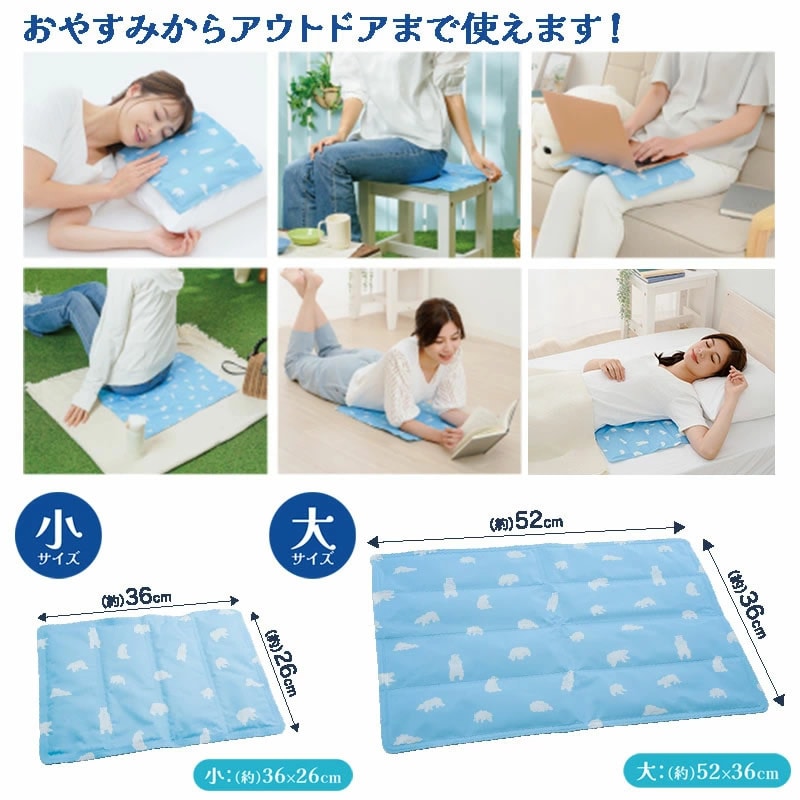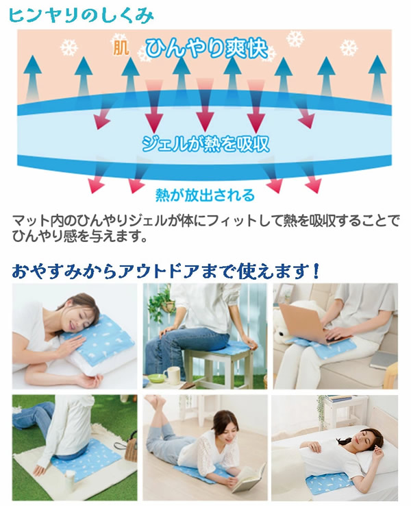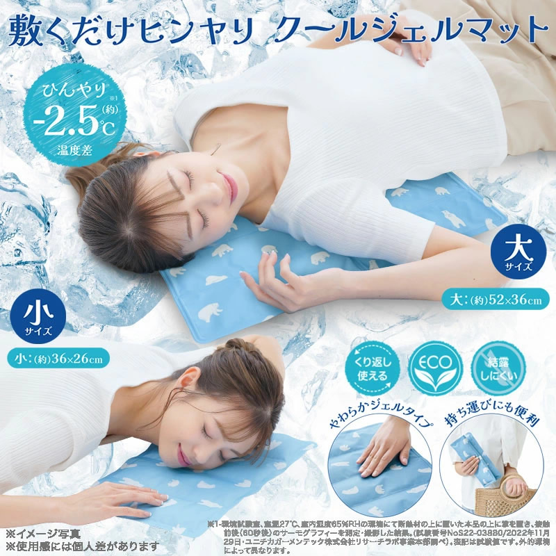 【商品詳細】 商品名: エコクールジェルマット 小サイズ 商品説明: 凍らせないから固くならず冷えすぎない! 体温との温度差でヒンヤリ気持ちいい♪ 敷くだけヒンヤリクールジェルマット。 マット内のひんやりジェルが体にフィットして熱を吸収することでひんやり感を与えます。 繰り返し使えるからEco。 軽量で折りたためるから持ち運びにも便利。 おやすみからアウトドアまで使える! サイズ: D26.0×W36.0×H1.0(cm) 材質: 側地 ポリエステル100% 中材 ポリアクリル酸ナトリウム・グリセリン・防腐剤 使用方法: ※耐荷重:200kg ■ご使用になる前に ●開封時にジェルがかたよっている場合があります。その際は平らな場所にて、手でならしてからご使用ください。開封時は流通過程の温度変化によって、十分に機能を発揮しない場合があります。初めてご使用いただく場合は、冷蔵庫で約15分~20分程度冷やしてからご使用ください。 ●そのままでもご使用いただけますが、冷蔵庫に入れて約15分~20分程度冷やしてからご使用いただくと、より快適にご使用できます。 ※冷蔵庫に入れる際は、商品が他の物に当たってキズや破損の原因となりますのでビニール袋などに入れてください。また周囲に突起物や角がないことを確認の上で入れてください。 ※冷蔵庫で冷やした際に本品表面に結露が発生する場合があります。その際は表面をタオル等で拭いてご使用ください。 ■ご使用に際して ●床やカーペット、敷き布団、ベッド、クッションなどの上に敷いてご使用ください。 ●本品は両面どちらでもご使用できます。同じ位置でくり返しご使用すると、ジェルがかたよることがあります。その際は平らな場所にて、手でならしてからご使用ください。またジェルのかたよりを防ぐために適度に上下の位置を変えてご使用することをおすすめします。気温や室温が高温になっている場合や長時間ご使用になる場合は再度冷蔵庫で冷やしてからご使用ください。 ●冷たすぎると感じる場合は上にタオルなどを敷いてご使用ください。 ●極端に室温の高い場所では十分に本品の機能が発揮されない場合があります。エアコンなどで室温を快適な温度にしてからご使用ください。 使用上の注意: ●本品は医療用ではありません。 ●ジェルは食べられません。万が一、本品のご使用により・かゆみなどの症状が現れた場合はただちにご使用を中止し、医師にご相談ください。 ●冷凍庫には入れないでください。 ●温めてご使用しないでください。オープンや電子レンジで加熱しないでください。 ●火気のそばや高温多温な場所、自動車の中、直射日光の当たる場所には保管しないでください。商品ごとに柄の出方が異なる場合があります。 ●万一、本品が破れた場合は、すぐにご使用をおやめください。中身のジェルが皮膚、衣服、寝具などについた場合は水またはぬるま湯で洗い流してください。万一、目に入った場合は、こすらずにすぐ水道水で洗って、医師にご相談ください。 ●破損の原因になるので、投げる・落とす先のとがった物で突く・切る・歯でかむ・ねじる・強い力で踏む・重い物ををのせるなどの衝撃は与えないでください。 ●汚れた場合は、水またはぬるま湯で手洗いし、かたく絞ったタオルで拭き取ってください。 ●冷感や使用感には個人差があります。 ●満1才未満の乳幼児にはご使用しないでください。 ●意思表示が十分できない幼児や介護が必要な者の方へのご使用の際は付き添いのもと、十分に注意してご使用ください。 ●乳幼児やペットの手の届かない場所に保管してください。 ●本来の目的以外でのご使用はおやめください。 ●廃棄する場合は、各自治体の指示に従って処分してください。 ●本品の仕様やデザインは予告なく変更する場合があります。 ●印刷の都合上、実際の商品と多少色が異なる場合があります。 製造国: 中国 メーカー: 株式会社ニーズ 注意事項: 当社では複数店舗で在庫を共有しており、システムで在庫調整を行っておりますが、TV放映等による一時的な注文数の増大や、在庫の更新タイミングにより在庫にずれが生じる場合がございます。 在庫更新が間に合わずご注文頂いた商品が欠品となる場合もございます。 欠品が生じた場合や商品の発送が遅れる場合は、改めてご連絡させていただきます。 ご迷惑をお掛けする場合がございますが、あらかじめご了承くださいませ。 広告文責: 株式会社エーウィル 0747-26-5566