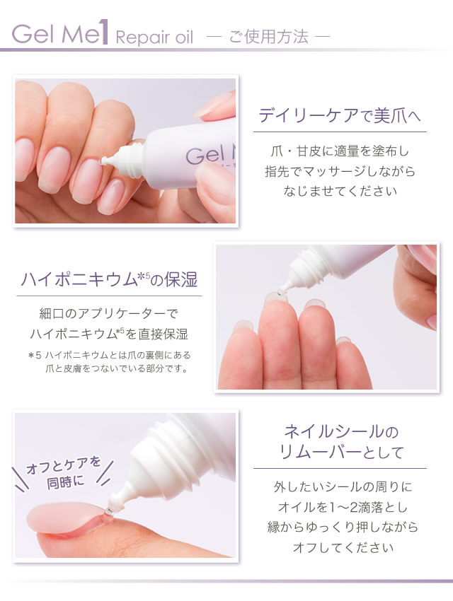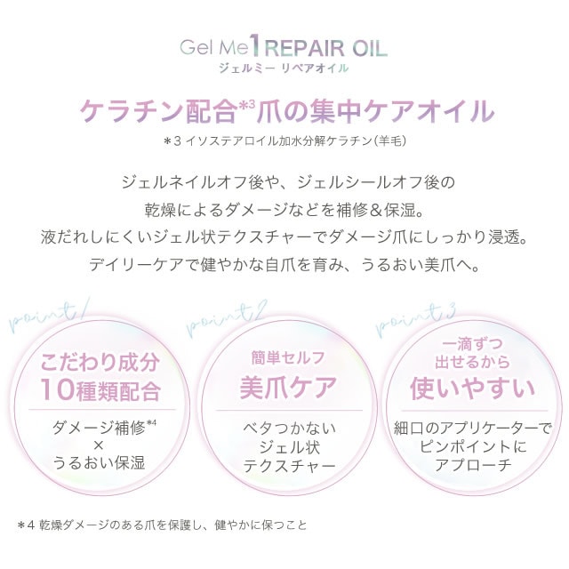 【商品詳細】 商品名: ジェルミー リペアオイル 商品説明: ジェルミーワンから待望のネイルオイル登場! 乾燥ダメージを受けた爪の集中リペアオイル“ジェルミーリペアオイル”が新登場! ジェルネイルオフ後や、ジェルシールオフ後の乾燥によるダメージなどを補修&保湿。 液だれしにくいジェル状テクスチャーでダメージ爪にしっかり浸透。 ジェルミーワンオリジナルブレンドのユーカリ×ラベンダーの爽やかで優しい香り。 内容量: 13ml 成分: イソドデカン、水添ポリデセン、エチルヘキサン酸セチル、水添(スチレン/イソプレン)コポリマー、イソステアロイル加水分解ケラチン(羊毛)、イソステアロイル加水分解シルク、イソステアロイル加水分解コラーゲン、ラウロイルグルタミン酸ジ(フィトステリル/オクチルドデシル)、アルガニアスピノサ核油、マカデミア種子油、コメヌカ油、ホホバ種子油、オリーブ果実油、トコフェロール、イソステアリン酸、イソノナン酸イソノニル、ラベンダー油、ユーカリ油 使用方法: [デイリーケア] 爪・甘皮に適量を塗布し、指先でマッサージしながらなじませてください。 [ネイルシールのリムーバーとして] 外したいシールの周りにオイルを1滴~2滴落とし、縁からゆっくり押しながらオフしてください。 使用上の注意: ●傷・湿疹など、爪やお肌に異常が生じていないかよく注意してご使用ください。 ●お肌に合わないときや使用中、使用後、または直射日光に当たり、かゆみ・腫れ・赤み・刺激・色抜け(白斑等)や黒ずみ等の異常があらわれた場合は直ちにご使用を中止してください。使用を続けますと、症状を悪化させることがありますので皮膚科専門医等へご相談ください。 ●直射日光・高温多湿や極度に寒冷な場所を避け、乳幼児の手の届かないところで保管してください。 ●使用後はしっかりとキャップを閉めてください。 製造国: 中国 区分: 化粧品 メーカー: 株式会社コスメ・デ・ボーテ 注意事項: 当社では複数店舗で在庫を共有しており、システムで在庫調整を行っておりますが、TV放映等による一時的な注文数の増大や、在庫の更新タイミングにより在庫にずれが生じる場合がございます。 在庫更新が間に合わずご注文頂いた商品が欠品となる場合もございます。 欠品が生じた場合や商品の発送が遅れる場合は、改めてご連絡させていただきます。 ご迷惑をお掛けする場合がございますが、あらかじめご了承くださいませ。 広告文責: 株式会社エーウィル 0747-26-5566
