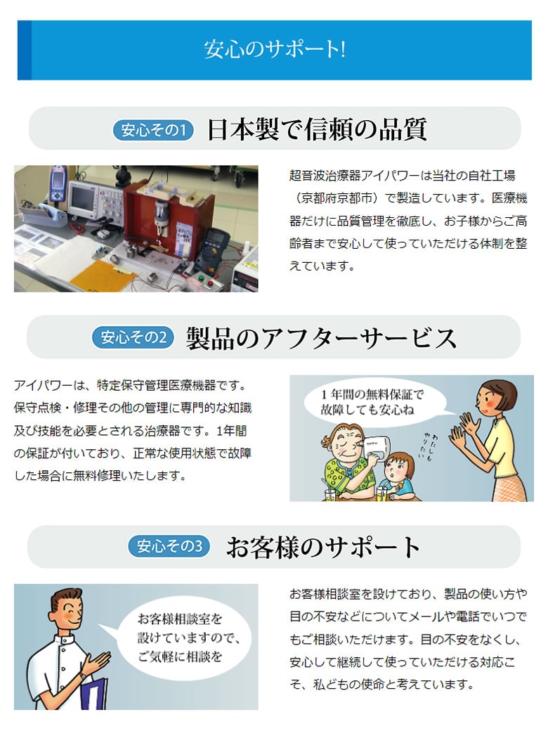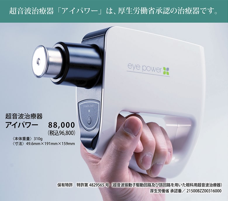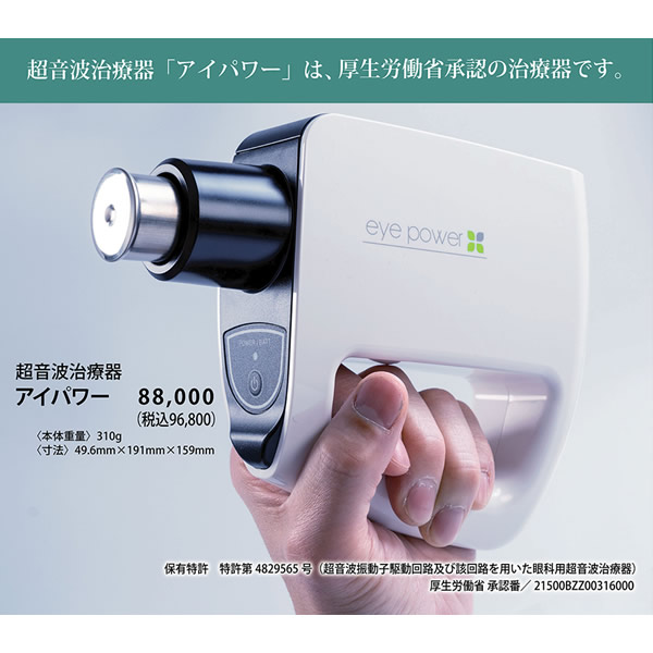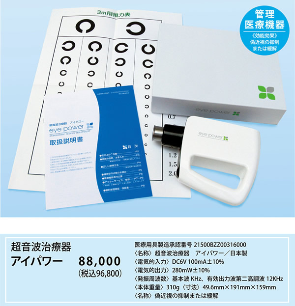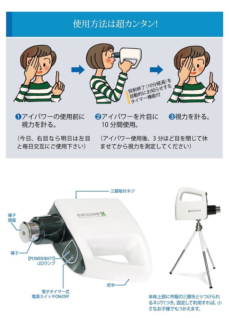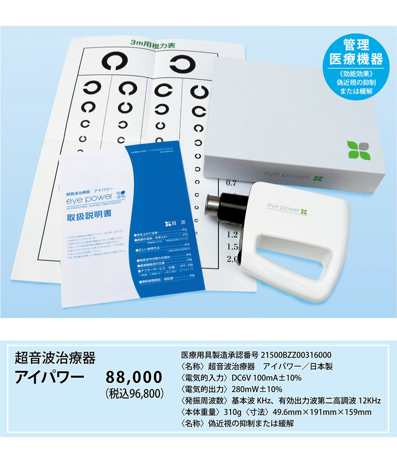 【商品詳細】 販売名: アイパワー 仕様: サイズ (約)50x196.6x147.6mm 重量 (約)280g 電源 単3乾電池4本付 電気的入力 DC6V 100mA ±10% 電気的出力 280mV ±10% 発振周波数 基本波6KHz、有効出力波第二高周波12KHz 効能・効果: 偽近視の抑制または緩解 医療機器承認番号: 21500BZZ00316000 生産国: 日本 区分: 管理医療機器 製造販売業者: 株式会社地球人クラブ 注意事項: 当社では複数店舗で在庫を共有しており、システムで在庫調整を行っておりますが、TV放映等による一時的な注文数の増大や、在庫の更新タイミングにより在庫にずれが生じる場合がございます。 在庫更新が間に合わずご注文頂いた商品が欠品となる場合もございます。 欠品が生じた場合や商品の発送が遅れる場合は、改めてご連絡させていただきます。 ご迷惑をお掛けする場合がございますが、あらかじめご了承くださいませ。 広告文責: 株式会社エーウィル 0747-26-5566