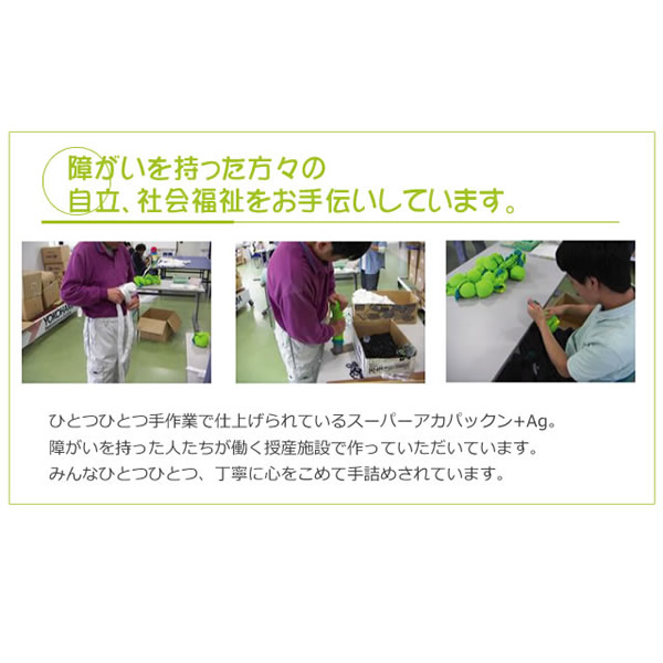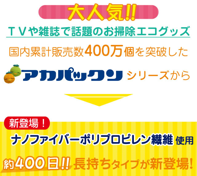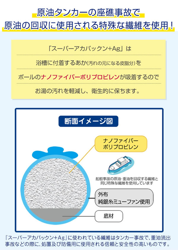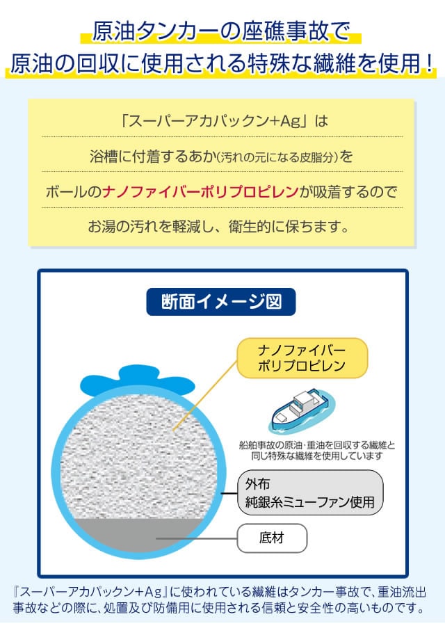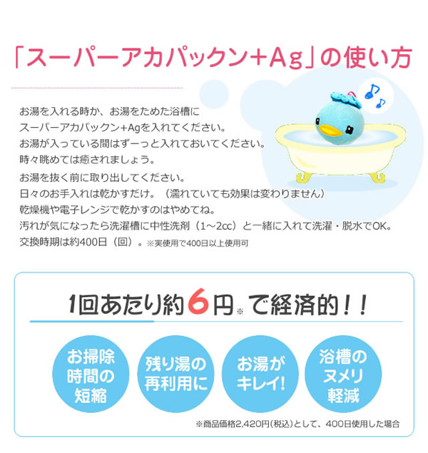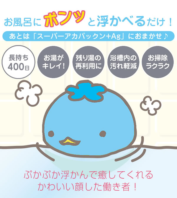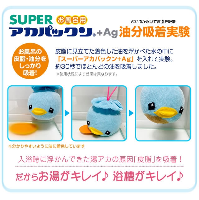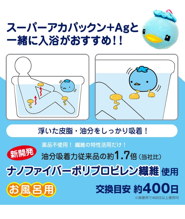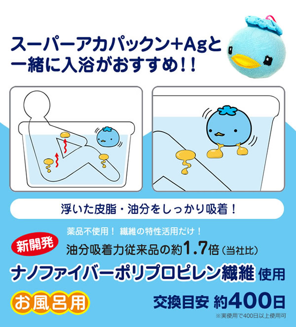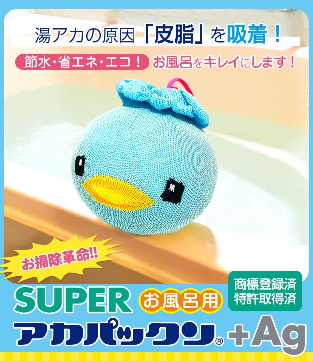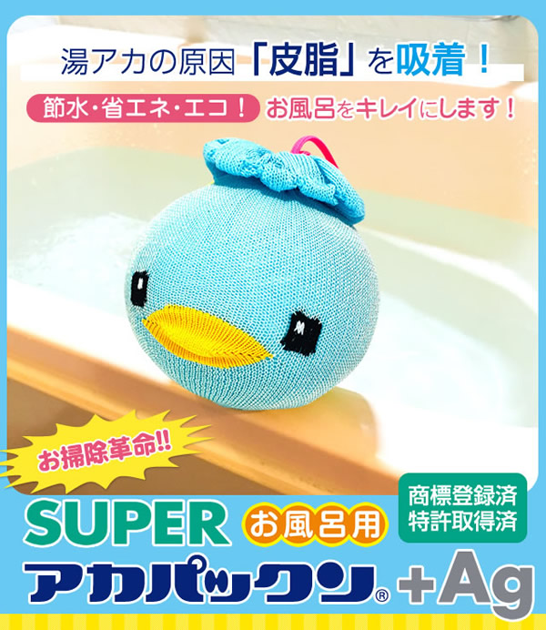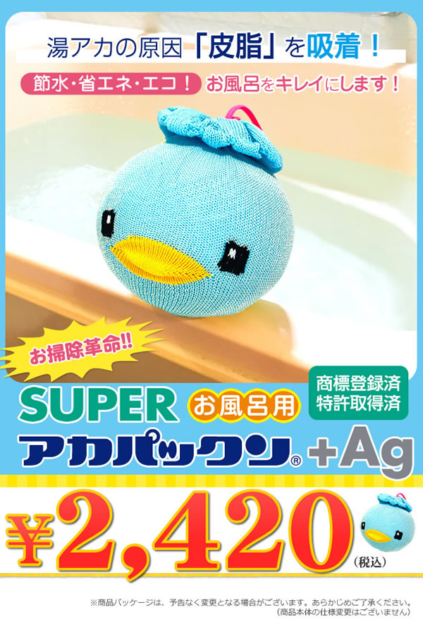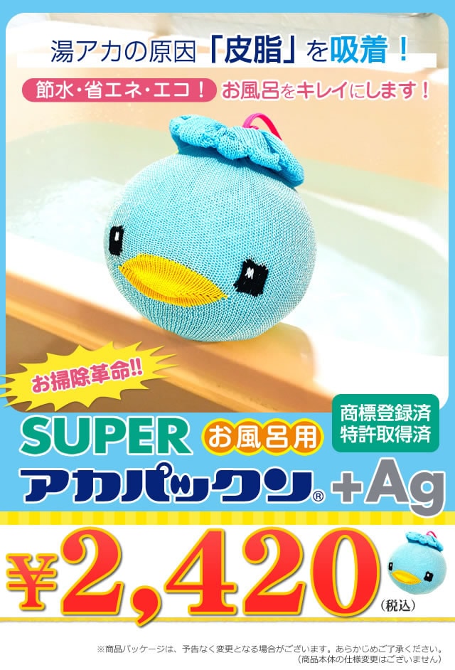 【商品詳細】 商品名: スーパーアカパックン+Ag 商品説明: アカパックンシリーズから長持ちタイプが新登場! 入れるだけで湯アカの原因になる皮脂を取り除き、掃除もサッとひと洗い! ぷかぷか浮かんで癒してくれるかわいい顔した働き者! サイズ: 個装 95×95×H95(mm) 重量: 商品 約85g 個装 約118g 品質表示: ポリプロピレン・ポリエステル・スリット糸ミューファン・その他 使用方法: お湯張り開始後から、湯船に入れて頂けます。 皮脂をより吸着できるように、まんべんなく動かし、できるだけ長くご使用ください。 入浴剤と併用できます。但し、オイル系の入浴剤は適さない場合もあります。 本品を入れたまま入浴して頂けます。お肌に異常がある場合はご使用をおやめください。 使用期間約400日タイプです。使用期限になりましたら、新しい商品と交換してください。 清潔にご使用いただくためのお手入れ方法: 通常のご使用では特別なお手入れは必要ありませんが、毎日ご使用にならない場合は、乾燥した状態で保管して下さい。 天日干しはお避け下さい。 定期的にお洗濯して頂くとよりきれいにご使用いただけます。お洗濯の際は、洗濯用ネットに入れて衣類などと一緒に洗濯できます。 ※衣類用洗剤・柔軟剤と併用できます。乾燥機のご使用はお避けください。 使用上の注意: ●本品のご使用前に、浴槽内をきれいにしてからお使いください。 ●本品はお風呂用です。浴槽内の皮脂吸着を目的とした商品です。用途以外のご使用はしないでください。 ●ご使用前に必ず本品に破損など無い事を確認してからご使用ください。 ●乾燥機・電子レンジ・ドライヤーなどで乾かさないでください。 ●本体から出てきた糸は引っ張らないでください。商品が破損する恐れがありますので、そのままご使用ください。 ●風呂水洗浄剤を使用する際は、必ず本品を取り出してください。破損の原因になります。 ●浴槽内のお湯を抜く際は、本品を必ず取り出してください。 ●指輪やアクセサリー、爪などでの本品ひっかけにご注意ください。 ●お手入れ後など濡れたままでもご使用いただけます。 ●乾かす際は脱水後に陰干ししてください。 ●ご使用の環境により効果には差が出ることがあります。 区分: 雑貨 製造国: 日本 メーカー: 恵川商事株式会社 注意事項: 当社では複数店舗で在庫を共有しており、システムで在庫調整を行っておりますが、TV放映等による一時的な注文数の増大や、在庫の更新タイミングにより在庫にずれが生じる場合がございます。 在庫更新が間に合わずご注文頂いた商品が欠品となる場合もございます。 欠品が生じた場合や商品の発送が遅れる場合は、改めてご連絡させていただきます。 ご迷惑をお掛けする場合がございますが、あらかじめご了承くださいませ。 広告文責: 株式会社エーウィル 0747-26-5566