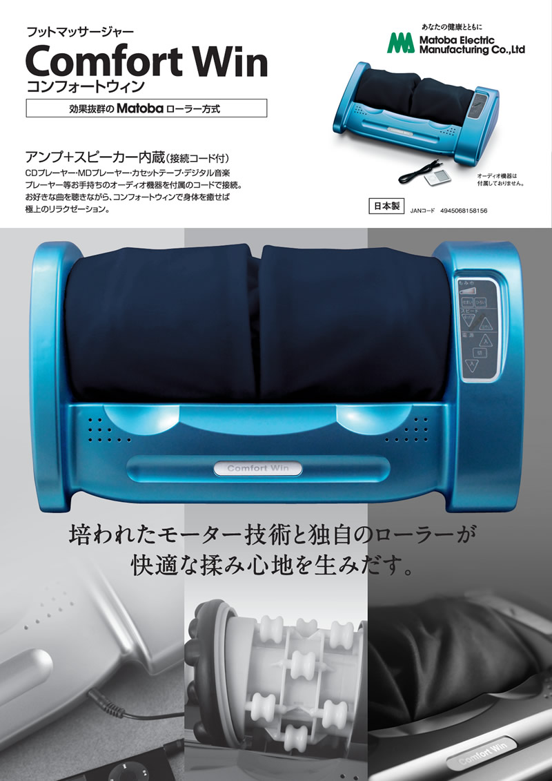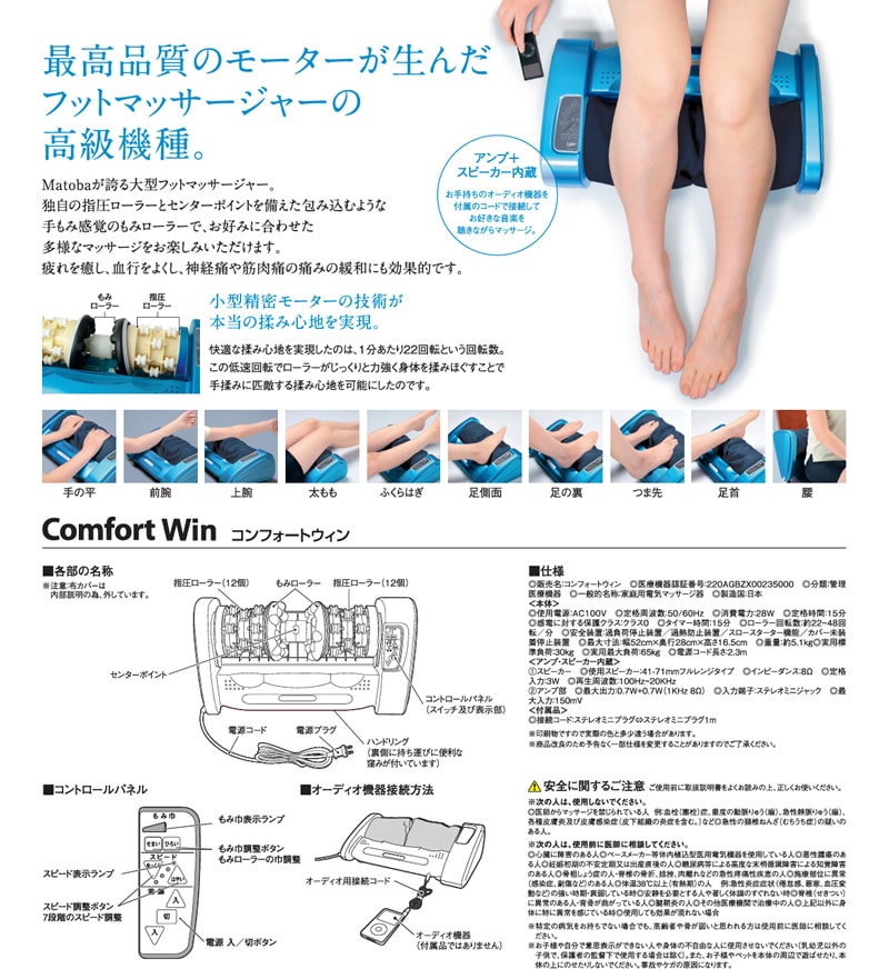 【商品詳細】 販売名: コンフォートウィン 商品説明: 独自の指圧ローラーとセンターポイントを備えた包み込むような手揉み感覚のもみローラーで、お好みに合わせた多様なマッサージをお楽しみいただけます。 疲れを癒し、血行をよくし、神経痛や筋肉痛の痛みの緩和にも効果的です。 お手持ちのオーディオ機器を付属のコードで接続してお好きな音楽を聴きながらマッサージ。 仕様: [本体] 定格電圧 交流100V 定格周波数 50/60Hz 消費電力 (無負荷時)28W 定格時間 15分 感電に対する保護クラス クラス0 タイマー時間 15分 ローラ回転数 約22~48回転/分 安全装置 過負荷停止装置/過熱防止装置/スロースターター機能/カバー未装着停止装置 最大寸法 幅52cm×奥行き28cm×高さ16.5cm 重量 約5.1kg 電源コード長さ 2.3m 実用標準負荷 30kg 実用最大負荷 65kg [スピーカー] 使用スピーカー 40-71mm フルレンジタイプ インピーダンス 8Ω 再生周波数 100Hz~20kHz 定格入力 3W [アンプ部] 最大出力 0.7W+0.7W(1KHz 8Ω) 入力端子 ステレオミニジャック 最大入力 150mV [付属品] 接続コード ステレオミニプラグ ⇔ ステレオミニプラグ 長さ1m 安全に関するご注意: ●ご使用前に取扱説明書をよくお読みの上、正しくお使いください。 ●次の人は、使用しないでください。 ・医師からマッサージを禁じられている人…例:血栓(塞栓)症、重度の動脈りゅう(瘤)、急性静脈りゅう(瘤)各種皮膚炎及び皮膚感染症(皮下組織の炎症を含む。)など ・急性の頚椎のねんざ(むちうち症)の疑いのある人。 ●次の人は、使用前に医師に相談してください。 ・心臓に障害のある人 ・ペースメーカー等体内植込型医用電気機器を使用している人 ・悪性腫瘍のある人 ・妊娠初期の不安定期又は出産直後の人 ・糖尿病等による高度な末梢循環障害による知覚障害のある人 ・骨粗しょう(鬆)症の人・脊椎の骨折、捻挫、肉離れなどの急性疼痛性疾患の人 ・施療部位に異常(感染症、創傷など)のある人 ・体温38℃以上(有熱期)の人…例:急性炎症症状(倦怠感、悪寒、血圧変動など)の強い時期・衰弱している時 ・安静を必要とする人や著しく体調のすぐれない時 ・脊椎(せきつい)に異常のある人・背骨が曲がっている人 ・腱鞘炎の人 ・その他、医療機関で治療中の人 ・上記以外に身体に特に異常を感じている時 ・使用しても効果が現れない場合 ●特定の病気をお持ちでない場合でも、高齢者や骨が弱いと思われる方は使用前に医師に相談してください。 ●お子様や自分で意思表示ができない人や、身体の不自由な人に使用させないでください。(乳幼児以外の子供で、保護者の監督下で使用する場合は除く)また、お子様やペットを本体の周辺で遊ばせたり、本体の上にのせたりしないでください。事故やケガの原因になります。 ●重大な健康被害や感電・故障の原因となります。 ・布カバーなし、あるいは破れた状態では、危険ですので絶対に使用しないでください。 ・布カバーは消耗品です。布カバーが破れた時はご自分で交換せず、必ずメーカーに交換をご依頼ください。メーカーにて専用品に交換致します。(有償) ●ご自分では絶対に布カバーを取り外さないでください。 医療機器承認番号: 220AGBZX00235000 製造国: 日本 区分: 管理医療機器 製造販売業者: 株式会社的場電機製作所 注意事項: 当社では複数店舗で在庫を共有しており、システムで在庫調整を行っておりますが、TV放映等による一時的な注文数の増大や、在庫の更新タイミングにより在庫にずれが生じる場合がございます。 在庫更新が間に合わずご注文頂いた商品が欠品となる場合もございます。 欠品が生じた場合や商品の発送が遅れる場合は、改めてご連絡させていただきます。 ご迷惑をお掛けする場合がございますが、あらかじめご了承くださいませ。 広告文責: 株式会社エーウィル 0747-26-5566 様々な贈り物にご利用いただけます