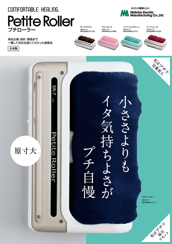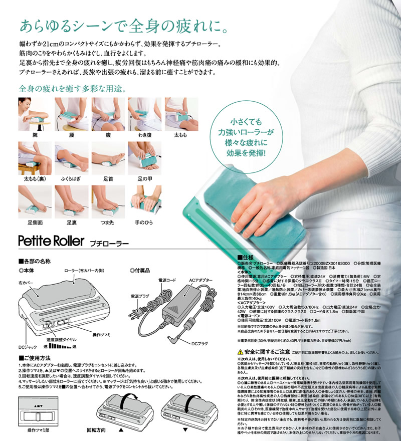 【商品詳細】 販売名: プチローラー 商品説明: 女性が片手で持てる軽量サイズ。 ご自宅や出張先、旅行先にも持ち運びラクラク。 忙好きな時に満足ゆくまでマッサージをすることが出来ます。 3種類・計24個のもみ玉が「毎分35回転(超低速)」でゆっくり動きます。 手揉みに近い押しと強さを再現。 手のひらや指などには全身に関するつぼが集中しており人間の身体の全てが投影されています。 プチローラーならではの小さなローラーが手のひらなどあらゆるつぼを刺激します。 カラー: ネイビーブルー ダークブラウン ペパーミントグリーン ベビーピンク アーバンレッド 仕様: [本体] 使用電源 専用ACアダプター 定格電圧 直流24V 消費電力 (無負荷時)6W 定格時間 15分 感電に対する保護クラス クラス タイマー時間 15分 指圧ローラ回転数 約35~40回転/分 指圧ローラ形状・総数 3種類・合計24個 安全装置 過負荷停止装置/過熱防止装置/カバー未装着停止装置 最大寸法 幅21cm×奥行き14cm×高さ8cm 重量 約1.5kg(ACアダプターを含む) 実用標準負荷 20kg 実用最大負荷 40kg [ACアダプター] 入力電圧 交流100V 入力周波数 50/60Hz 出力電圧 直流24V 定格出力 42W 感電に対する保護のクラス クラス コード長さ1.8m 製造国 中国 [電源コード] 使用可能電圧 交流100V 電源コード長さ 1.8m 安全に関するご注意: ●ご使用前に取扱説明書をよくお読みの上、正しくお使いください。 ●次の人は、使用しないでください。 ・医師からマッサージを禁じられている人…例:血栓(塞栓)症、重度の動脈りゅう(瘤)、急性静脈りゅう(瘤)各種皮膚炎及び皮膚感染症(皮下組織の炎症を含む。)など ・急性の頚椎のねんざ(むちうち症)の疑いのある人。 ●次の人は、使用前に医師に相談してください。 ・心臓に障害のある人 ・ペースメーカー等体内植込型医用電気機器を使用している人 ・悪性腫瘍のある人 ・妊娠初期の不安定期又は出産直後の人 ・糖尿病等による高度な末梢循環障害による知覚障害のある人 ・骨粗しょう(鬆)症の人・脊椎の骨折、捻挫、肉離れなどの急性疼痛性疾患の人 ・施療部位に異常(感染症、創傷など)のある人 ・体温38℃以上(有熱期)の人…例:急性炎症症状(倦怠感、悪寒、血圧変動など)の強い時期・衰弱している時 ・安静を必要とする人や著しく体調のすぐれない時 ・脊椎(せきつい)に異常のある人・背骨が曲がっている人 ・腱鞘炎の人 ・その他、医療機関で治療中の人 ・上記以外に身体に特に異常を感じている時 ・使用しても効果が現れない場合 ●特定の病気をお持ちでない場合でも、高齢者や骨が弱いと思われる方は使用前に医師に相談してください。 ●お子様や自分で意思表示ができない人や、身体の不自由な人に使用させないでください。また、お子様やペットを本体の周辺で遊ばせたり、本体の上にのせたりしないでください。事故やケガの原因になります。 ●重大な健康被害や感電・故障の原因となります。 ・布カバーなし、あるいは破れた状態では、危険ですので絶対に使用しないでください。 ・布カバーは消耗品です。布カバーが破れた時はご自分で交換せず、必ずメーカーに交換をご依頼ください。メーカーにて専用品に交換致します。(有償) ●ご自分では絶対に布カバーを取り外さないでください。 医療機器承認番号: 22000BZX00163000 製造国: 日本 区分: 管理医療機器 製造販売業者: 株式会社的場電機製作所 注意事項: 当社では複数店舗で在庫を共有しており、システムで在庫調整を行っておりますが、TV放映等による一時的な注文数の増大や、在庫の更新タイミングにより在庫にずれが生じる場合がございます。 在庫更新が間に合わずご注文頂いた商品が欠品となる場合もございます。 欠品が生じた場合や商品の発送が遅れる場合は、改めてご連絡させていただきます。 ご迷惑をお掛けする場合がございますが、あらかじめご了承くださいませ。 広告文責: 株式会社エーウィル 0747-26-5566 様々な贈り物にご利用いただけます